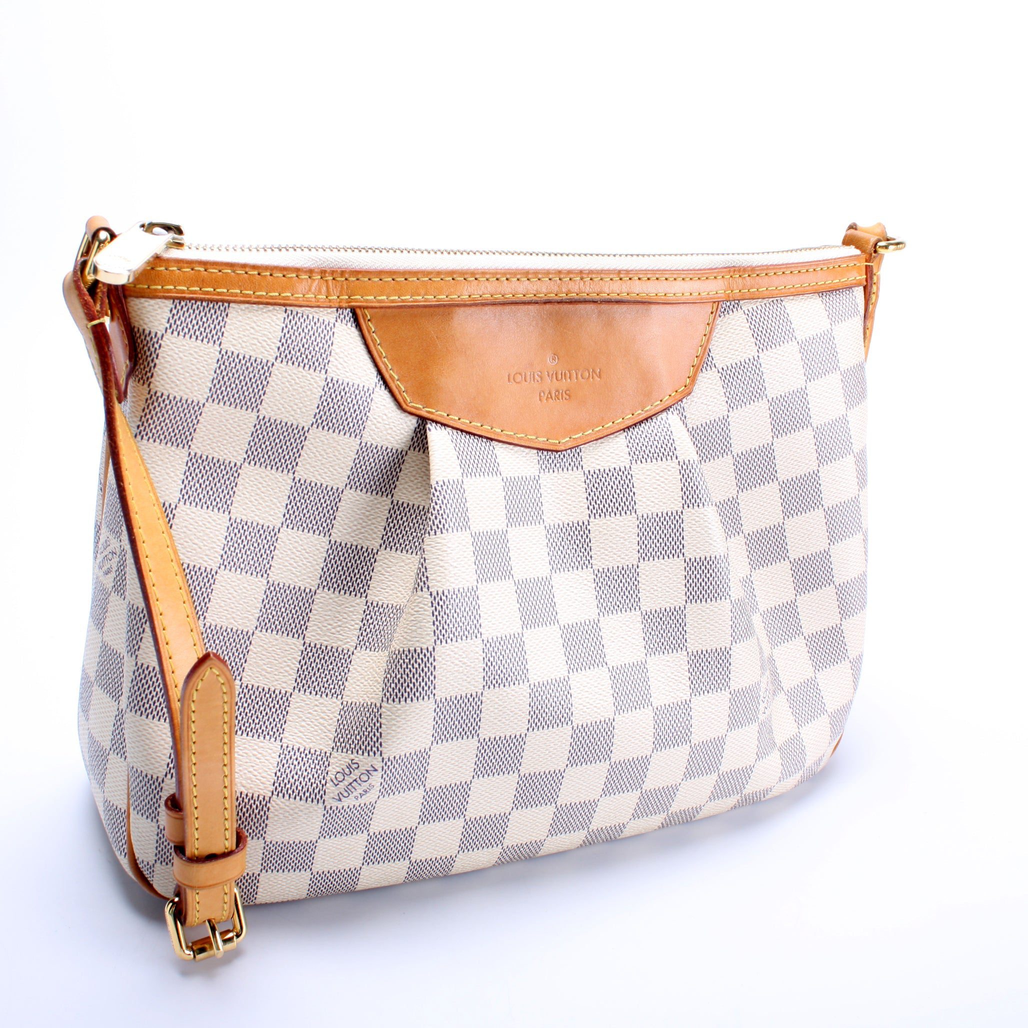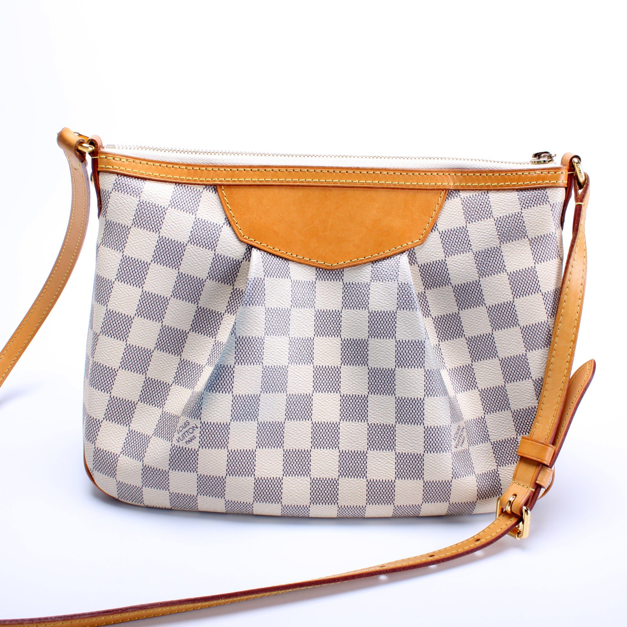 Louis Vuitton Siracusa PM�. The exterior is in the classic Louis Vuitton Damier Azur coated canvas.