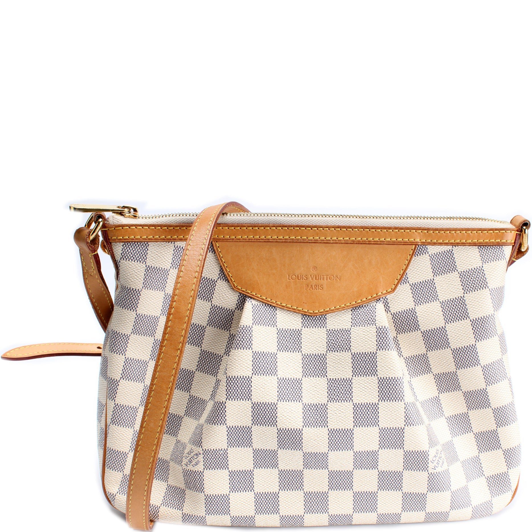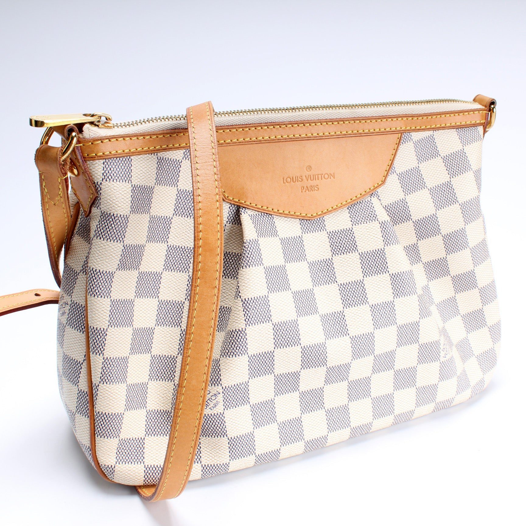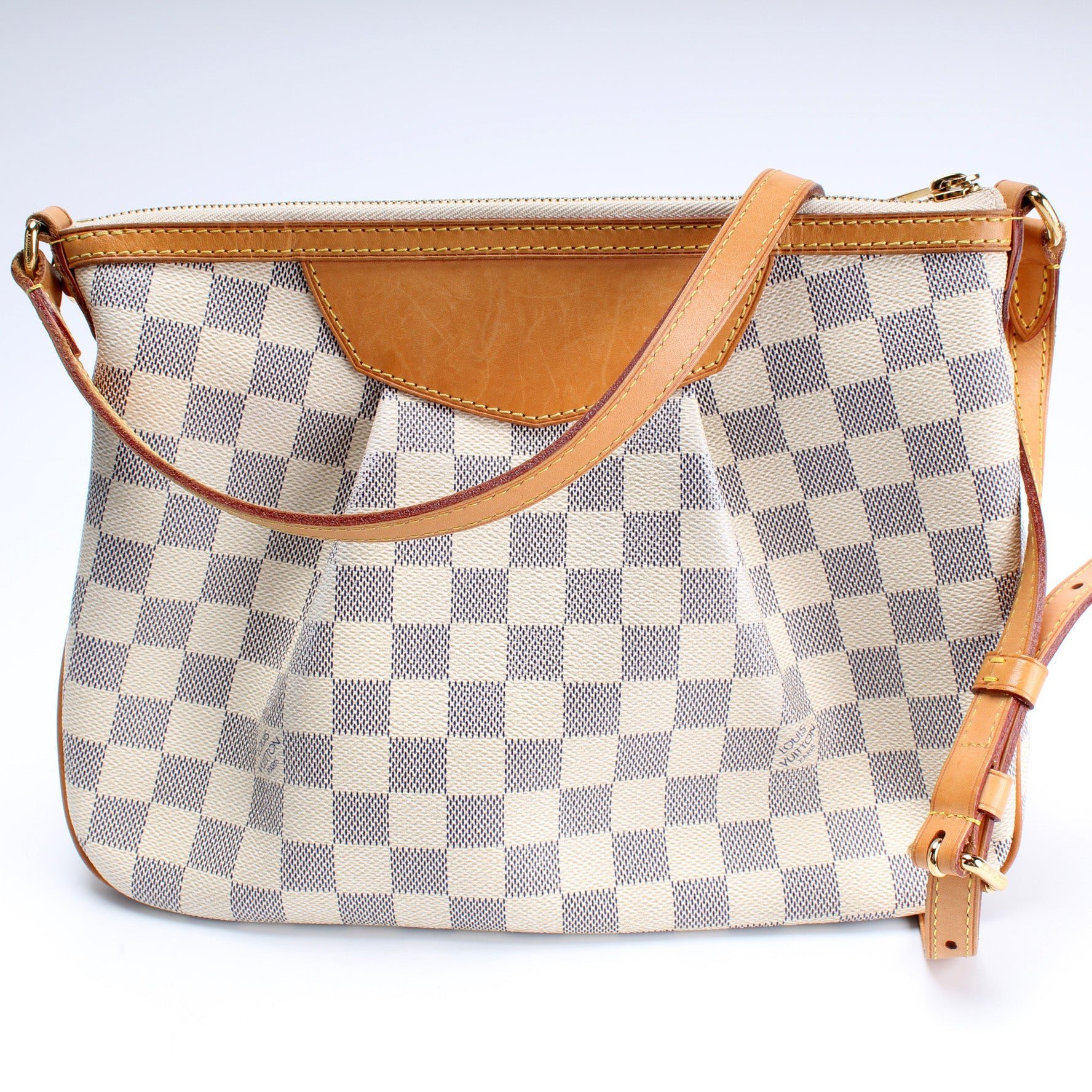 Louis Vuitton Siracusa PM�. The exterior is in the classic Louis Vuitton Damier Azur coated canvas.