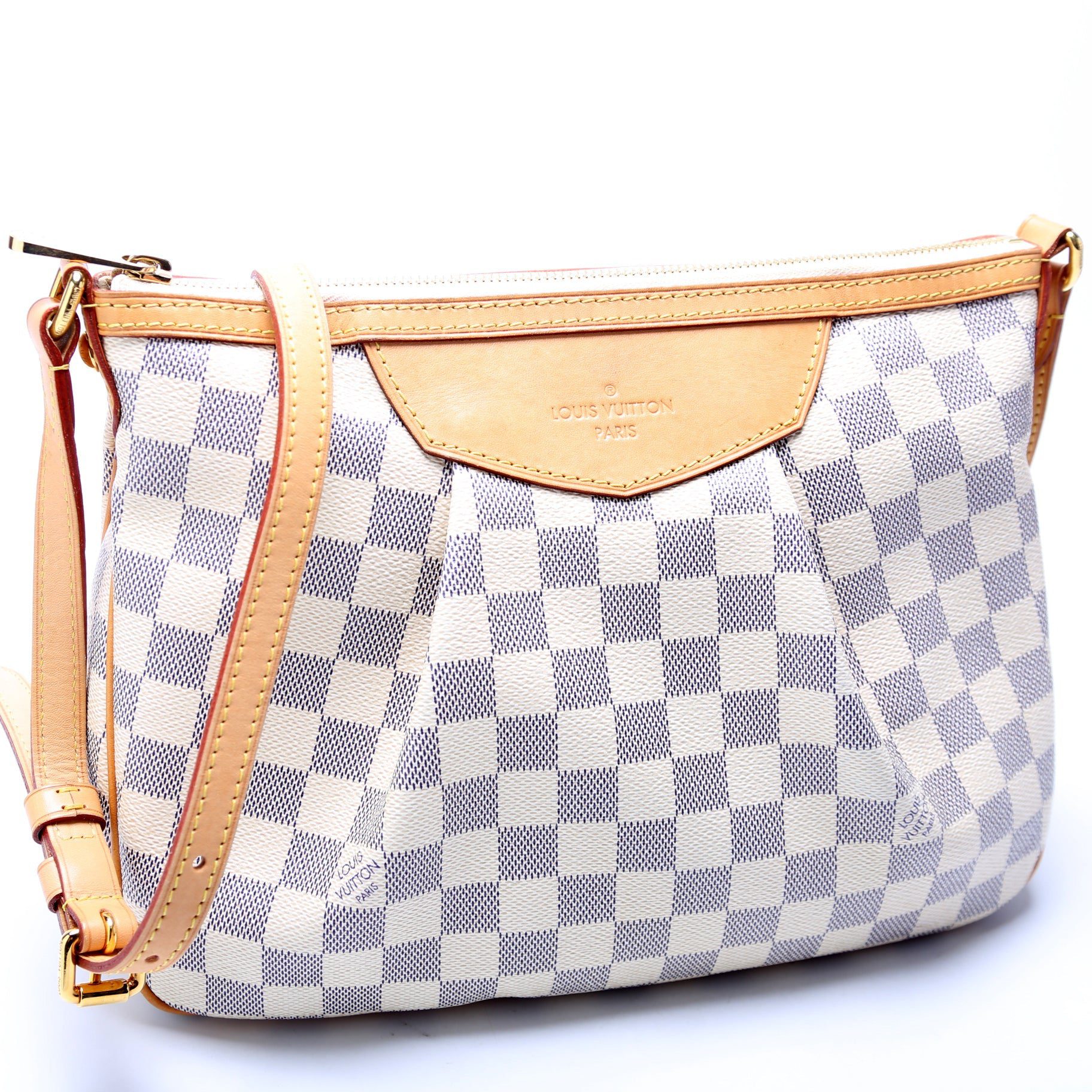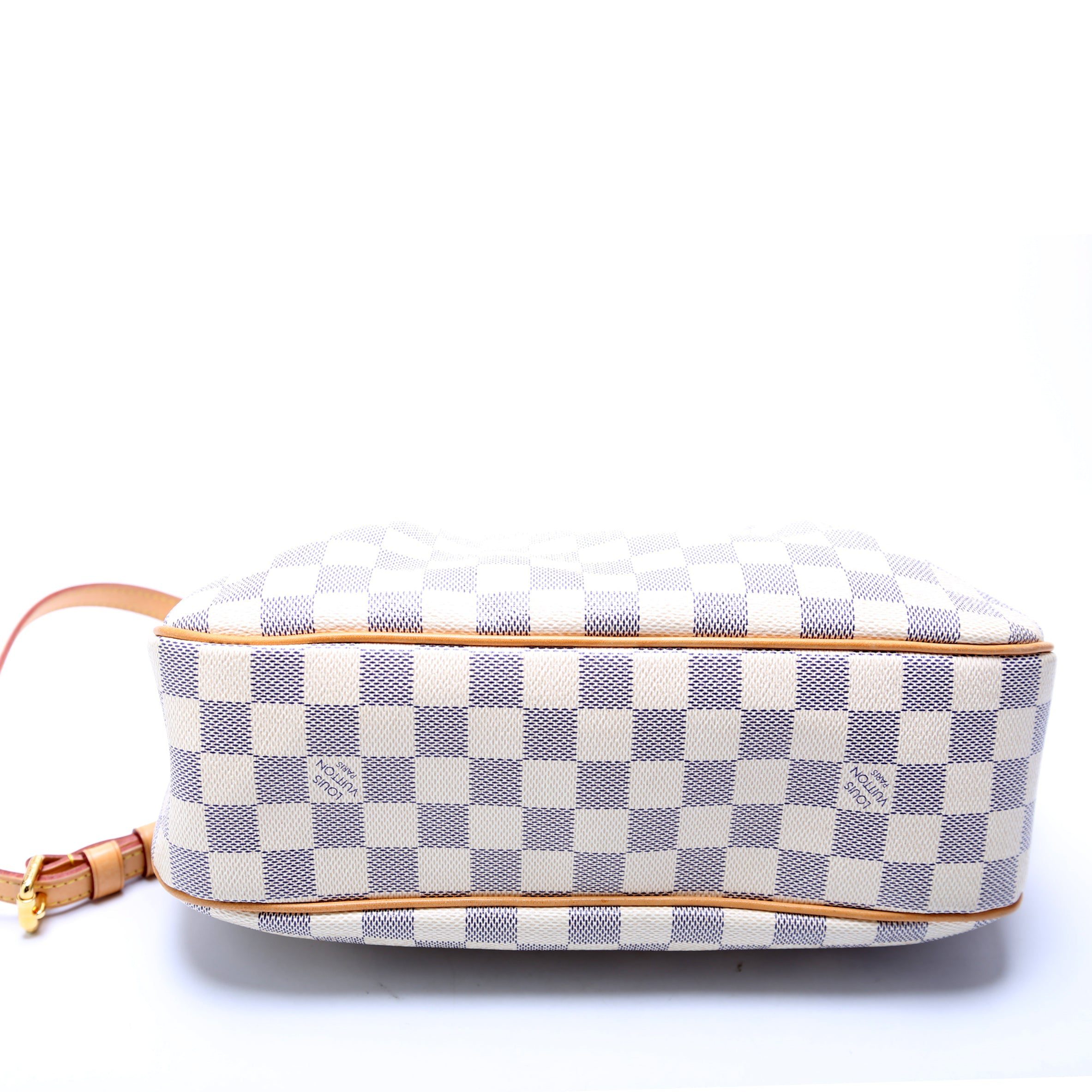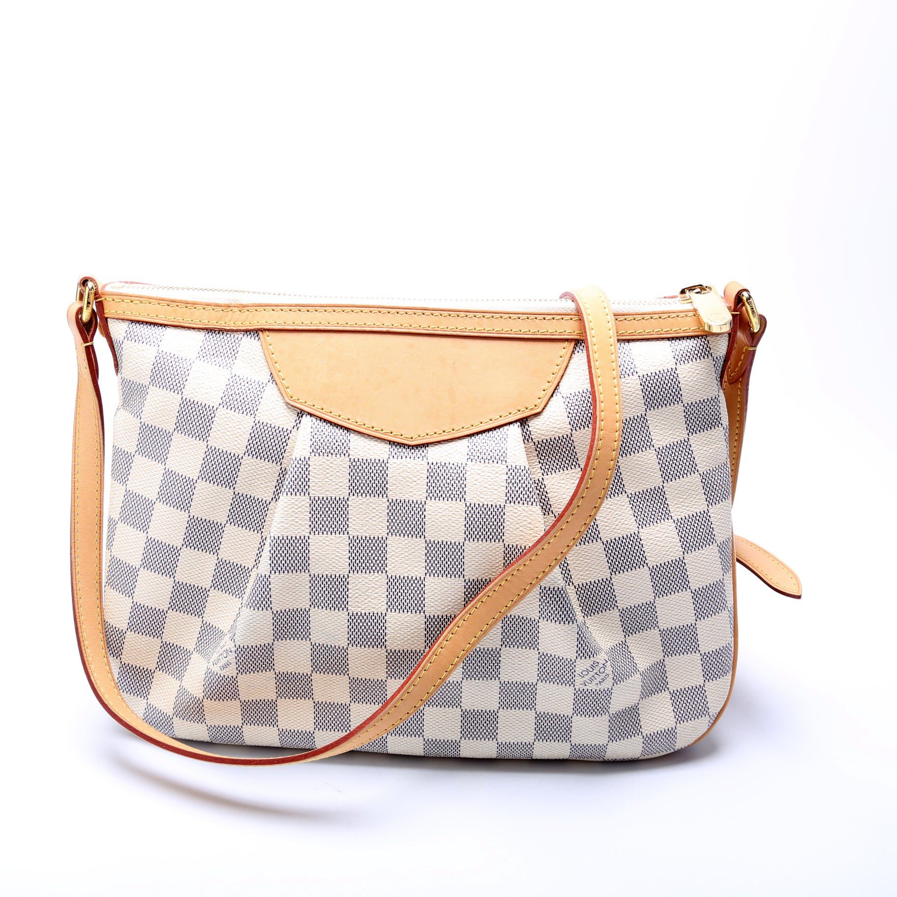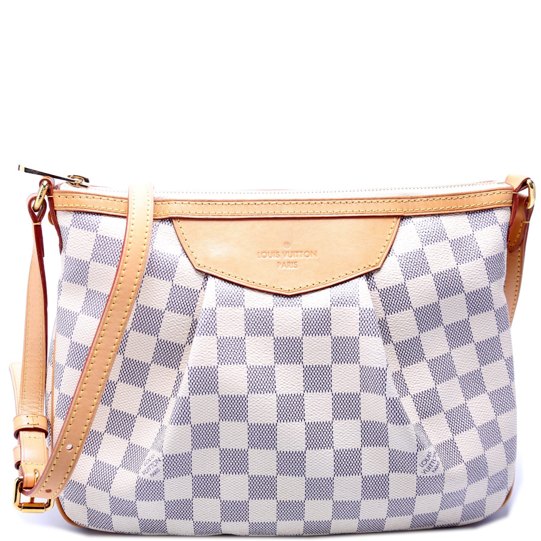 T Louis Vuitton Siracusa PM. The exterior is in the classic Damier Azur print.Â