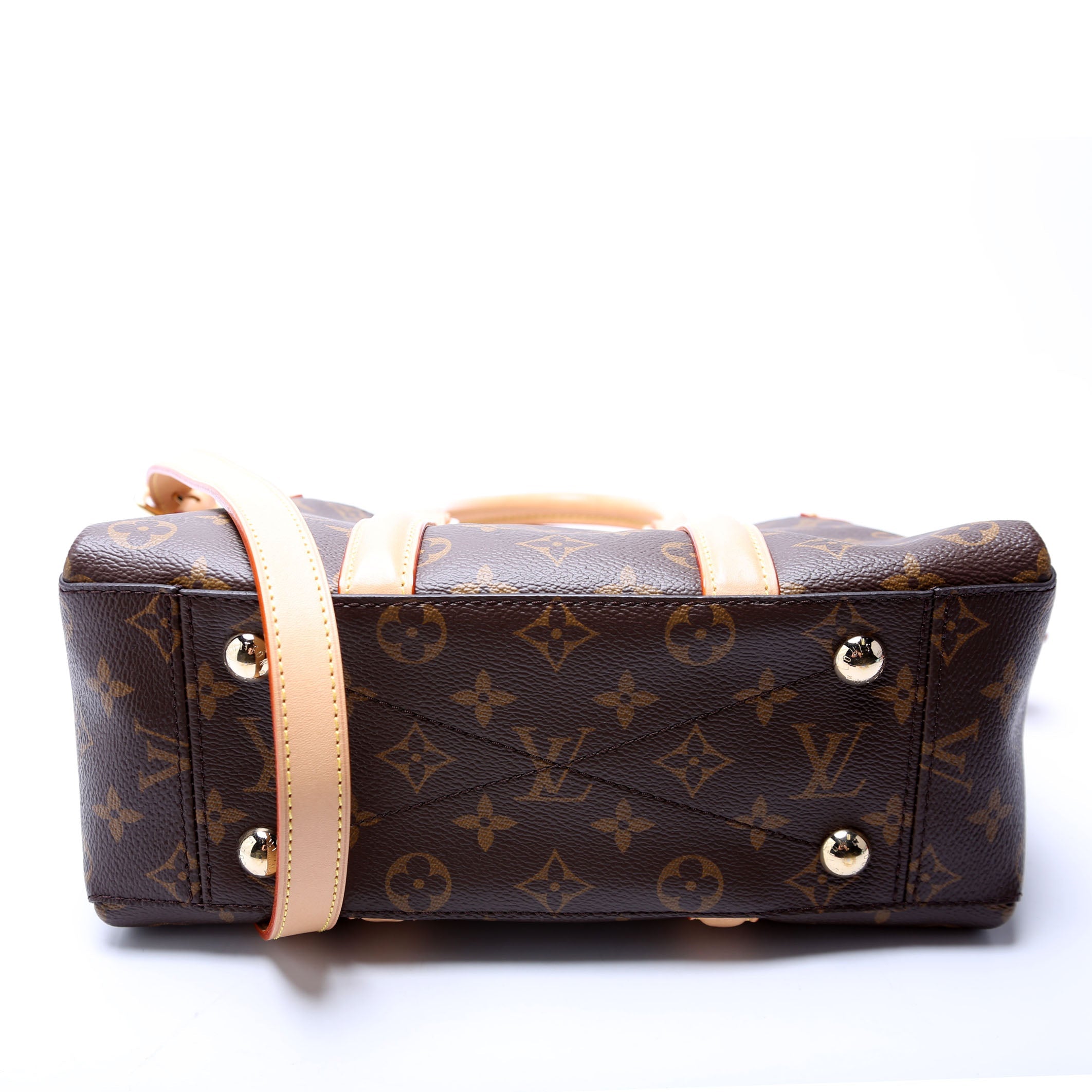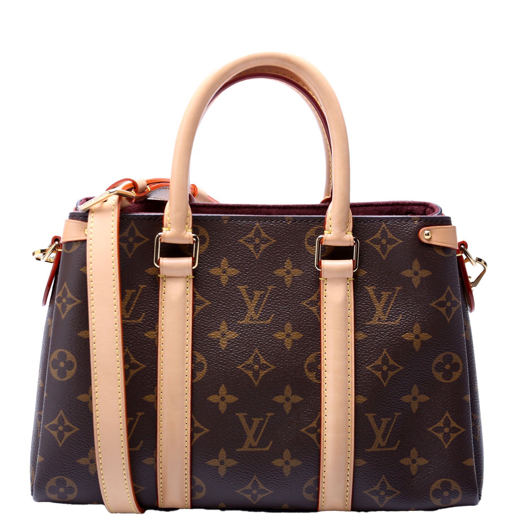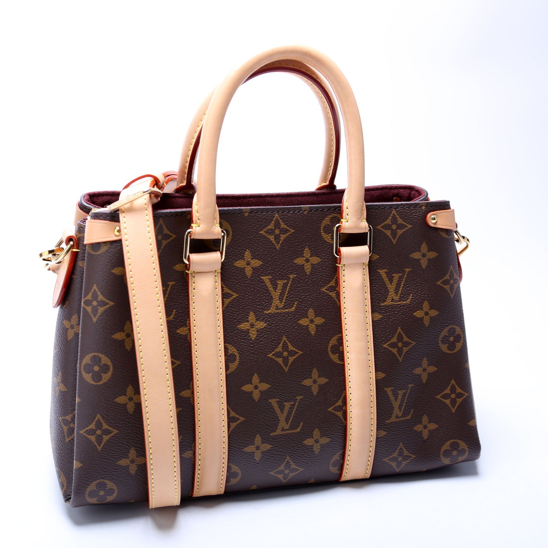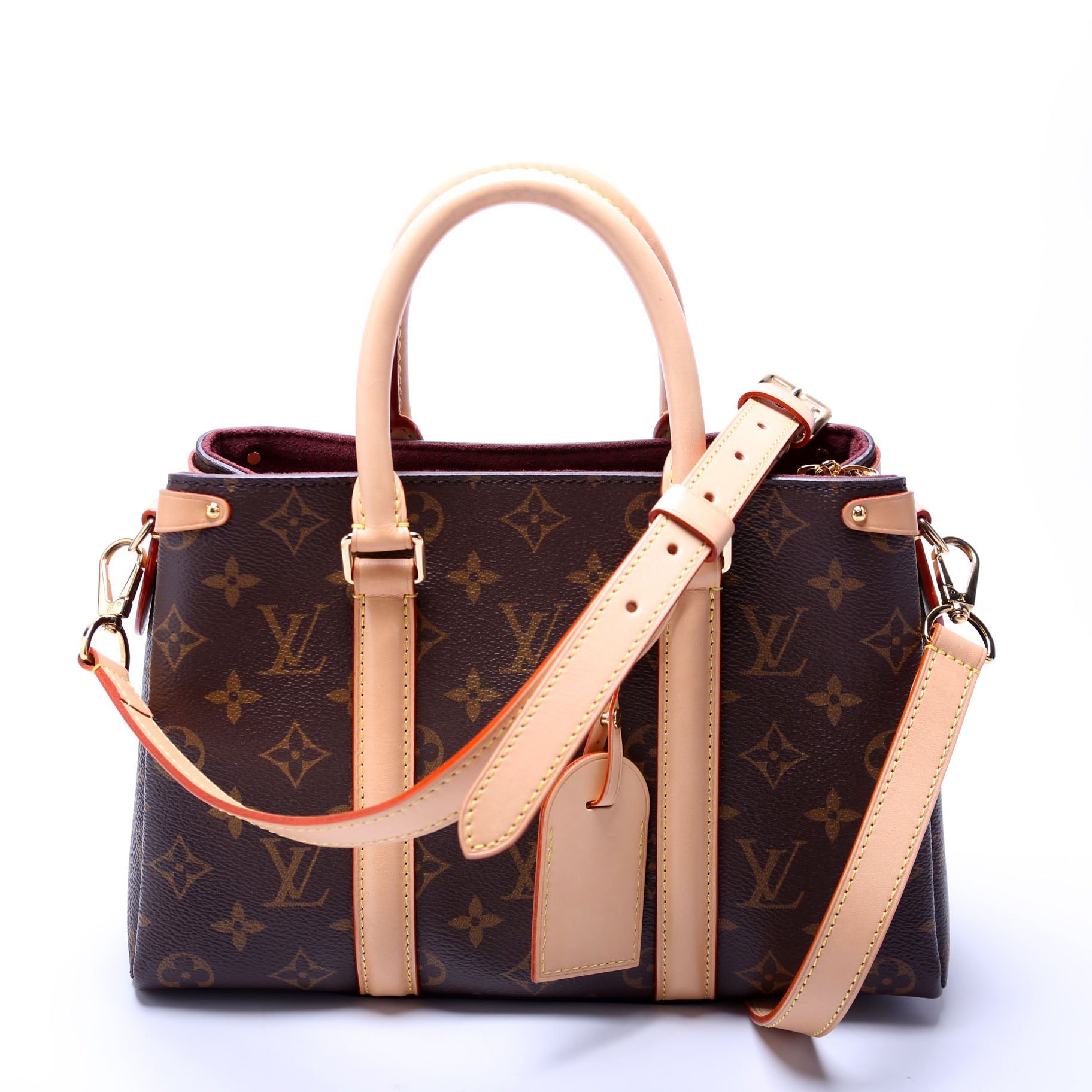 Louis Vuitton Soufflot MM . The exterior is in the classic Louis Vuitton Monogram coated canvas.