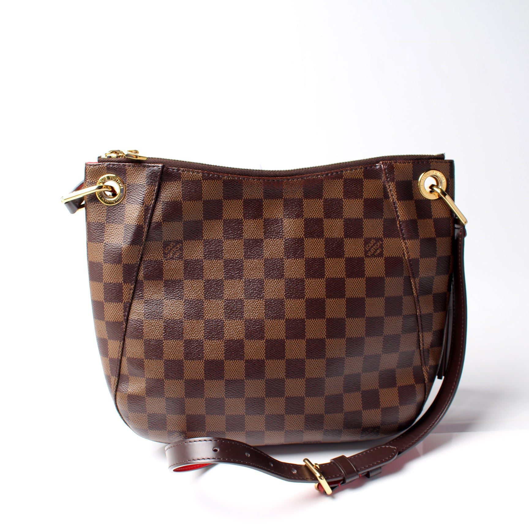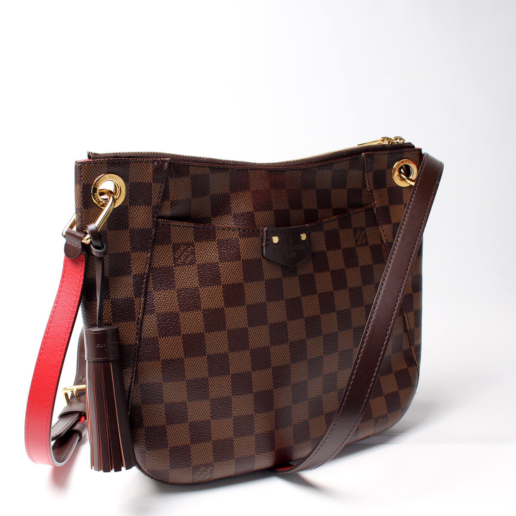 Louis Vuitton South Bank Besace. The exterior is in the classic Louis Vuitton Damier Ebene coated canvas.Â