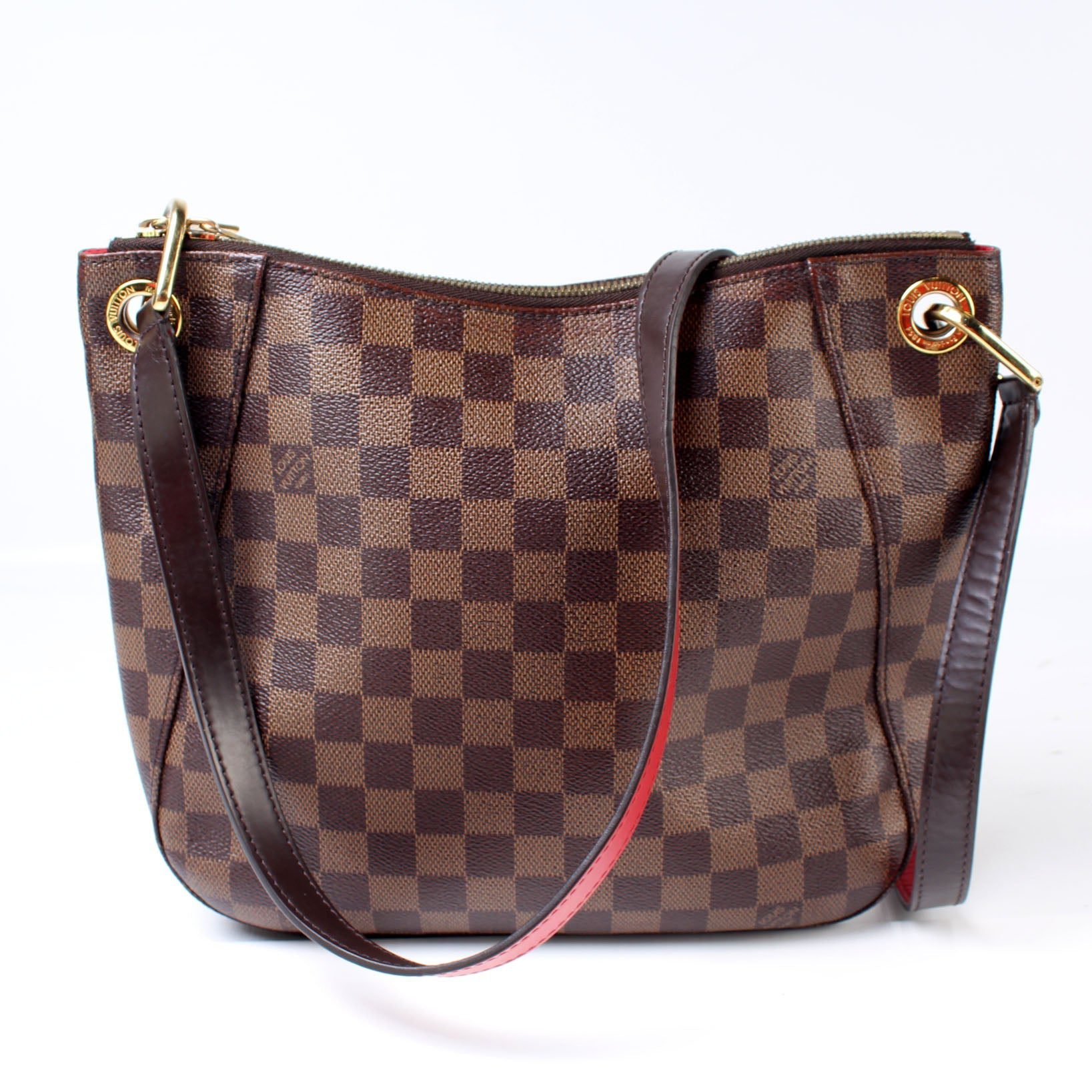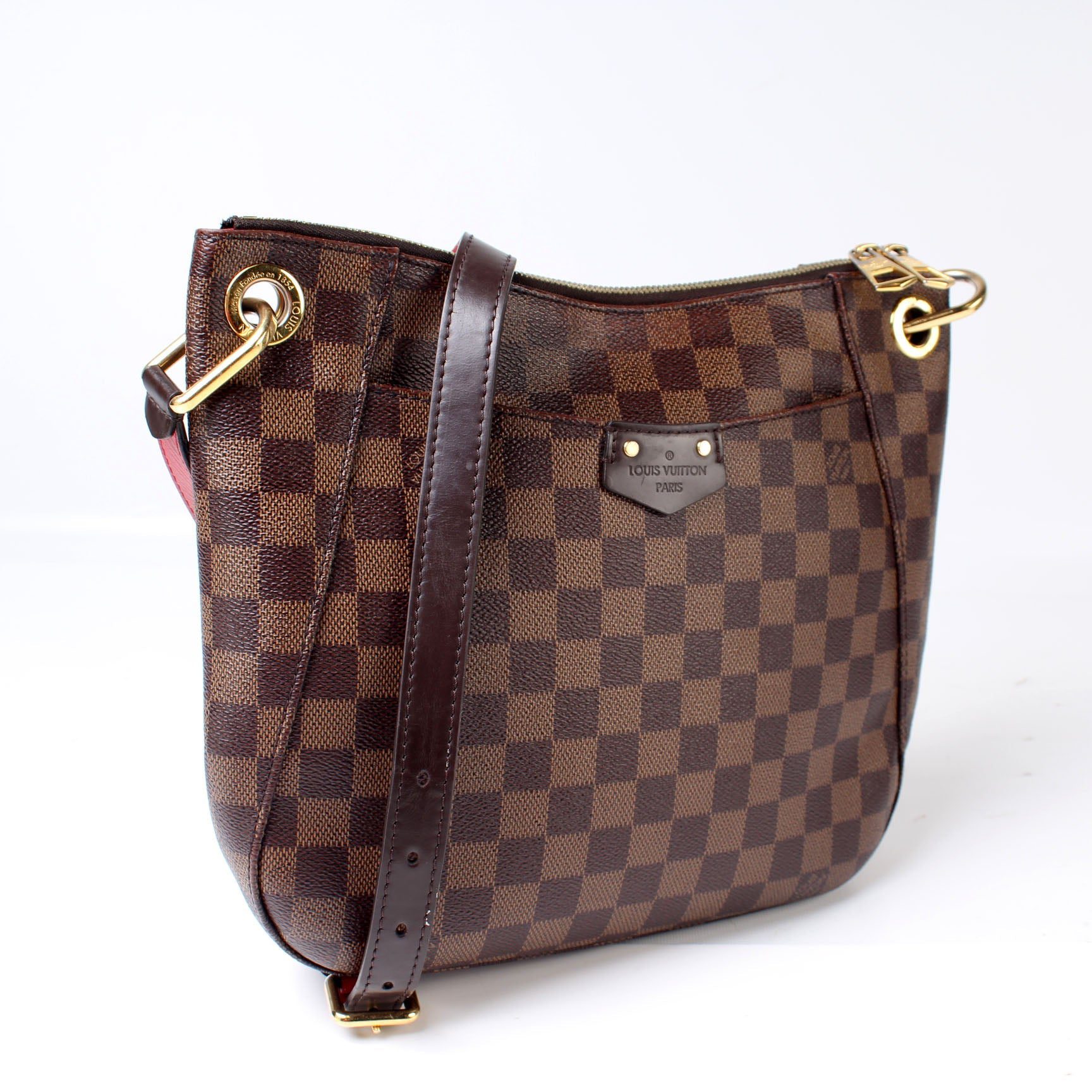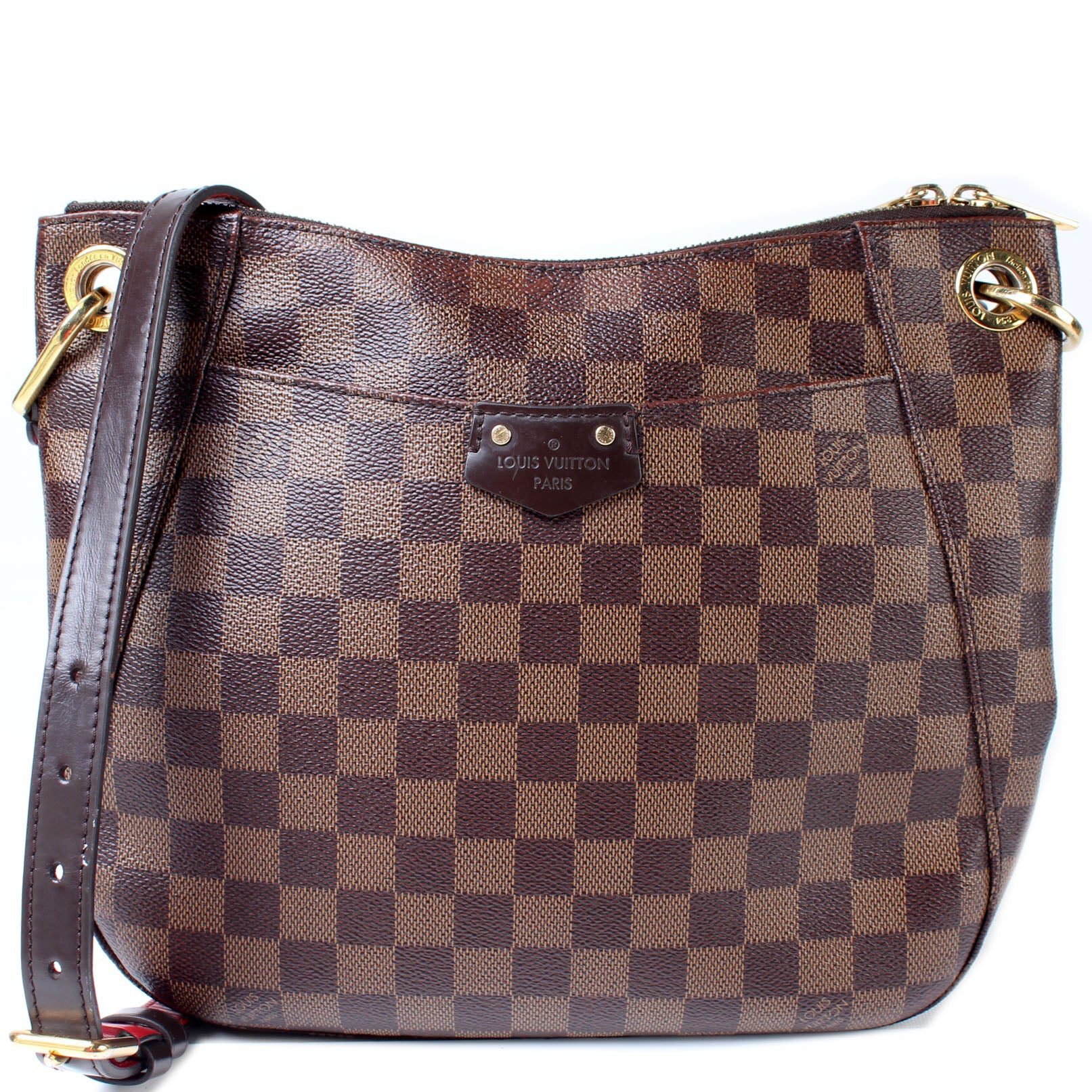 Louis Vuitton South Bank Besace. The exterior is in the classic Louis Vuitton Damier Ebene coated canvas.Â