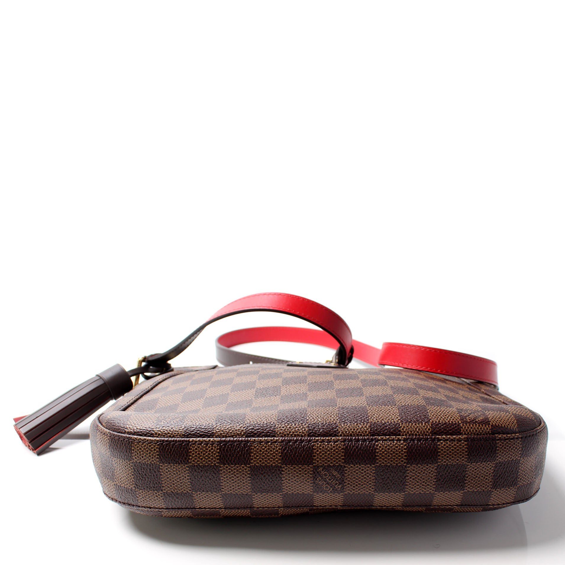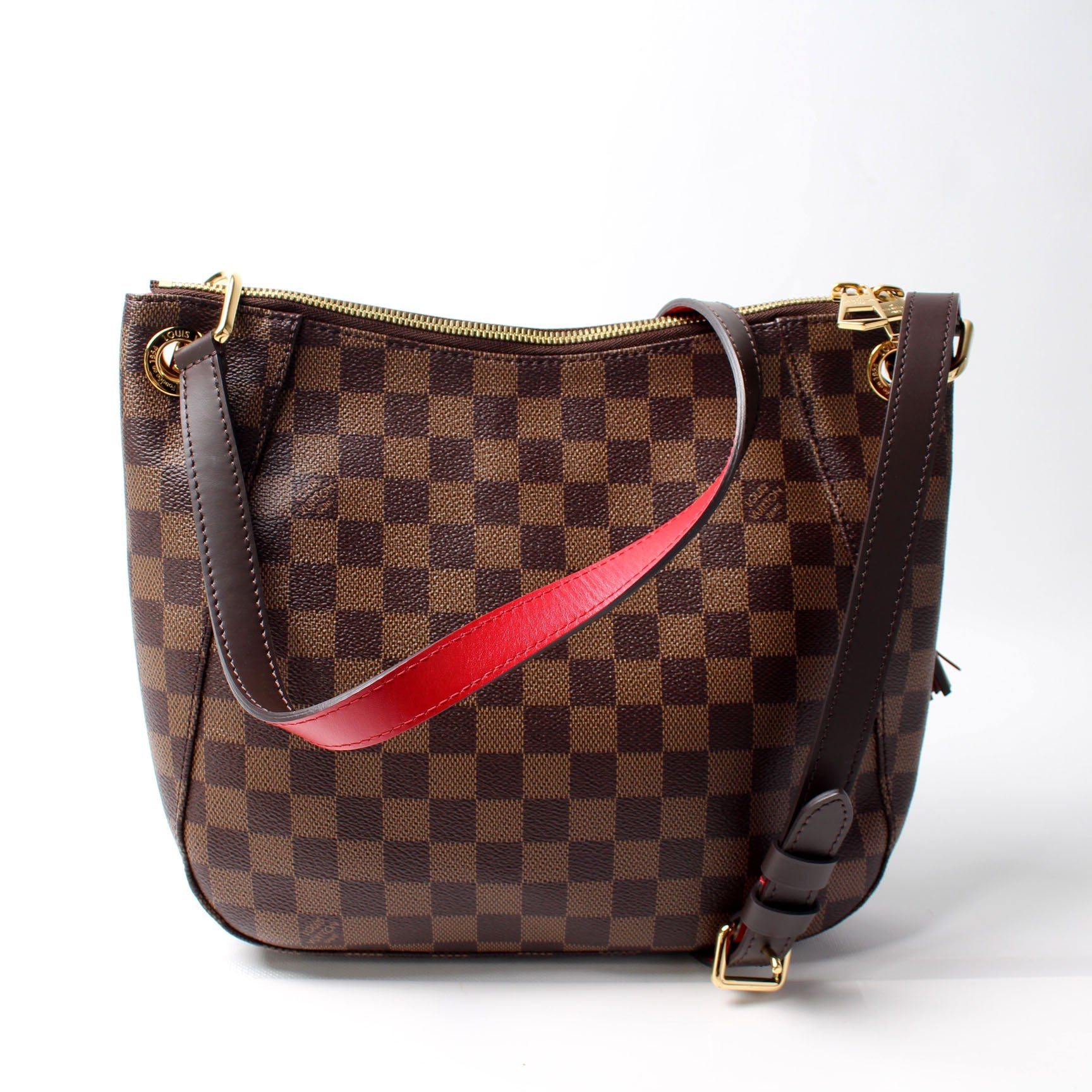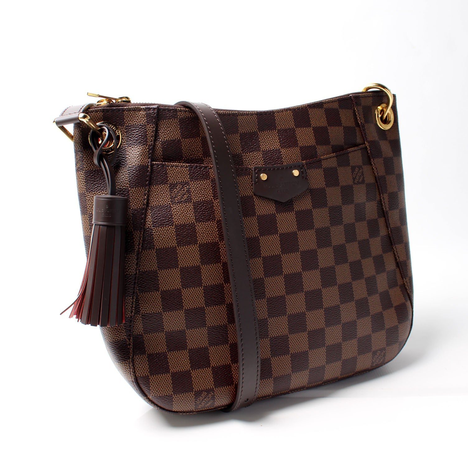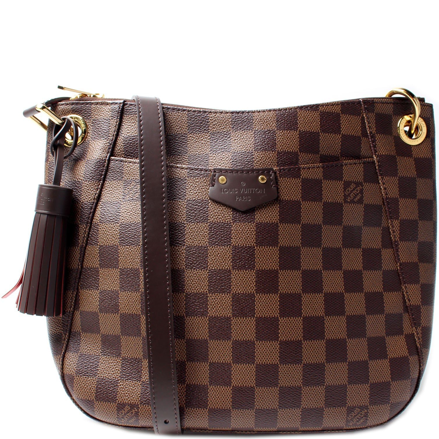 Louis Vuitton South Bank Besace. The exterior is in the classic Louis Vuitton Damier Ebene coated canvas.Â