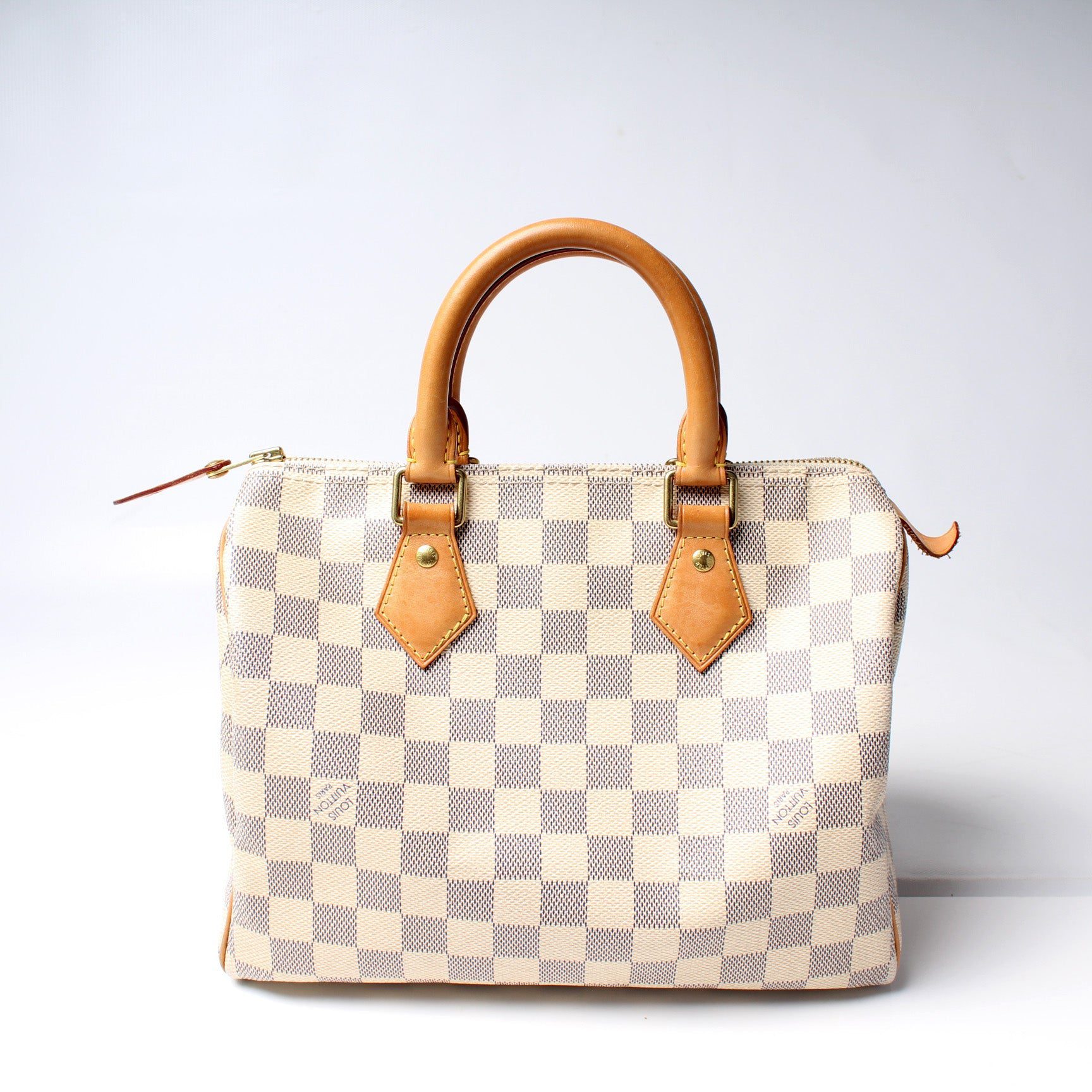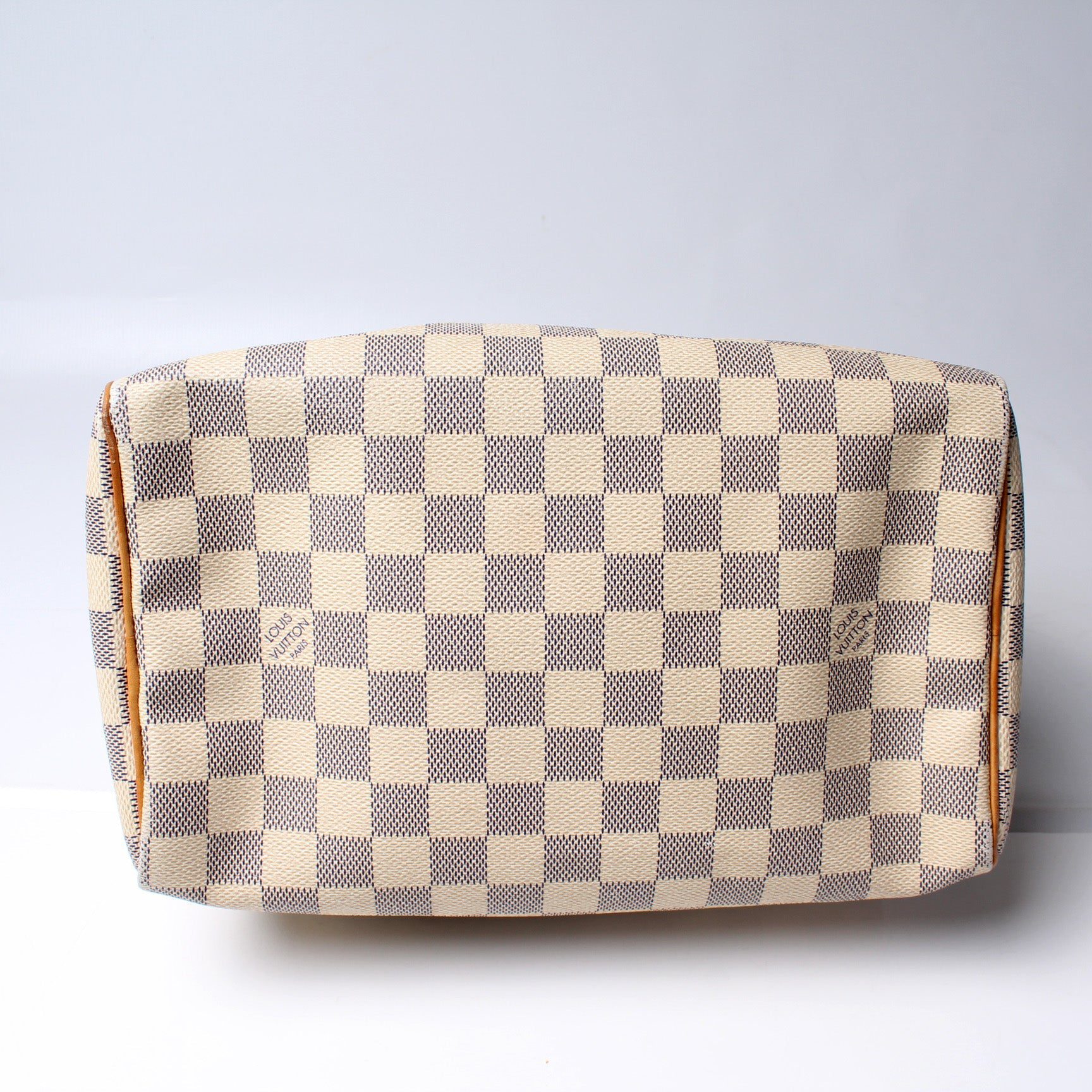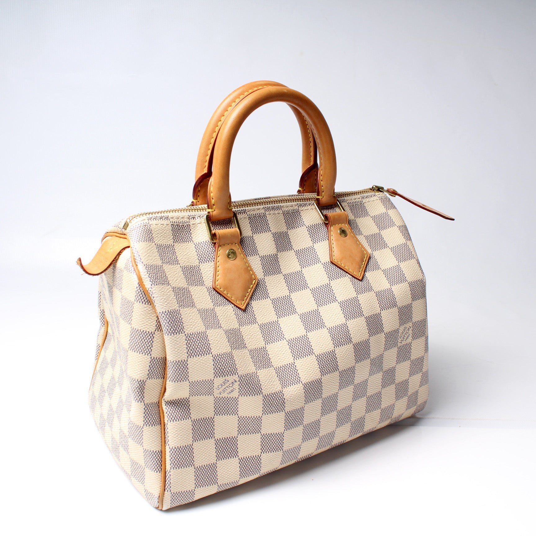 Louis Vuitton Speedy 25. The exterior is in the classic Louis Vuitton Damier Azur coated canvas.Â