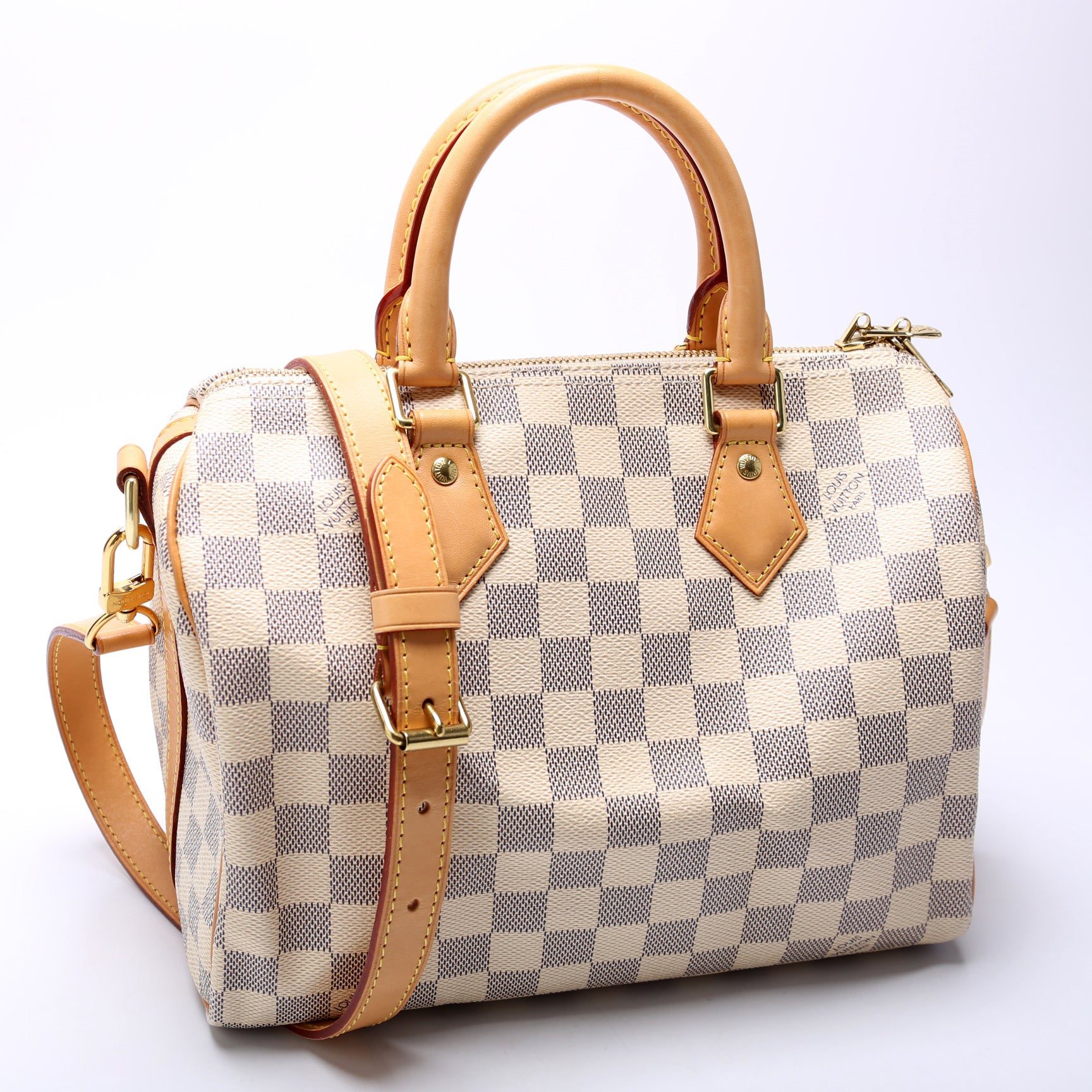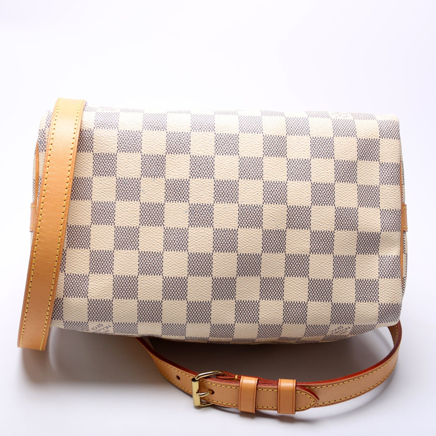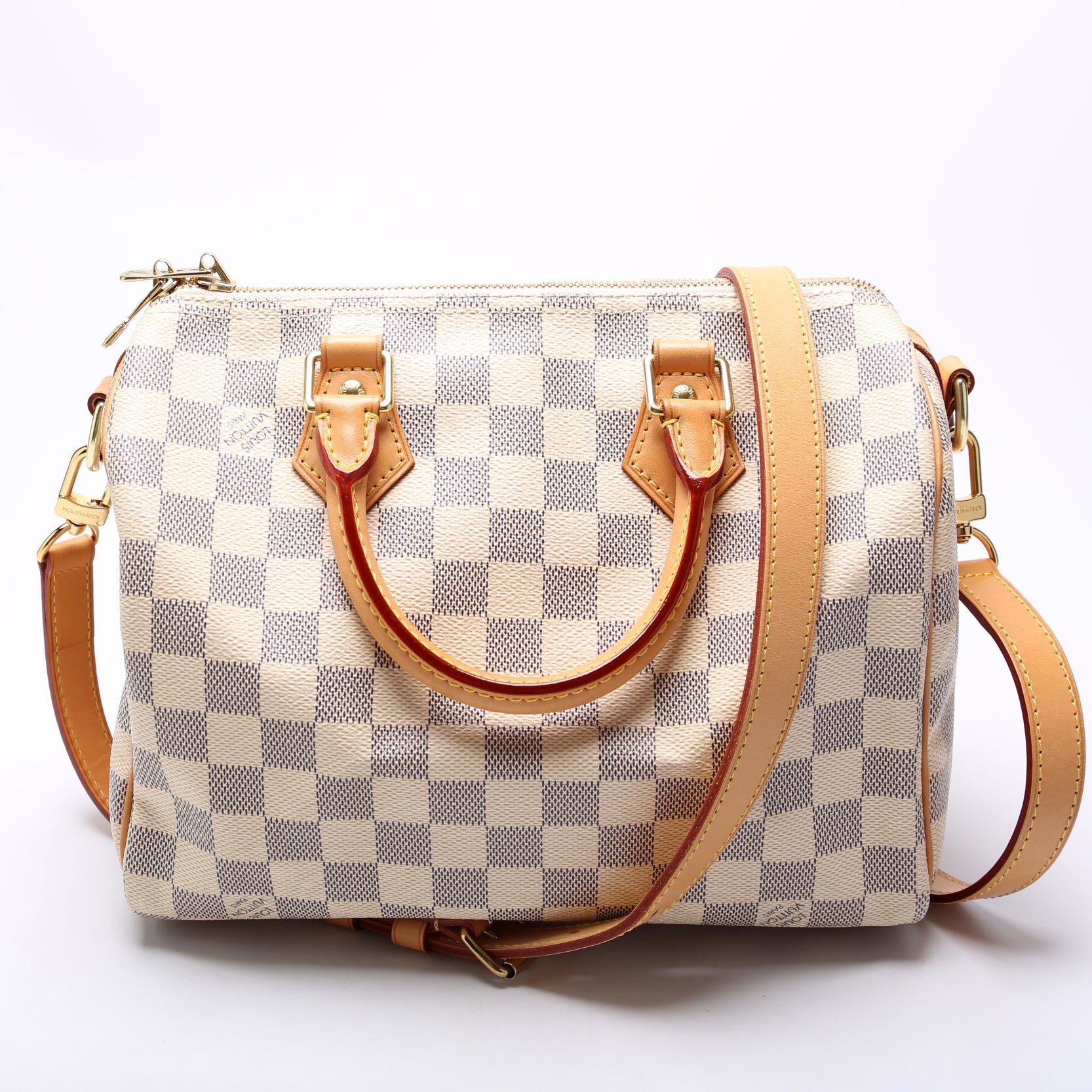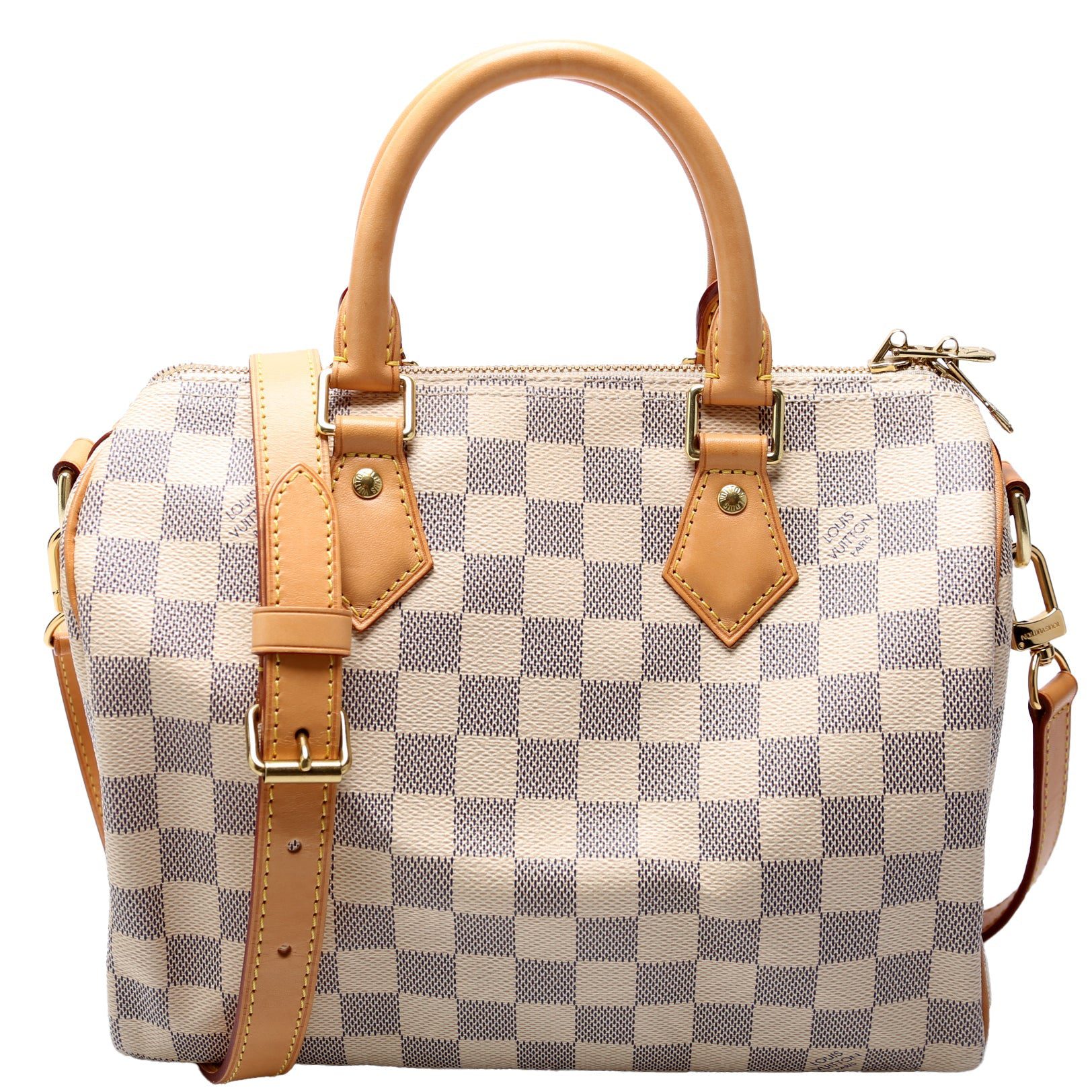 Louis Vuitton Speedy 25 Bandouliere. The exterior is in the classic Louis Vuitton Damier Azur coated canvas.Â
