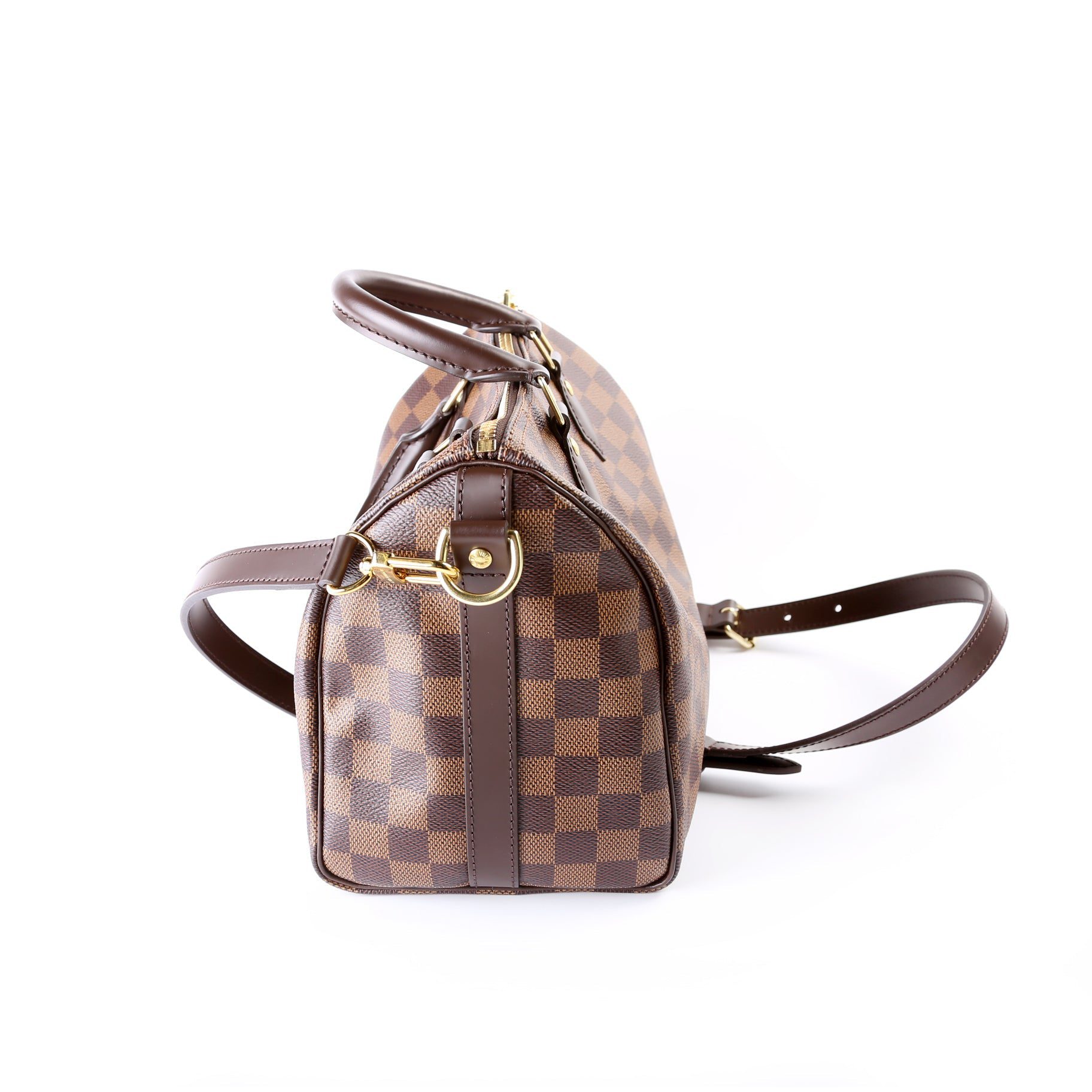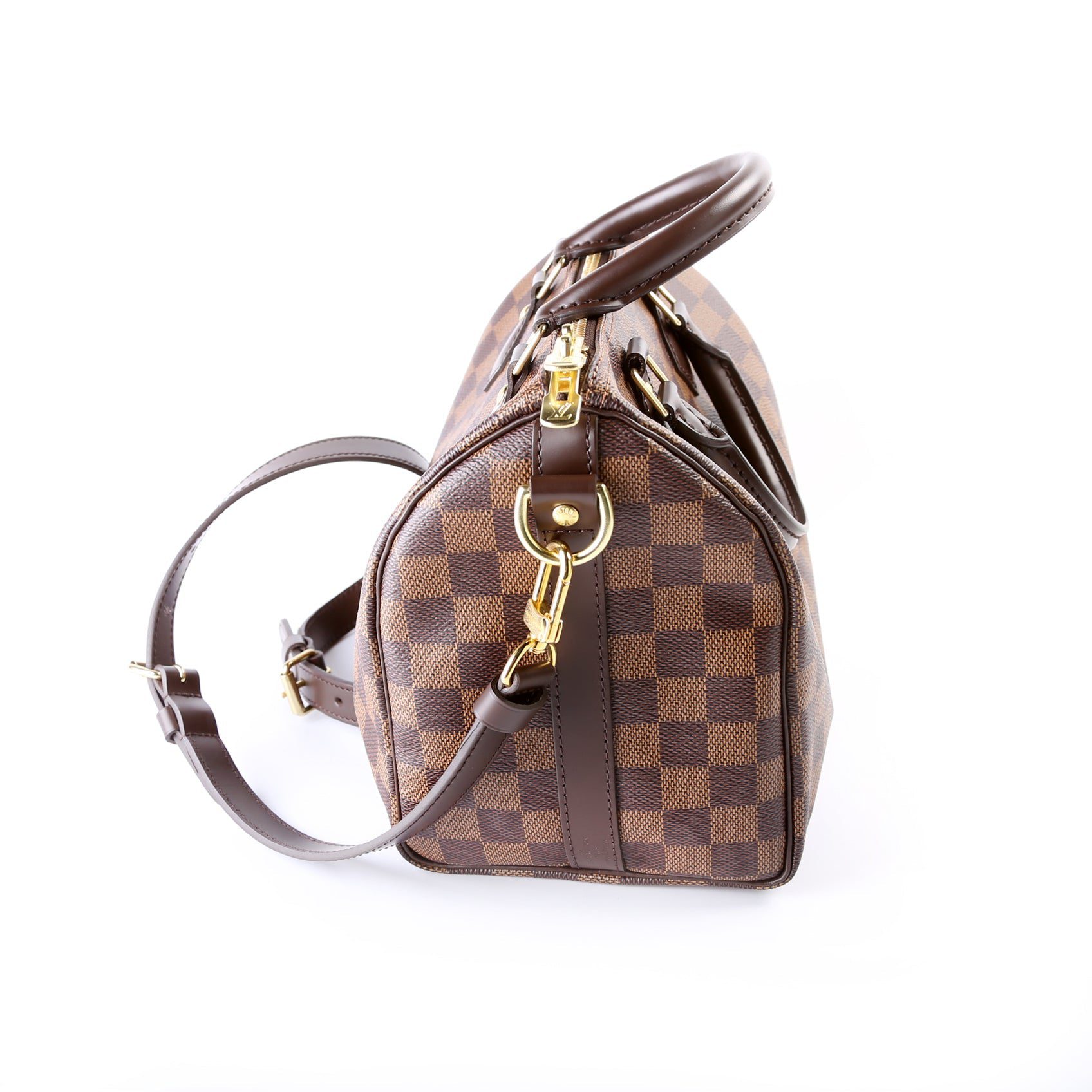 Louis Vuitton Speedy 25. The exterior is in the classic Louis Vuitton Damier Ebene coated canvas.Â