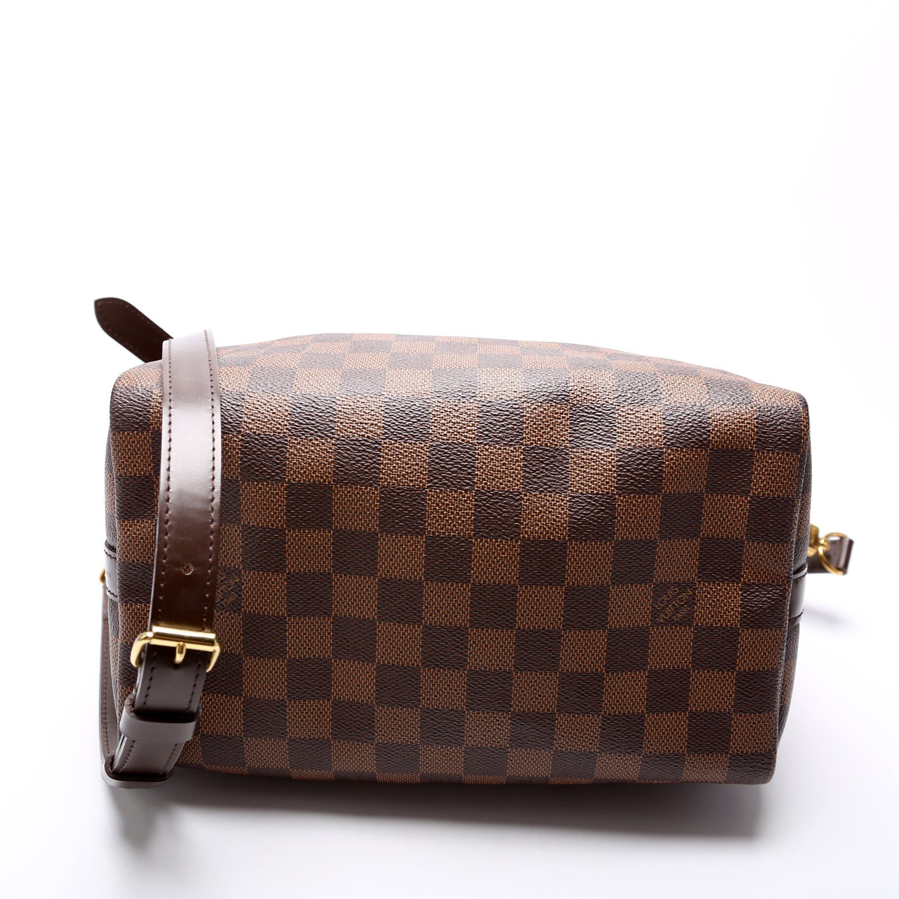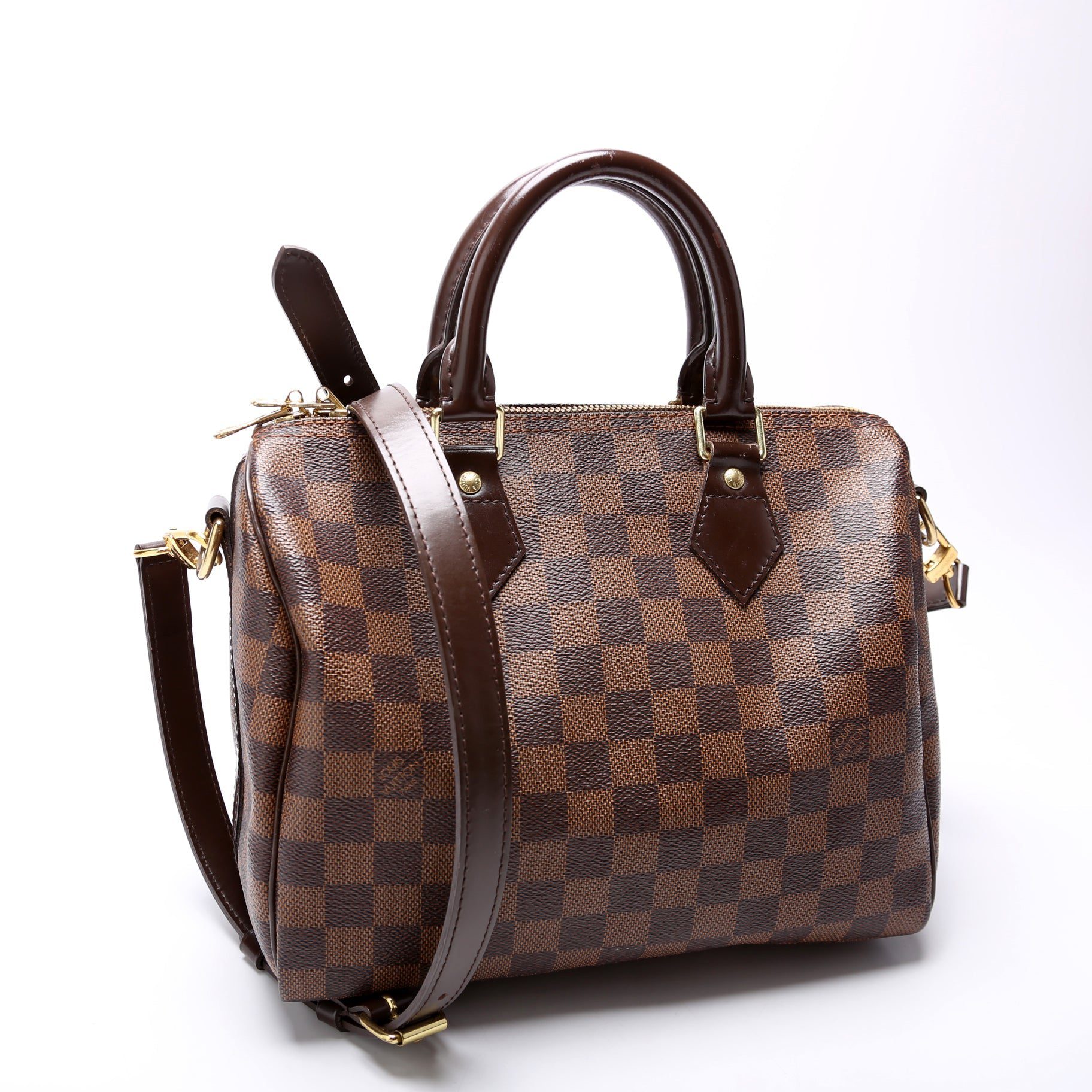 Louis Vuitton Speedy 25 Bandouliere. The exterior is in the classic Louis Vuitton Damier Ebene coated canvas.Â