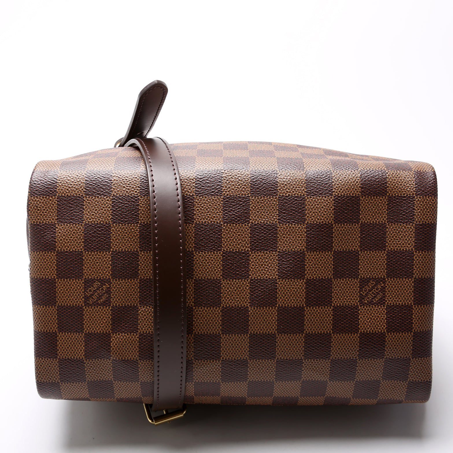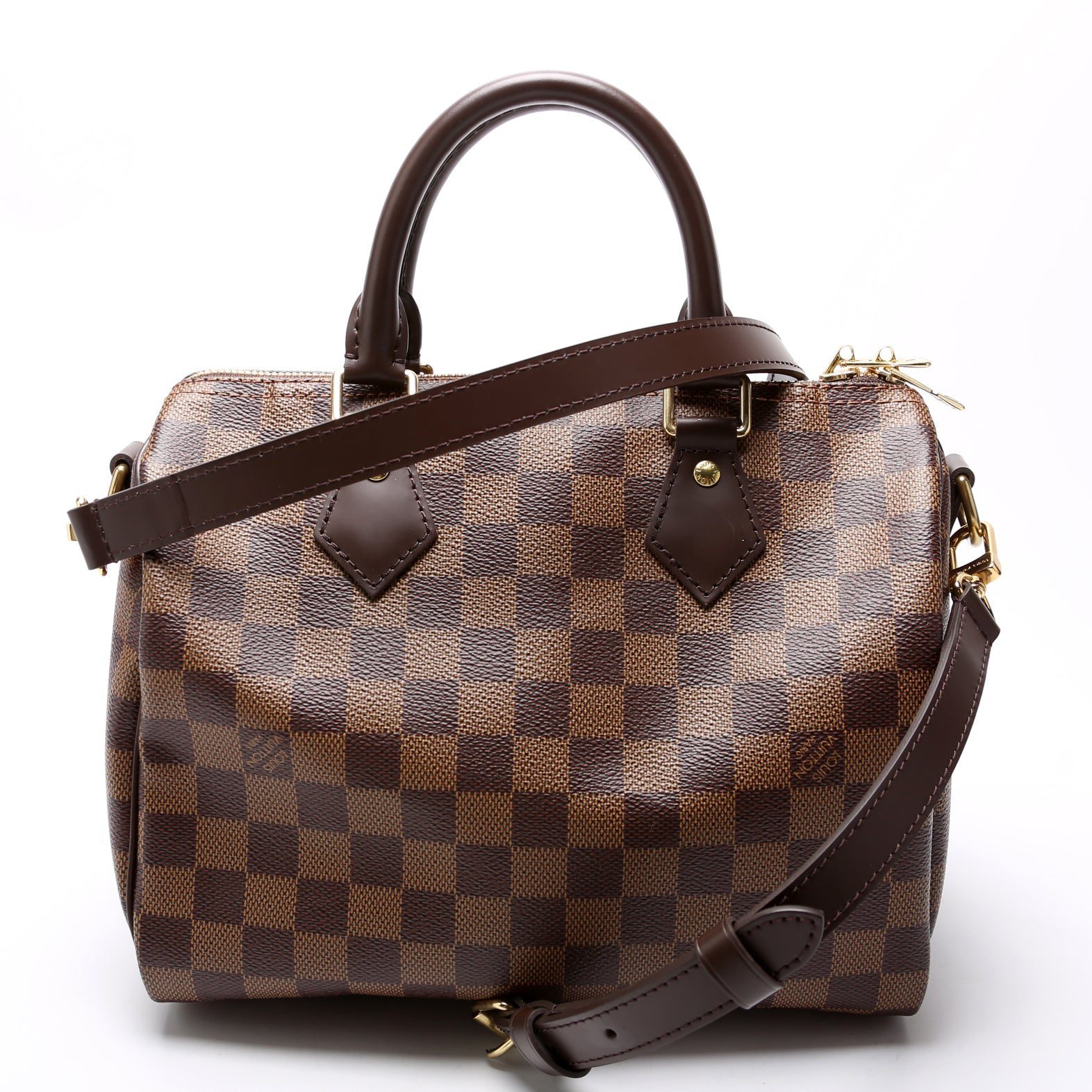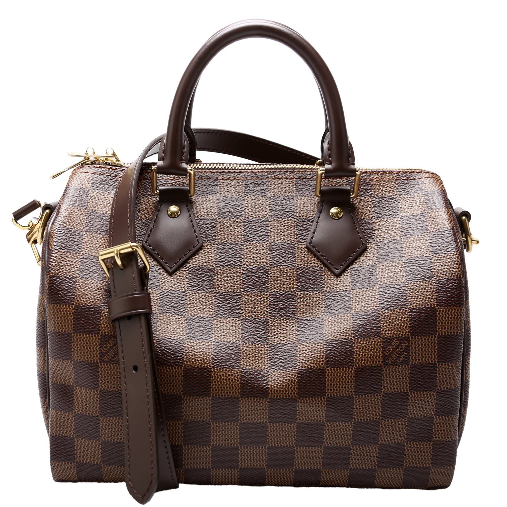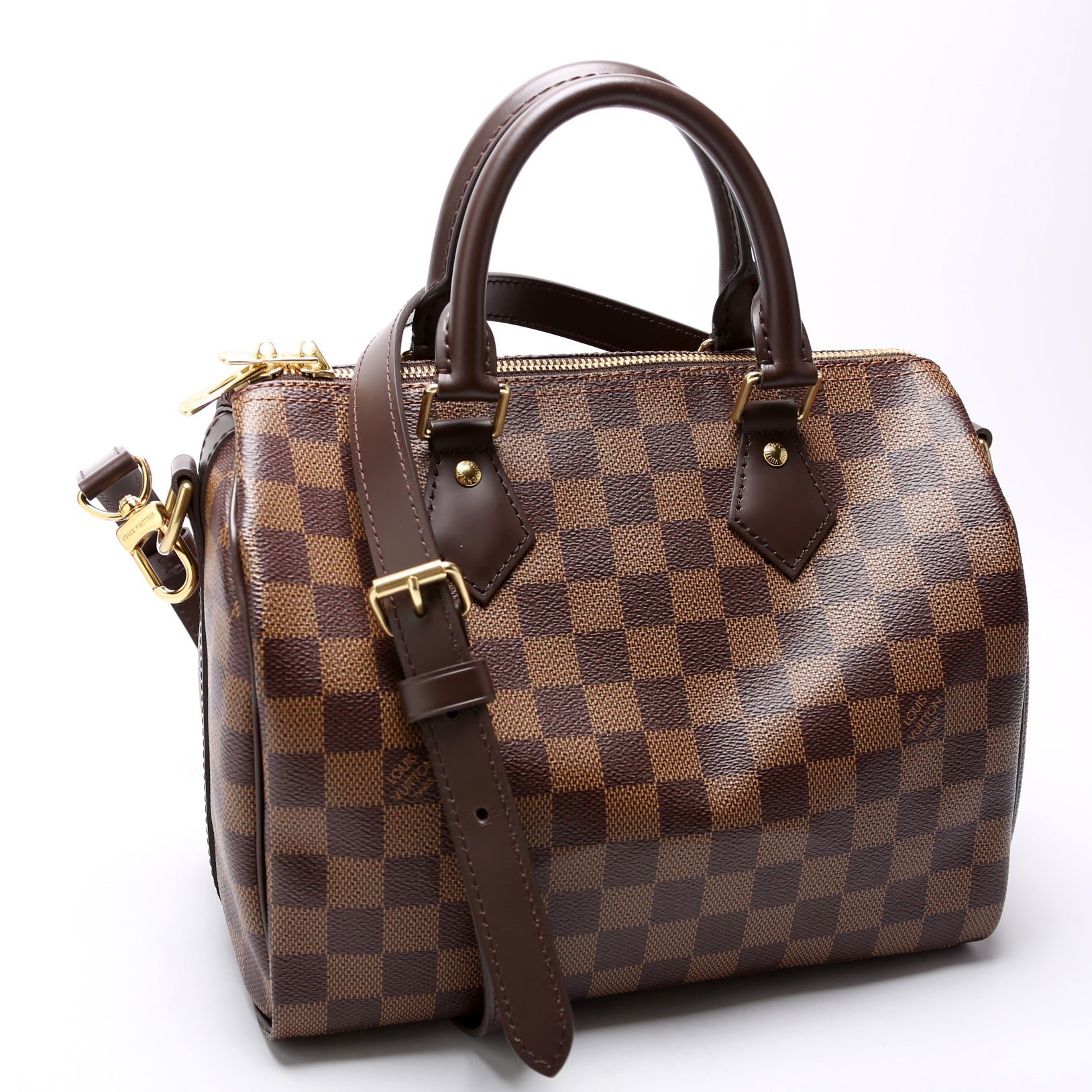 Louis Vuitton Speedy 25 Bandouliere. The exterior is in the classic Louis Vuitton Damier Ebene coated canvas.Â
