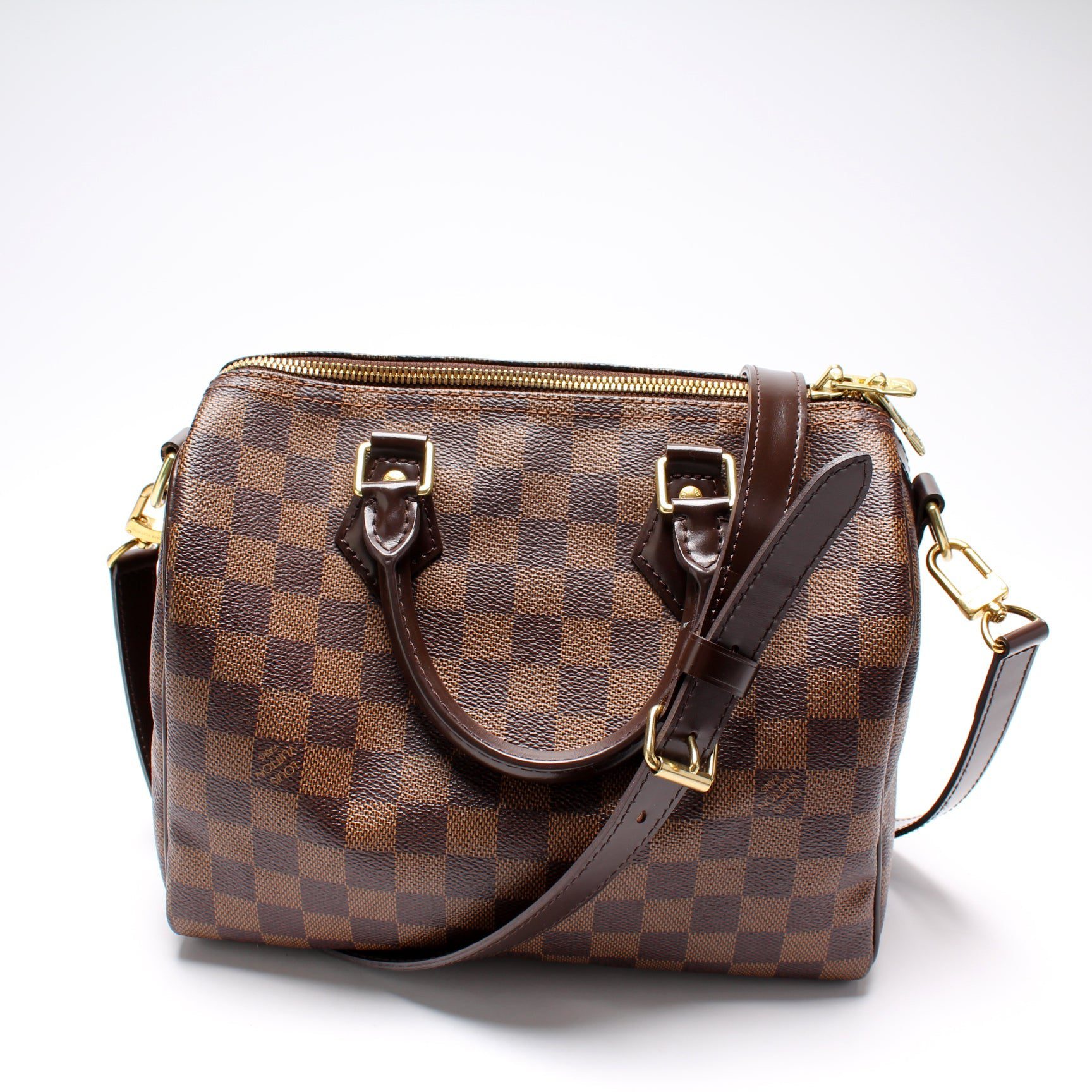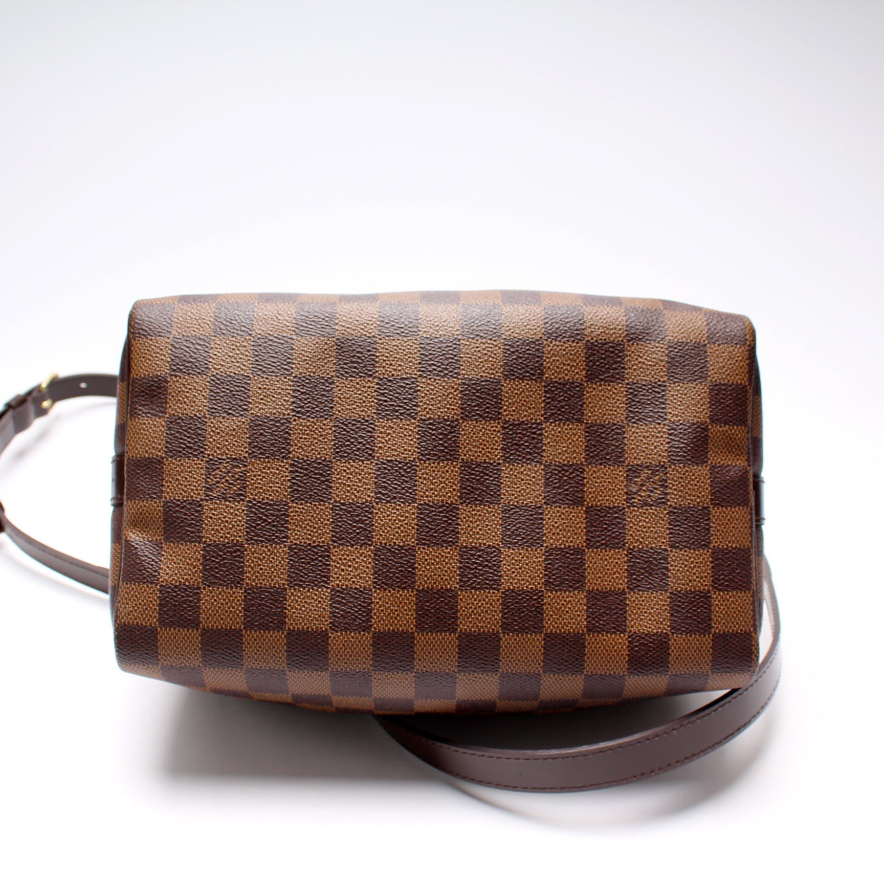 Louis Vuitton Speedy 25 Bandouliere. The exterior is in the classic Louis Vuitton Damier Ebene coated canvas.Â