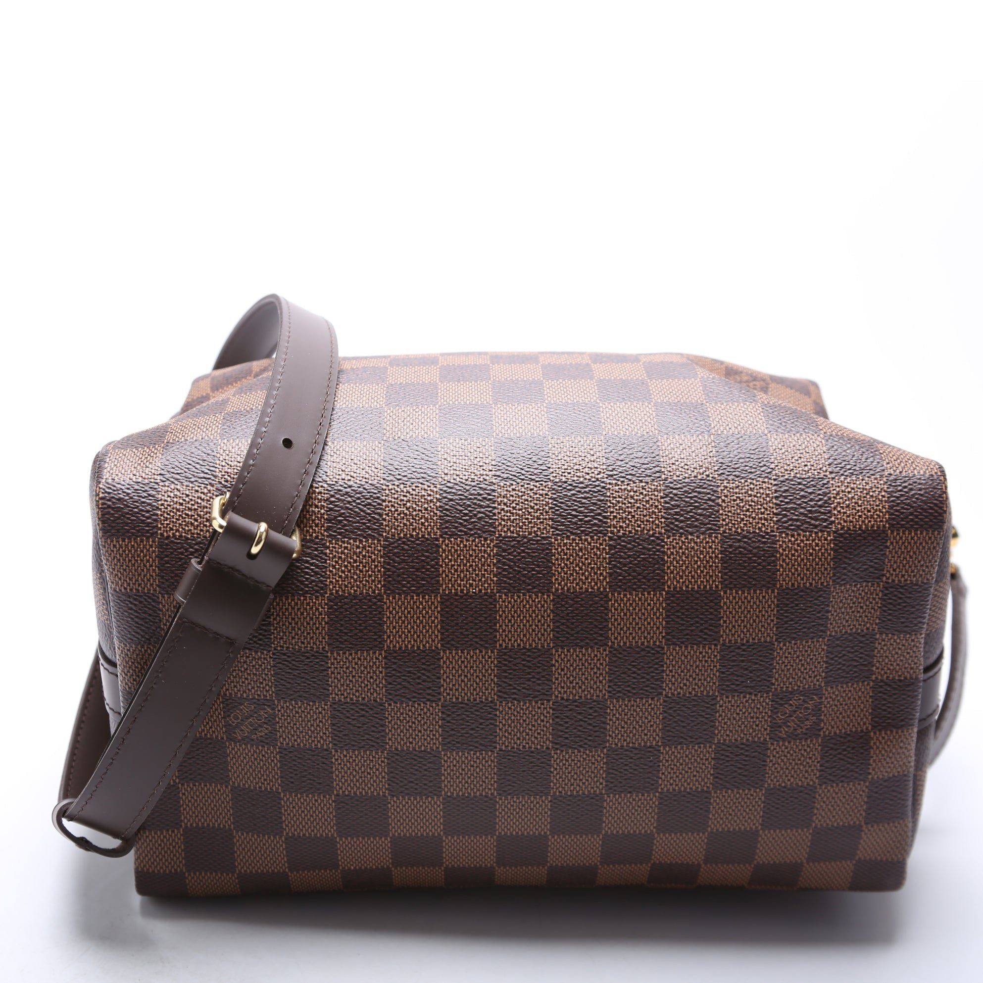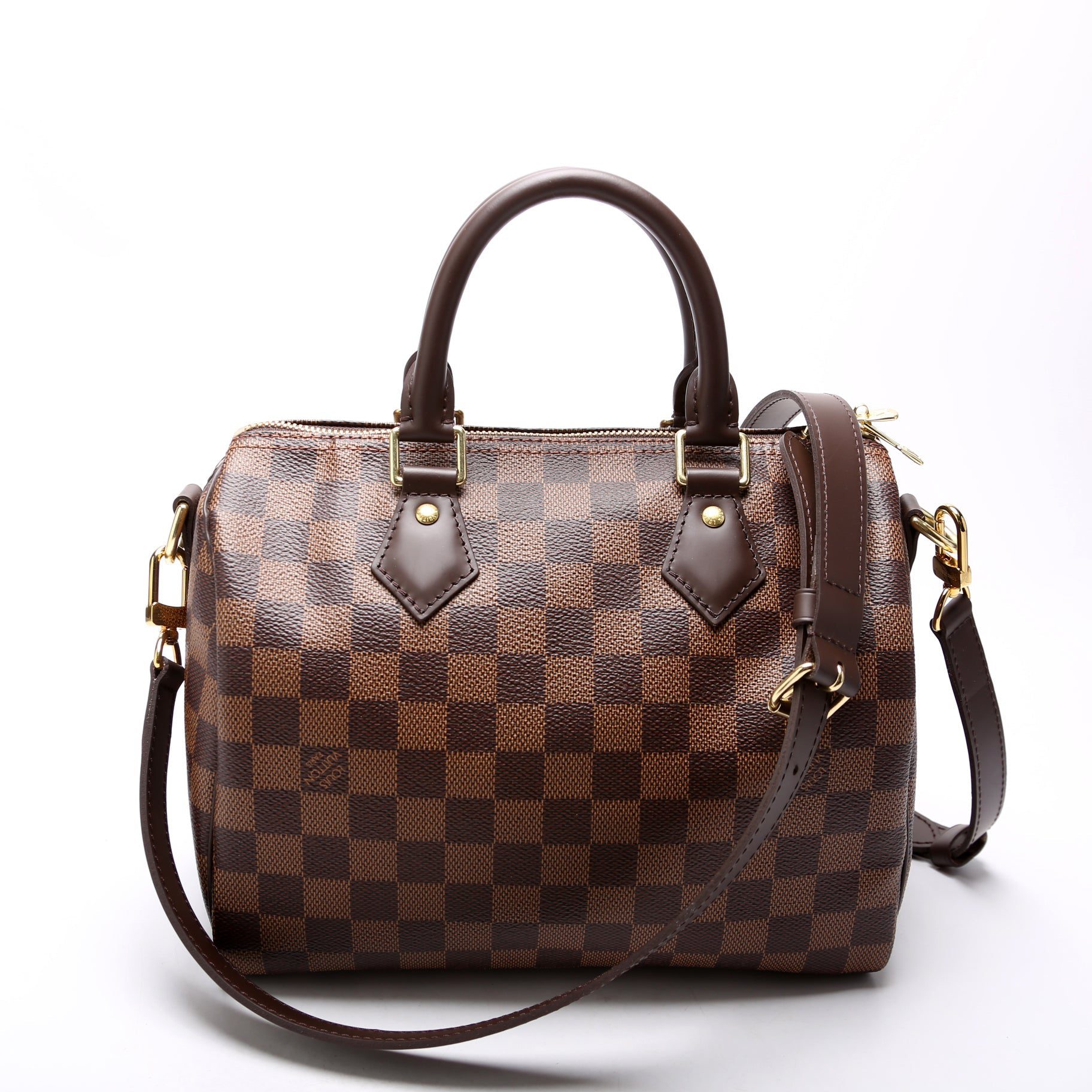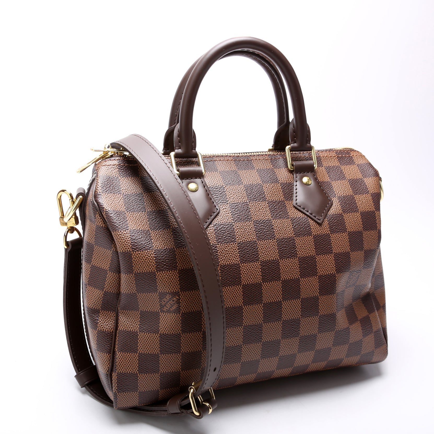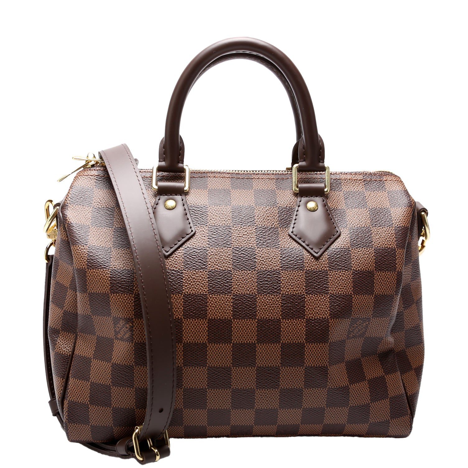 Louis Vuitton Speedy 25 Bandouliere. The exterior is in the classic Louis Vuitton Damier Ebene coated canvas.Â
