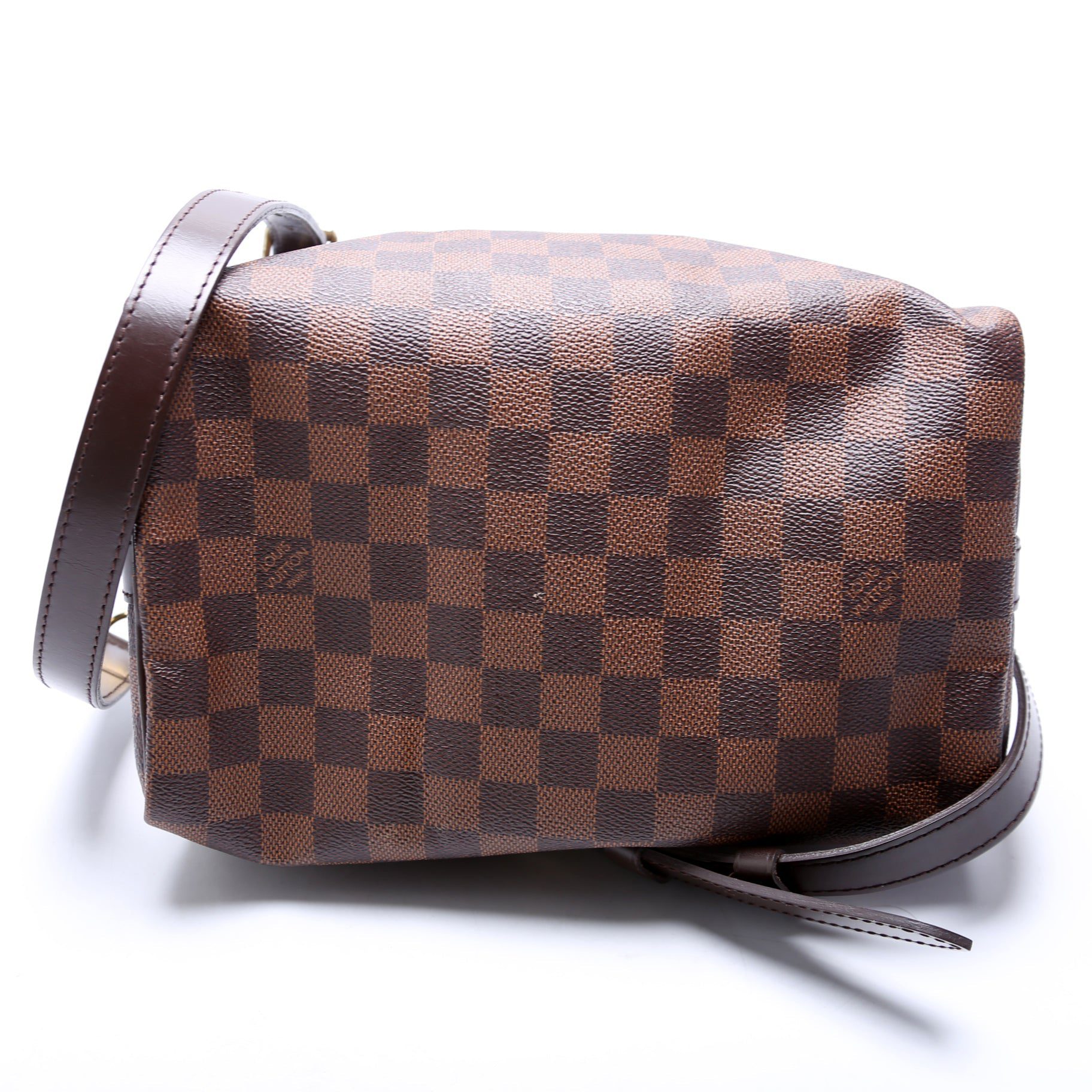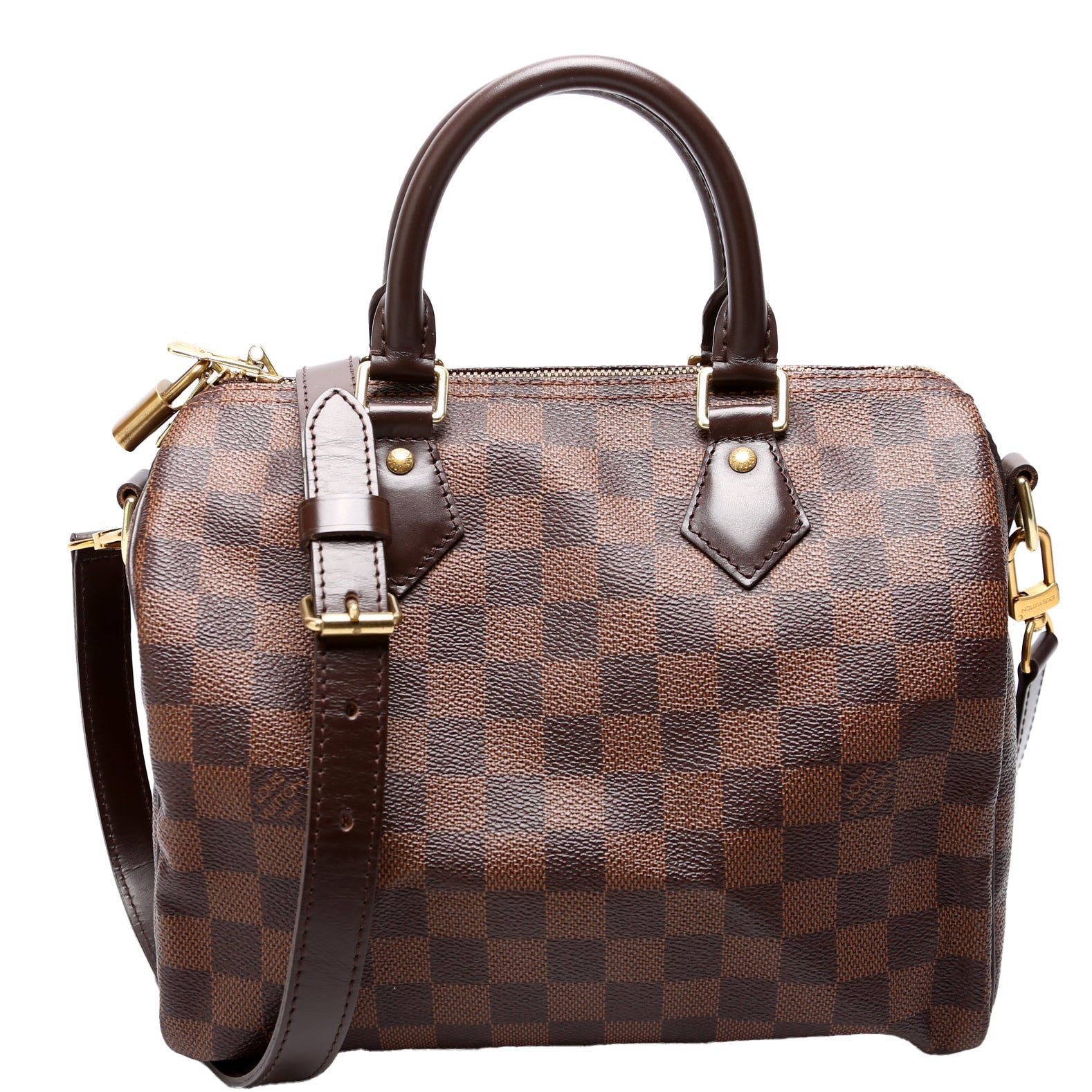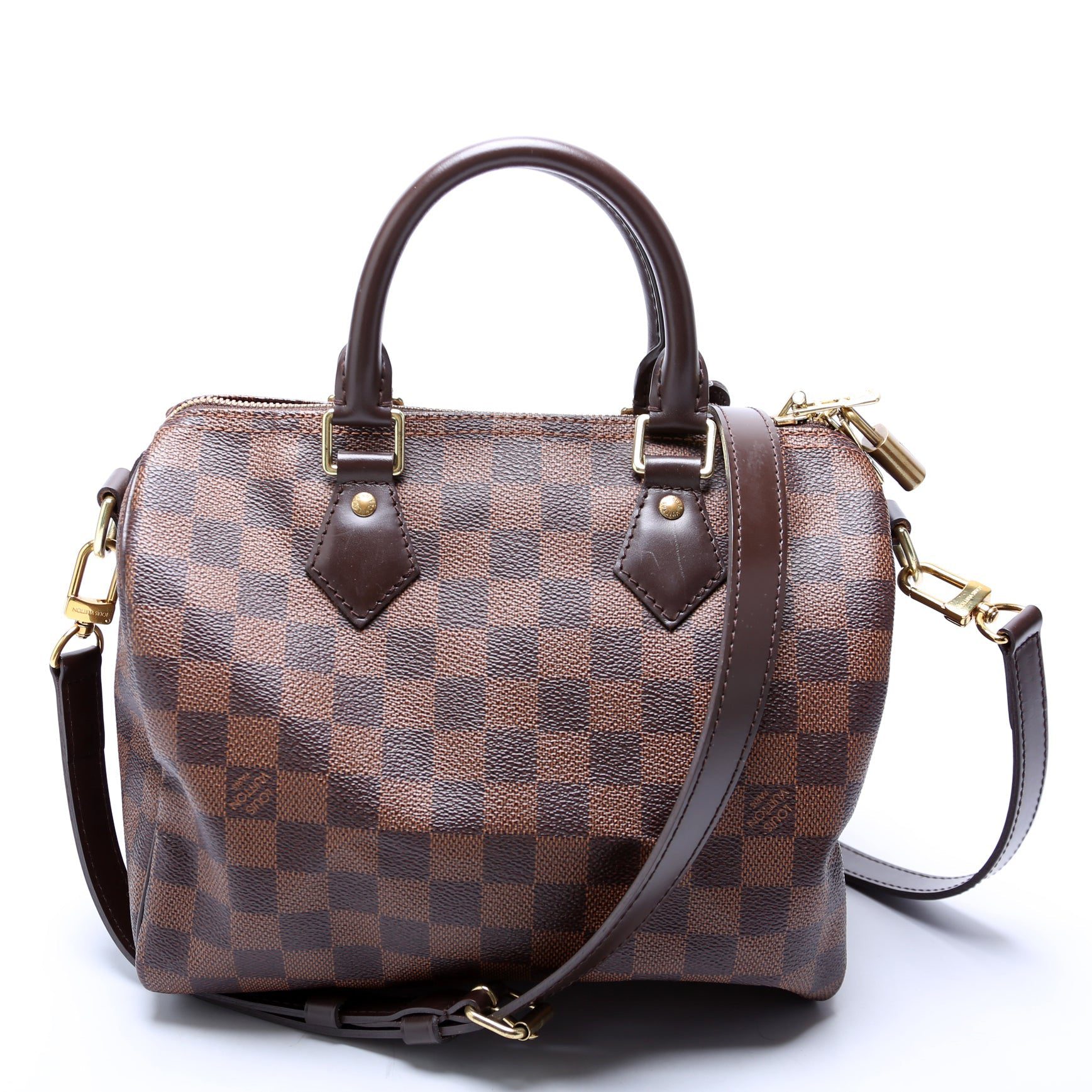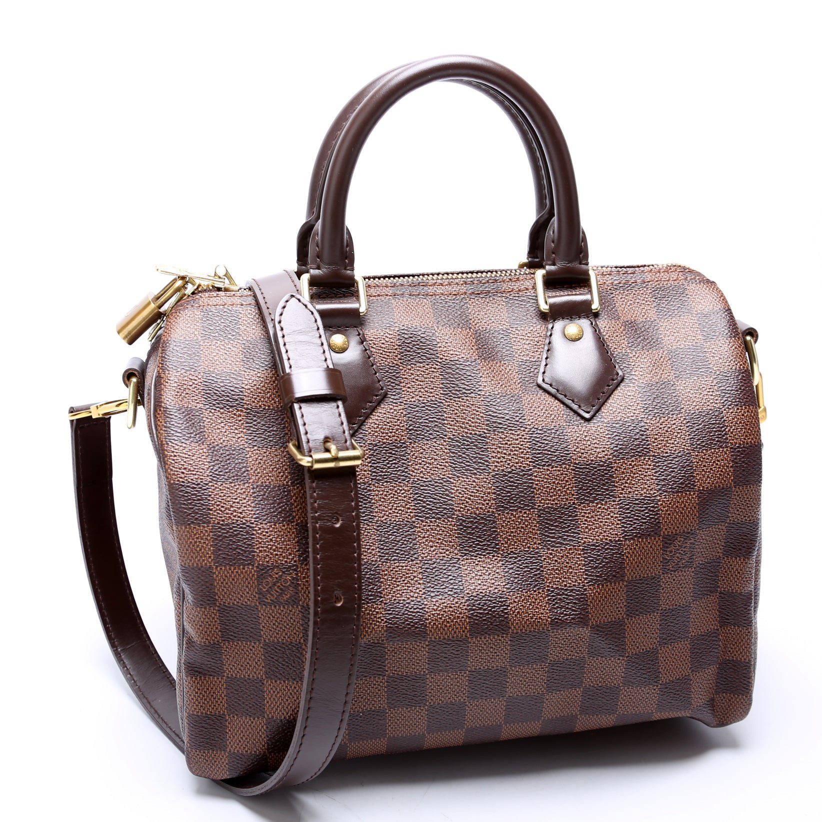 Louis Vuitton Speedy 25 Bandouliere. The exterior is in the classic Louis Vuitton Damier Ebene coated canvas.Â