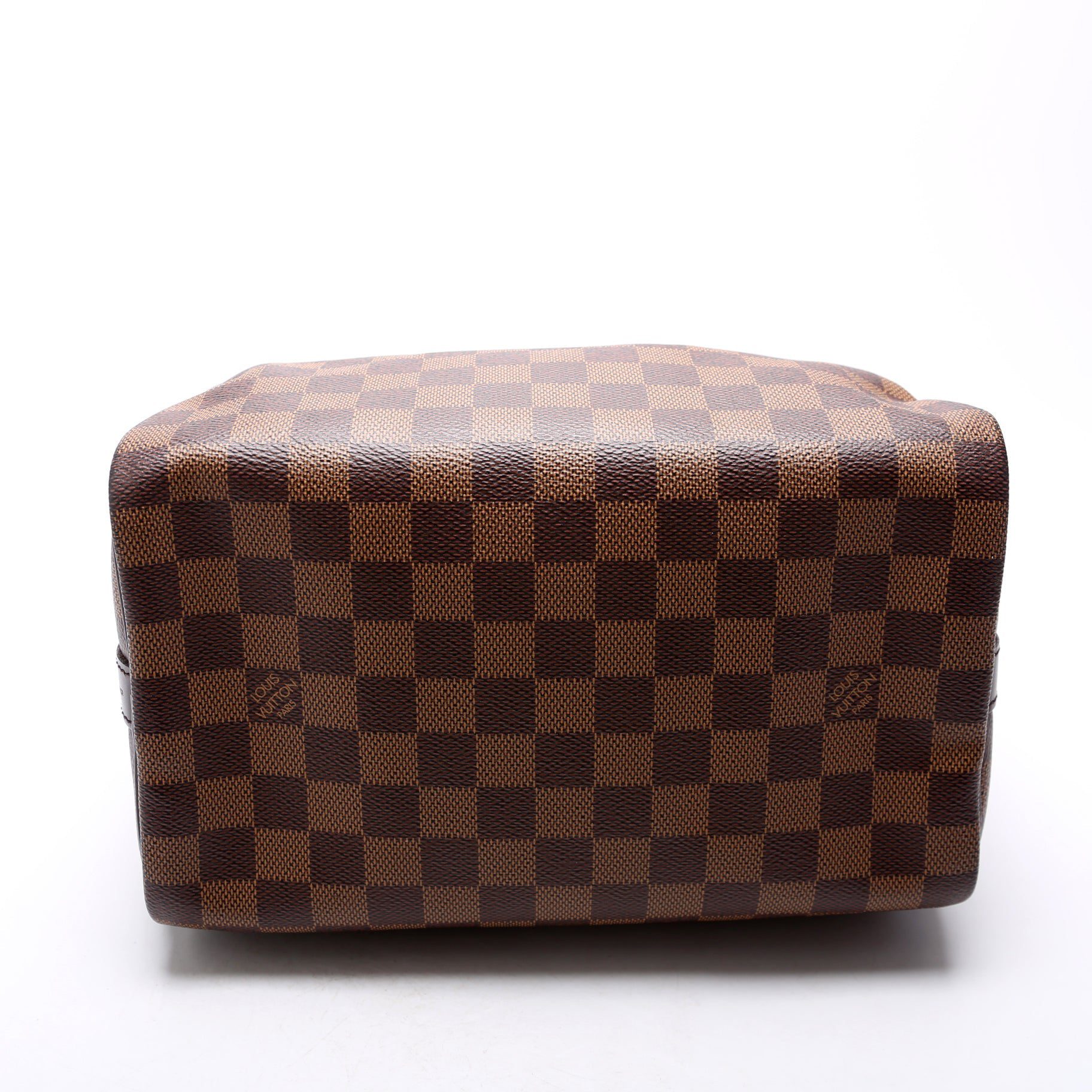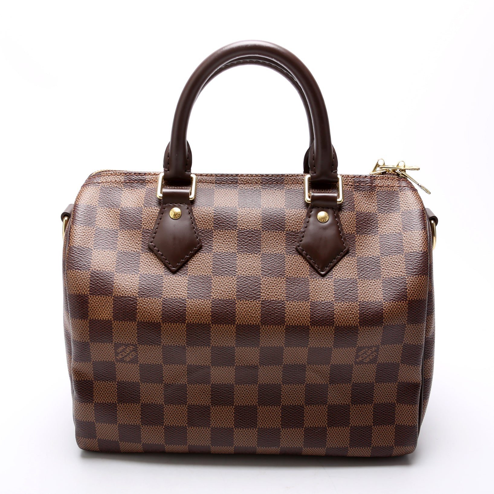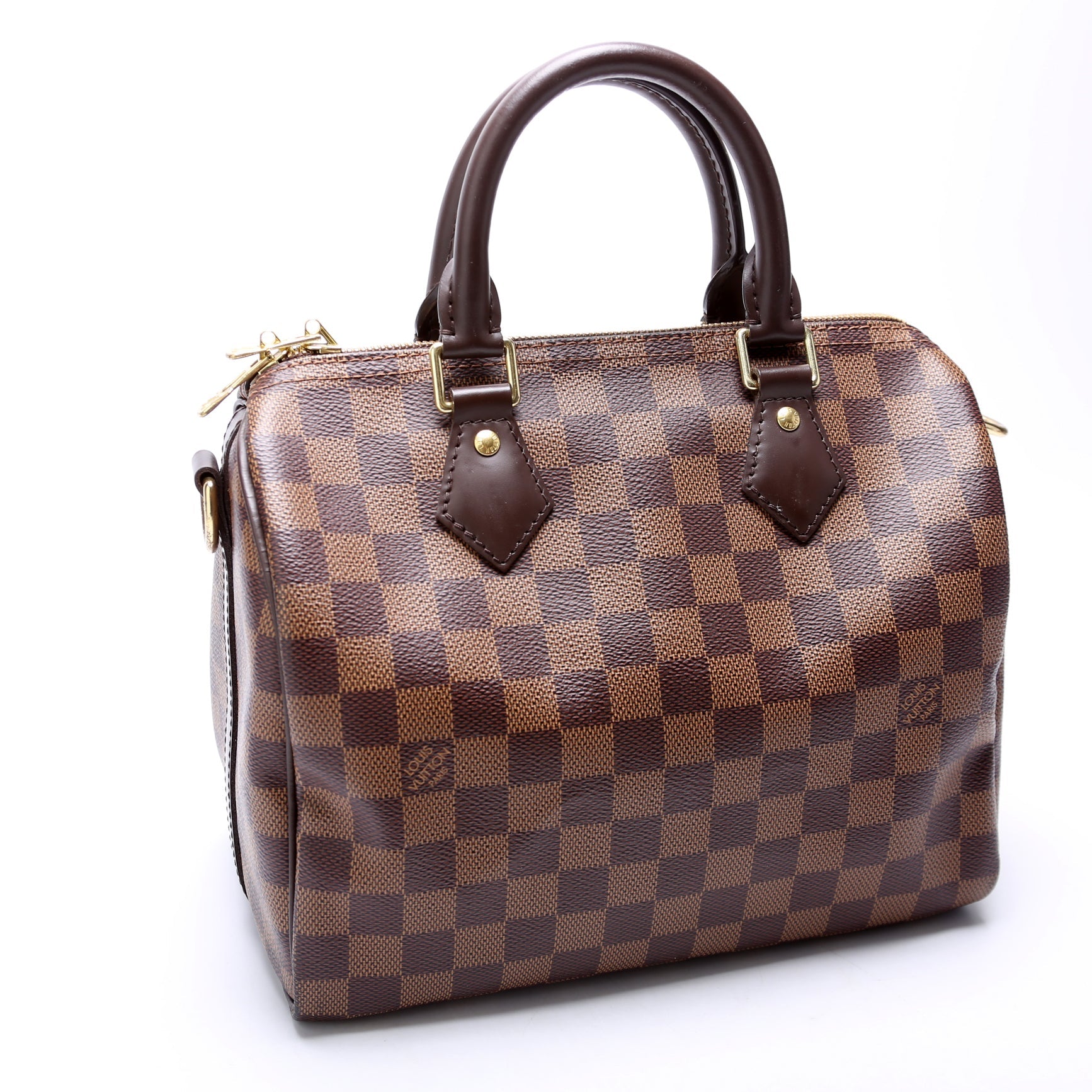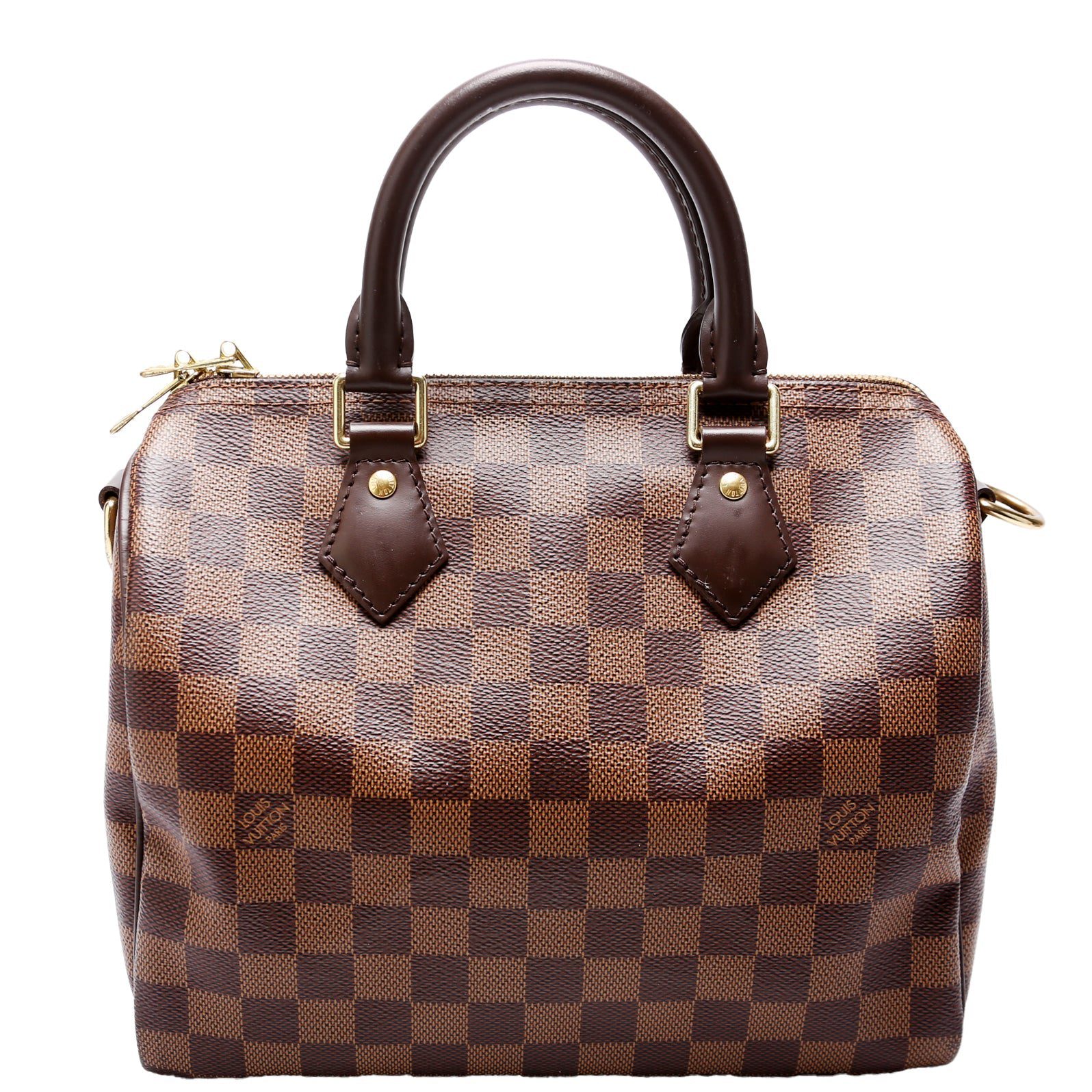 Louis Vuitton Speedy 25 Bandouliere. The exterior is in the classic Louis Vuitton Damier Ebene coated canvas.Â
