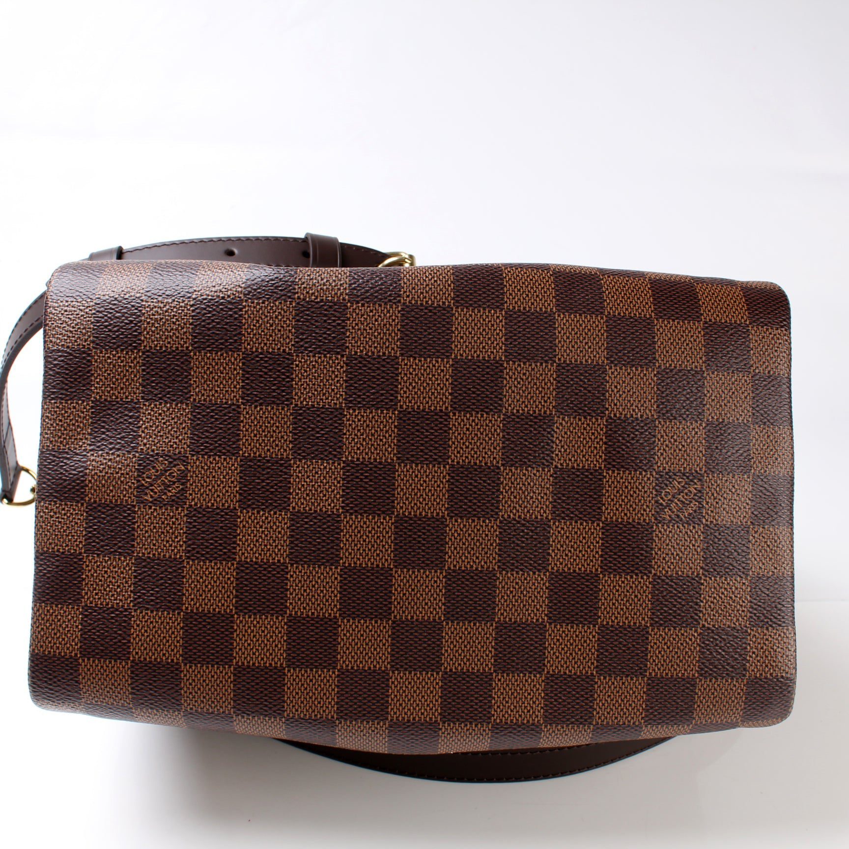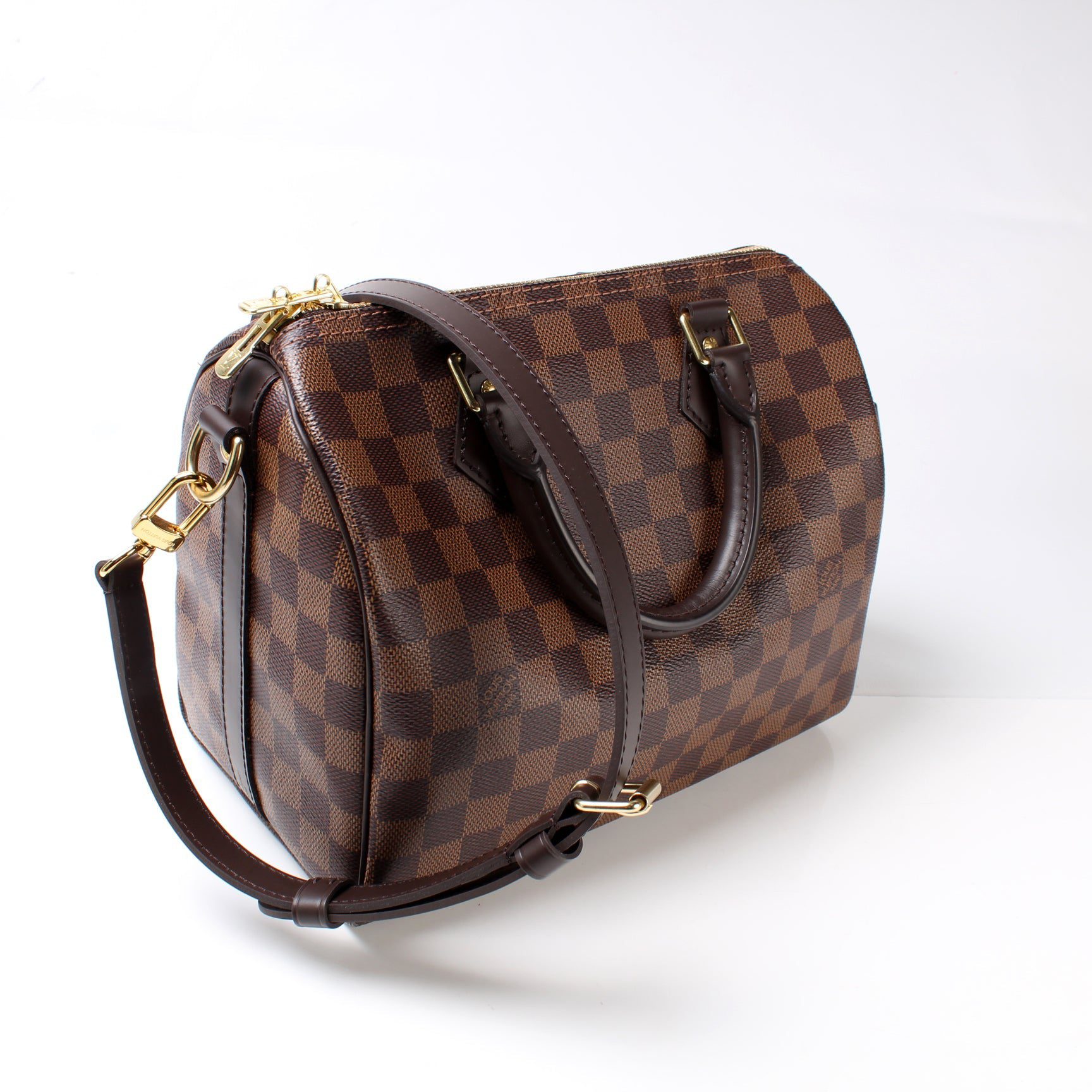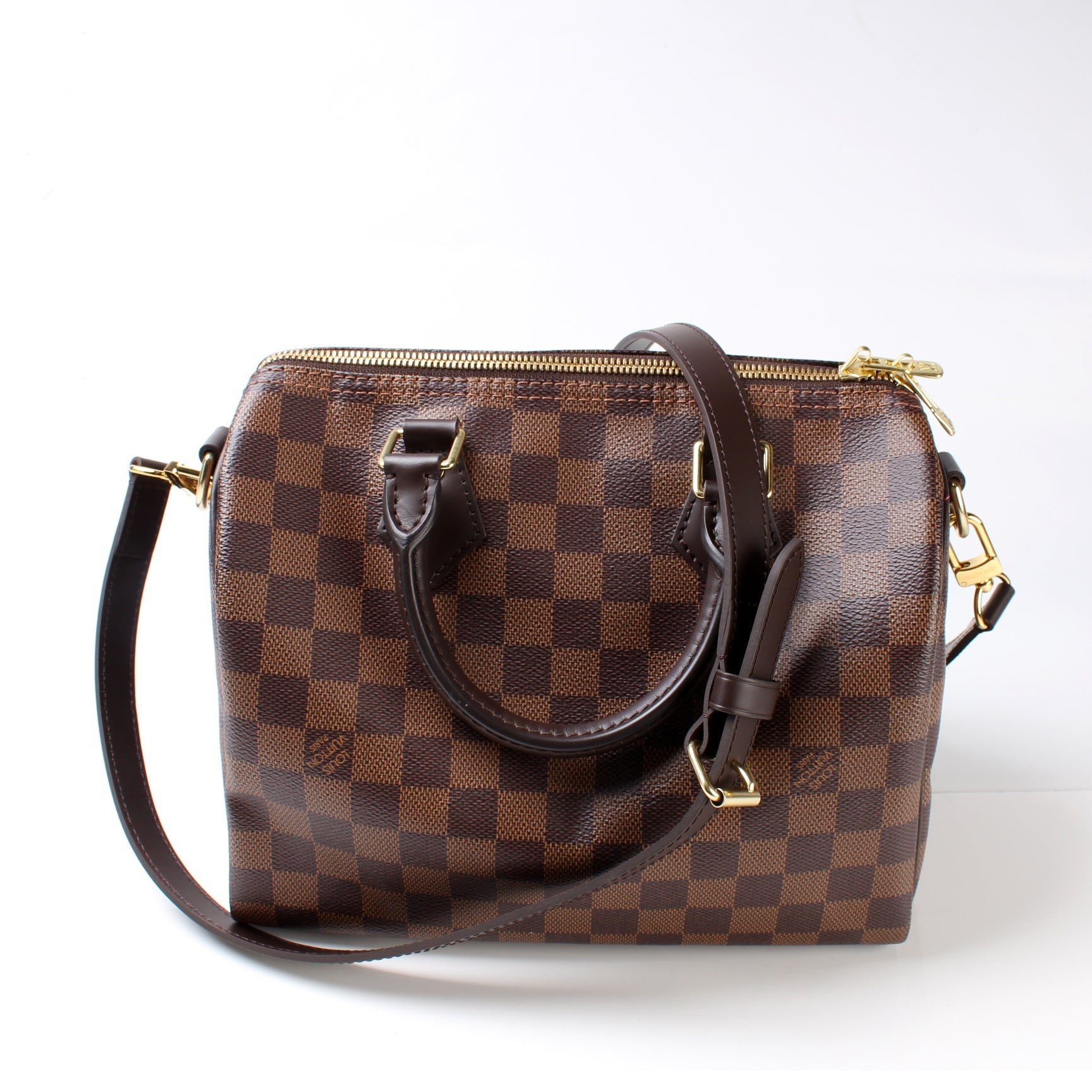 Louis Vuitton Speedy 25 Bandouliere. The exterior is in the classic Louis Vuitton Damier Ebene coated canvas.Â