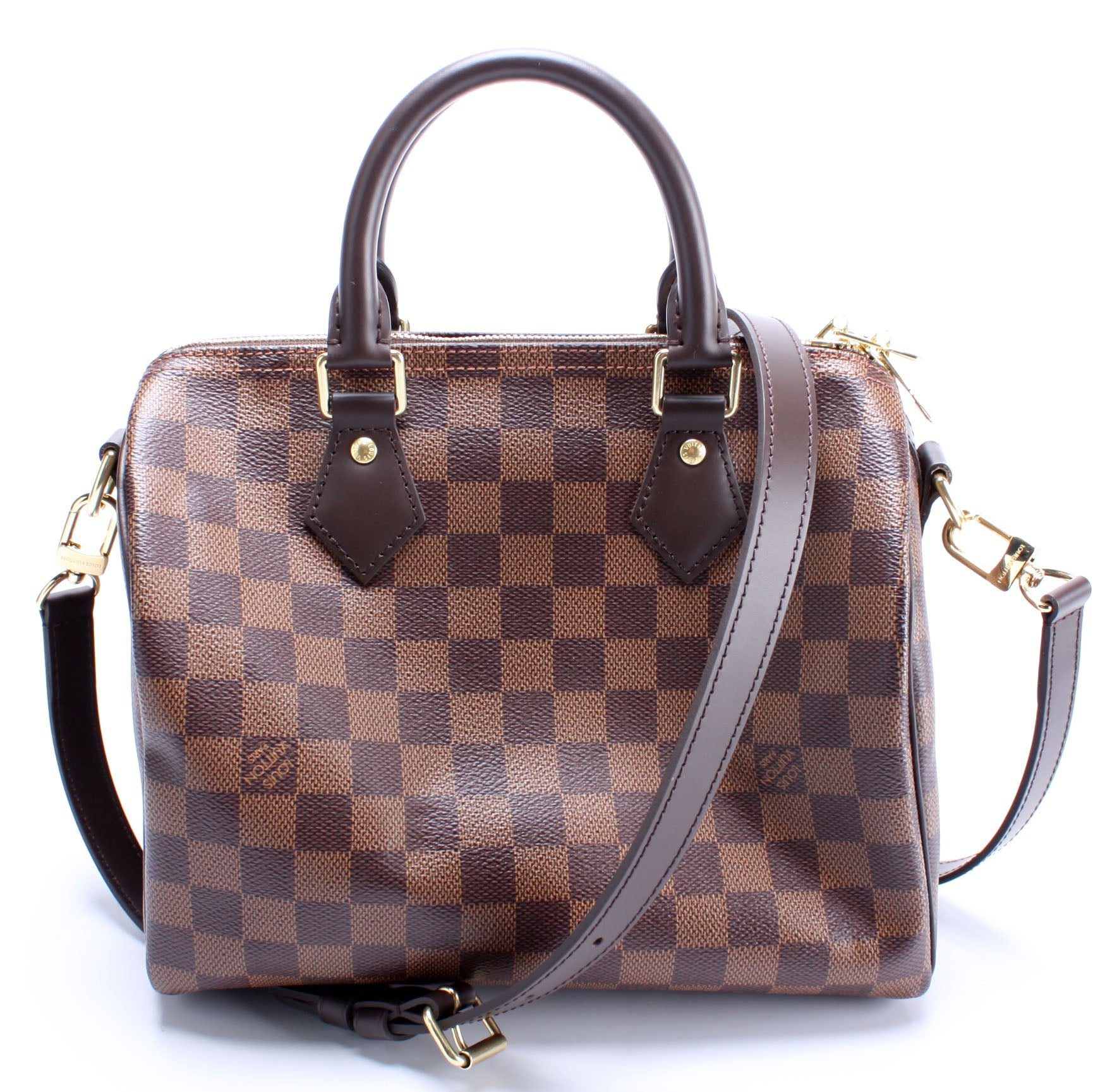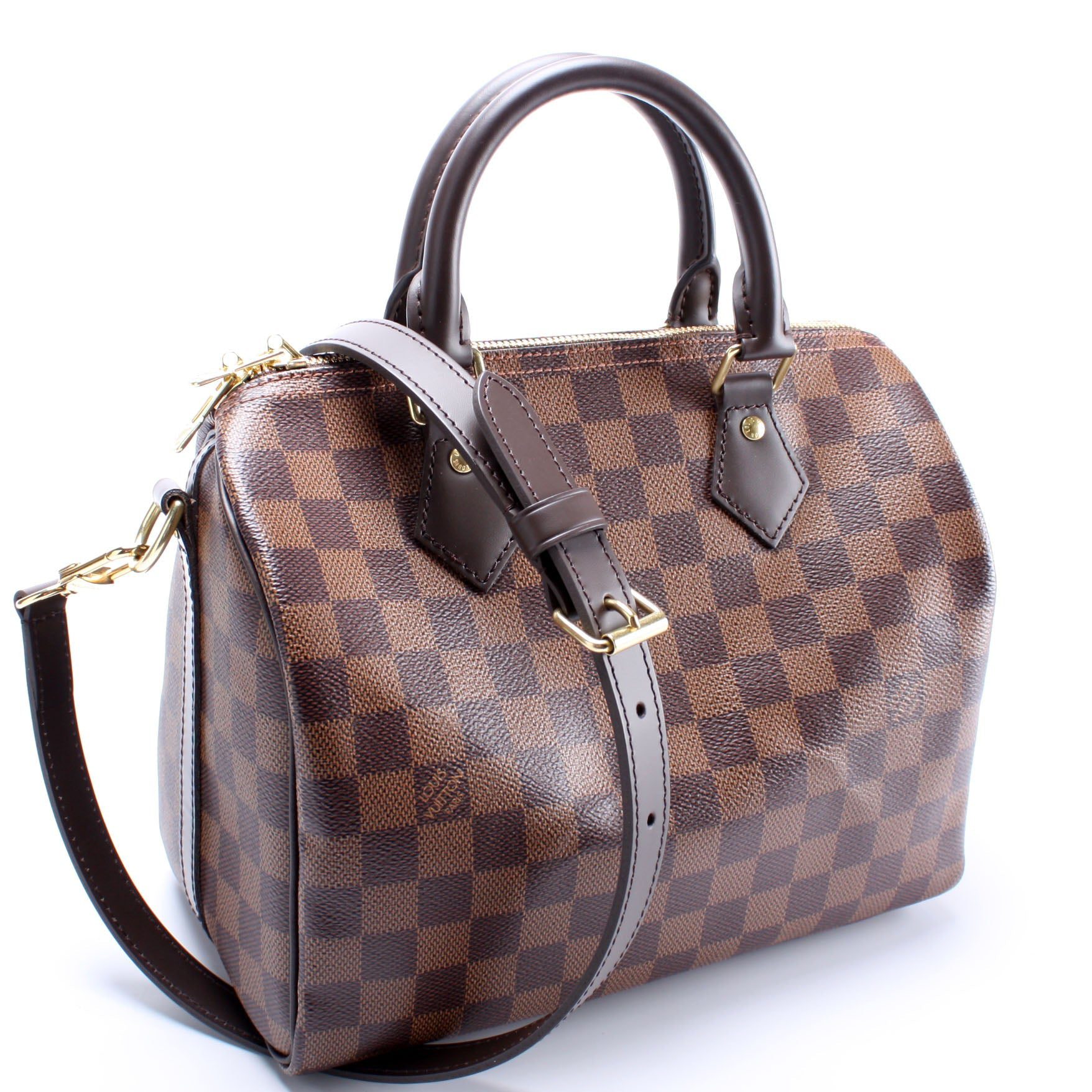Louis Vuitton Speedy 25. The exterior is in the classic Louis Vuitton Monogram coated canvas.Â