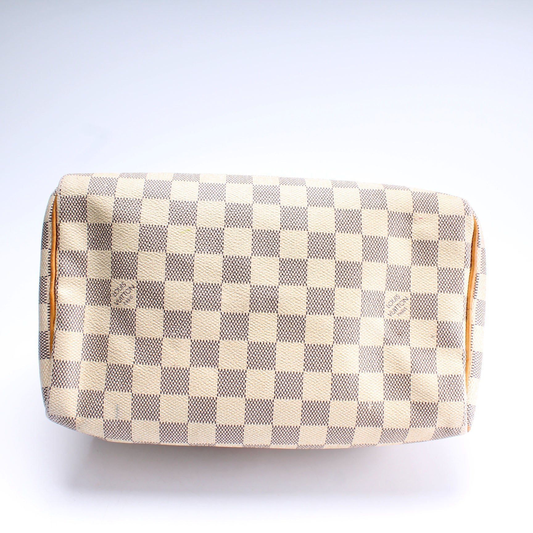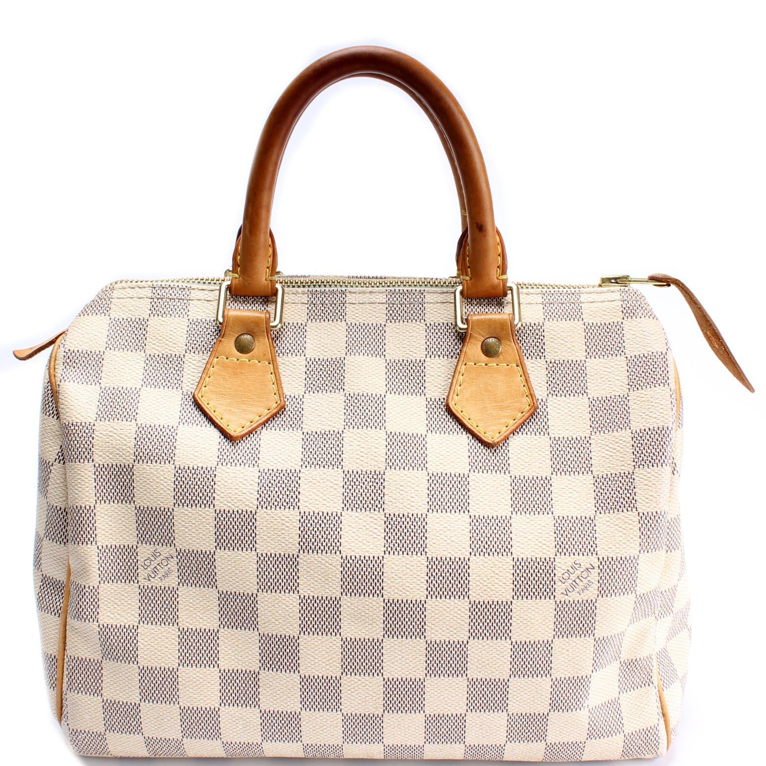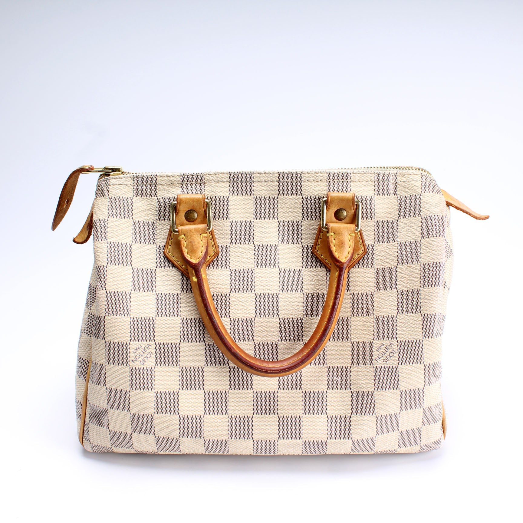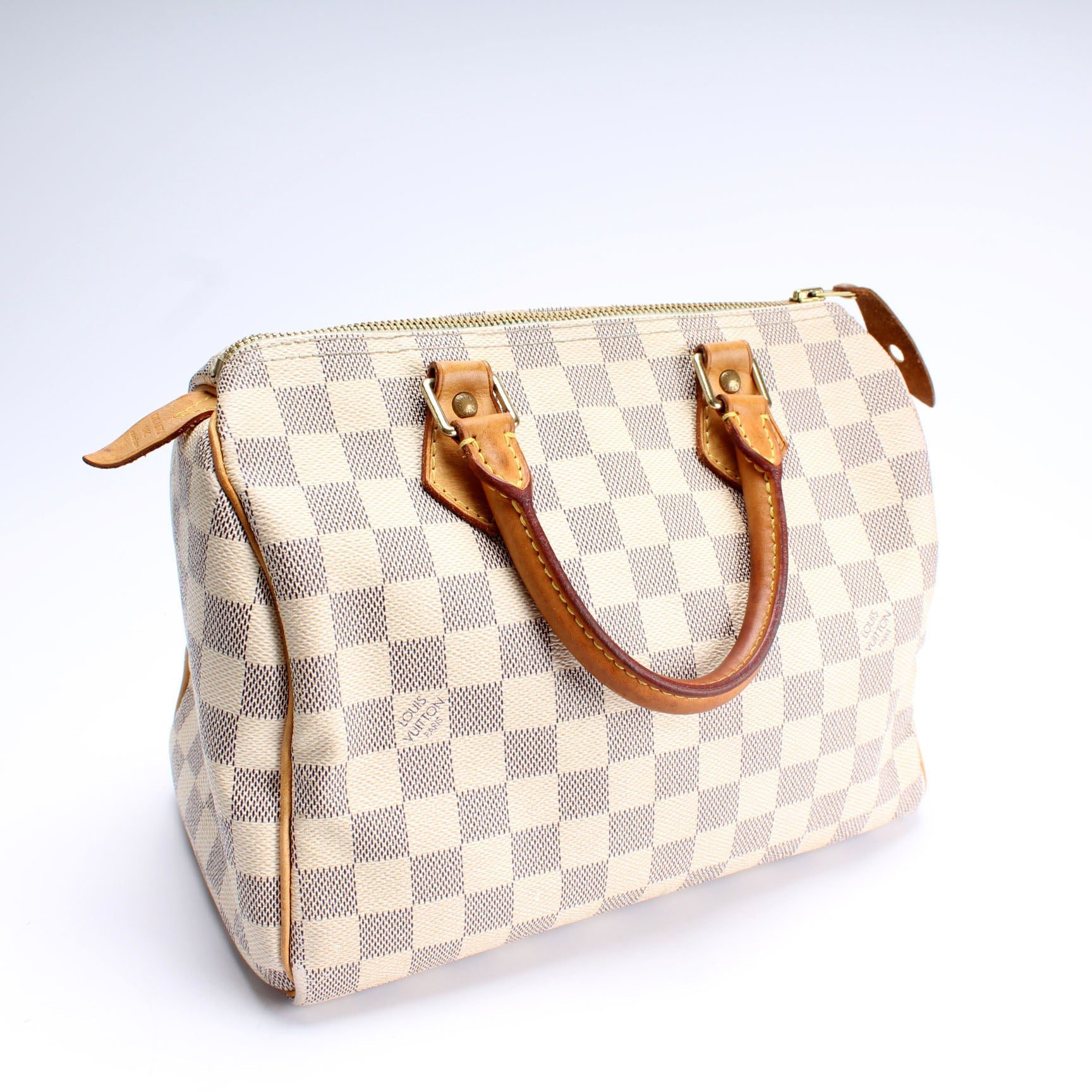 Louis Vuitton Speedy 25. The exterior is in the classic Louis Vuitton Damier Azur coated canvas.Â