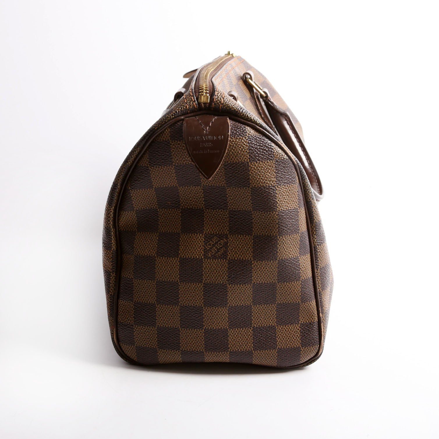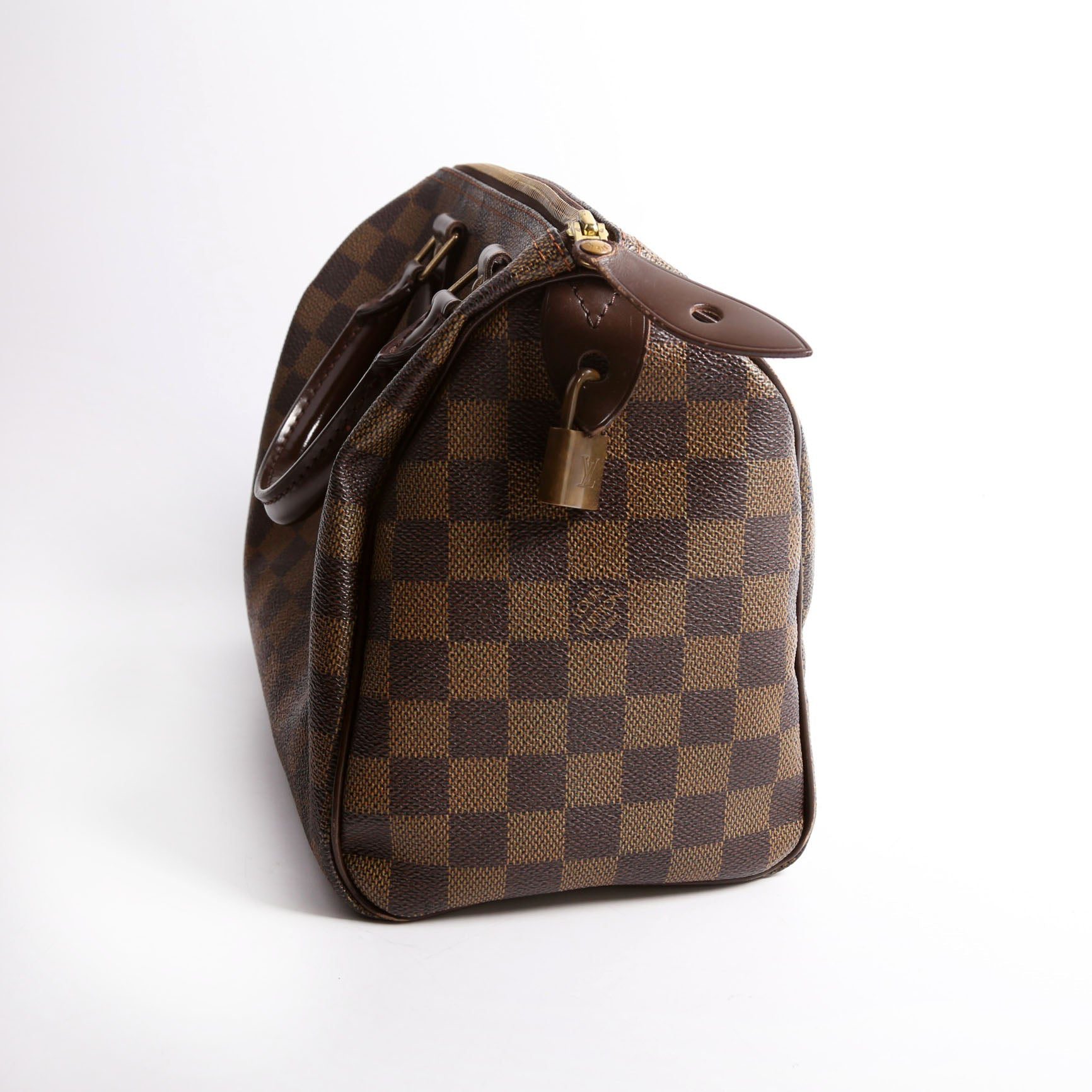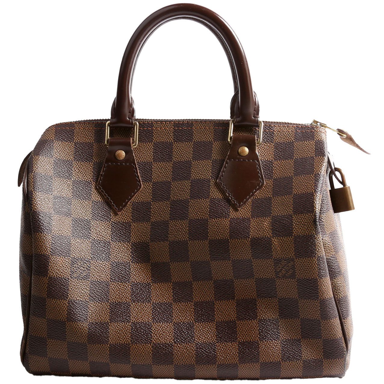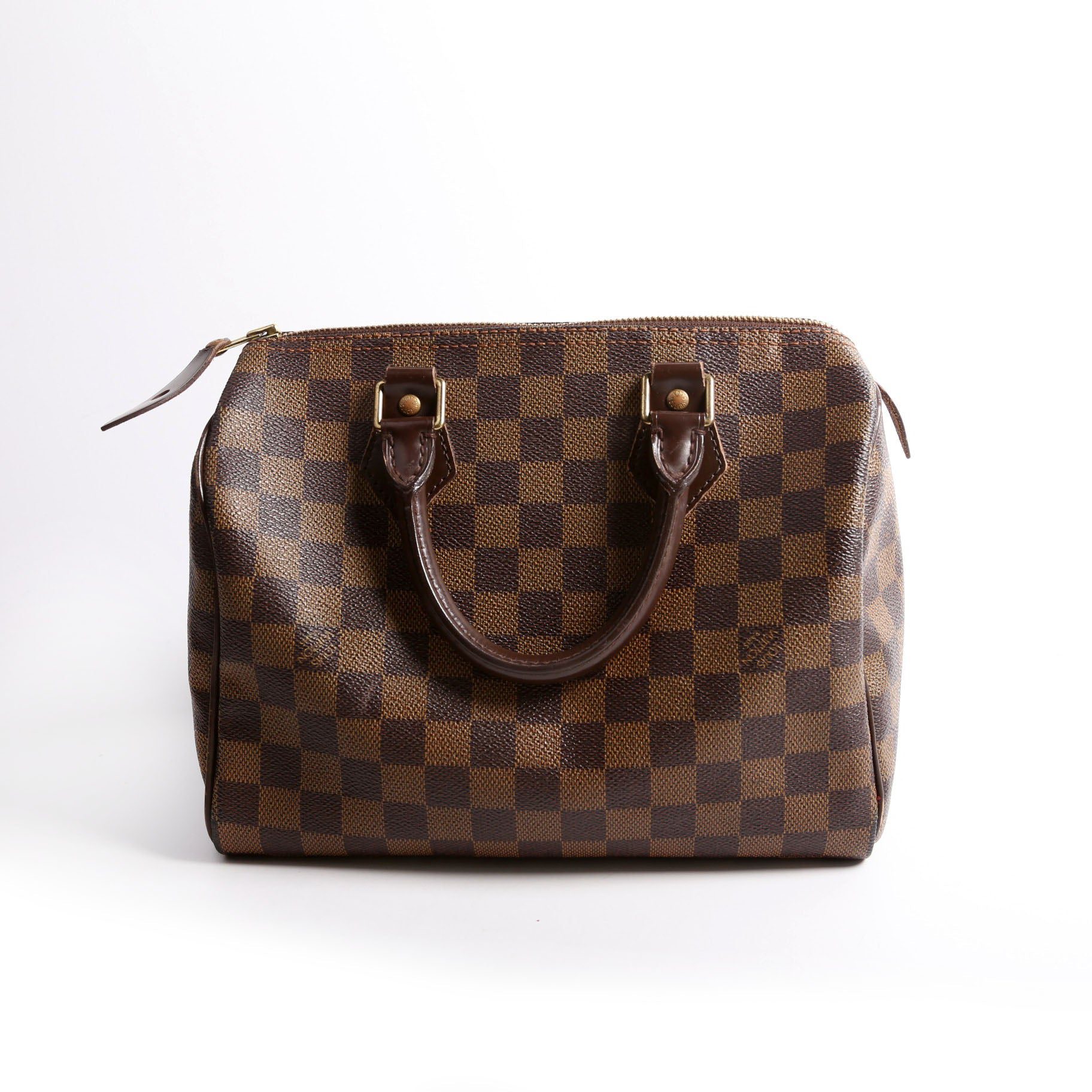 Louis Vuitton Speedy 25 . The exterior is in the classic Louis Vuitton Damier Ebene coated canvas.Â