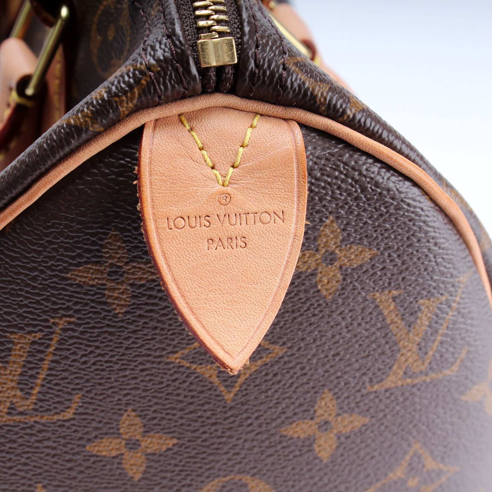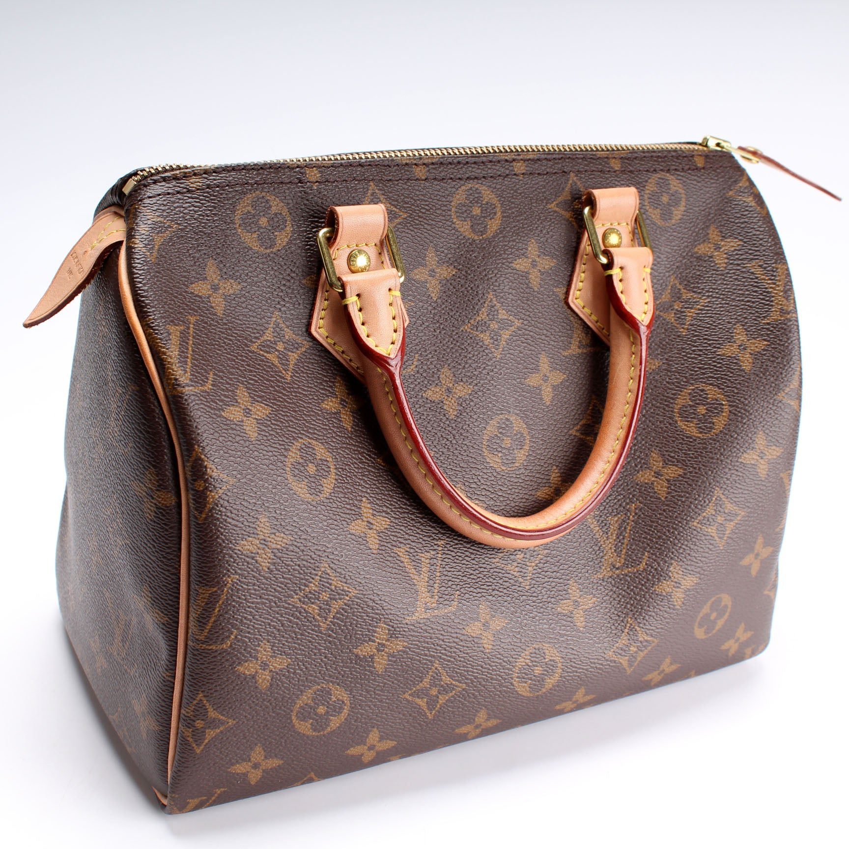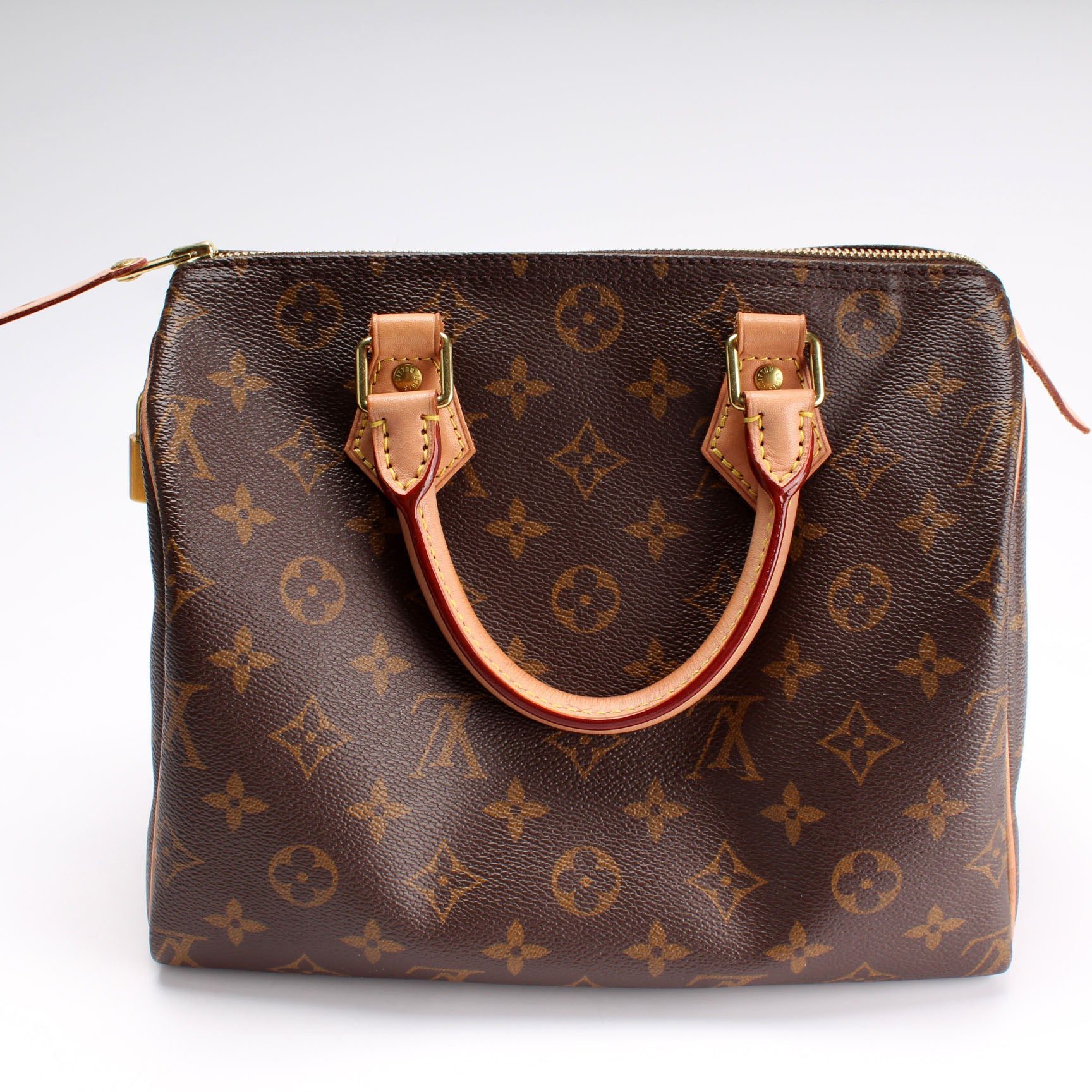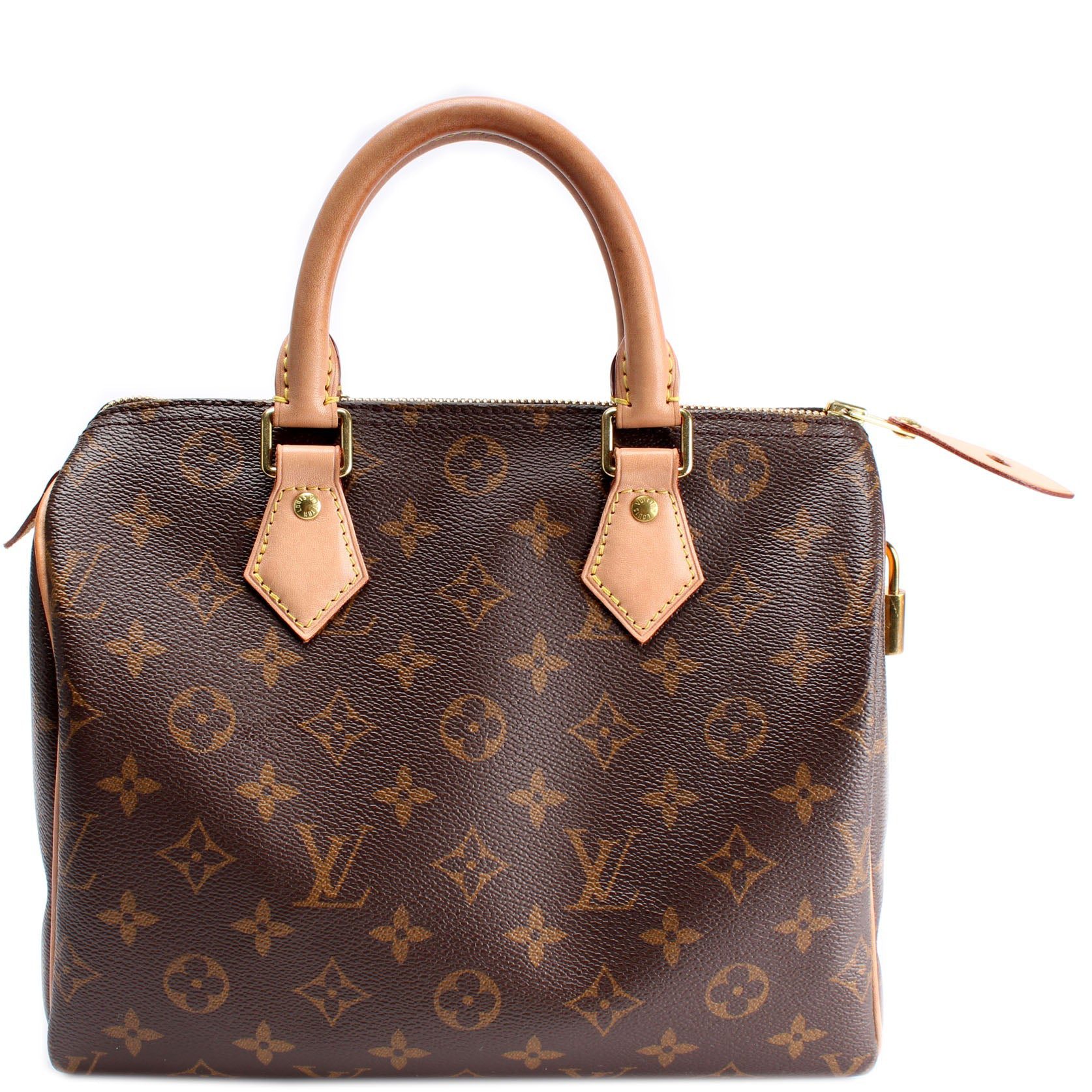Louis Vuitton Speedy 25. The exterior is in the classic Louis Vuitton Monogram coated canvas.Â