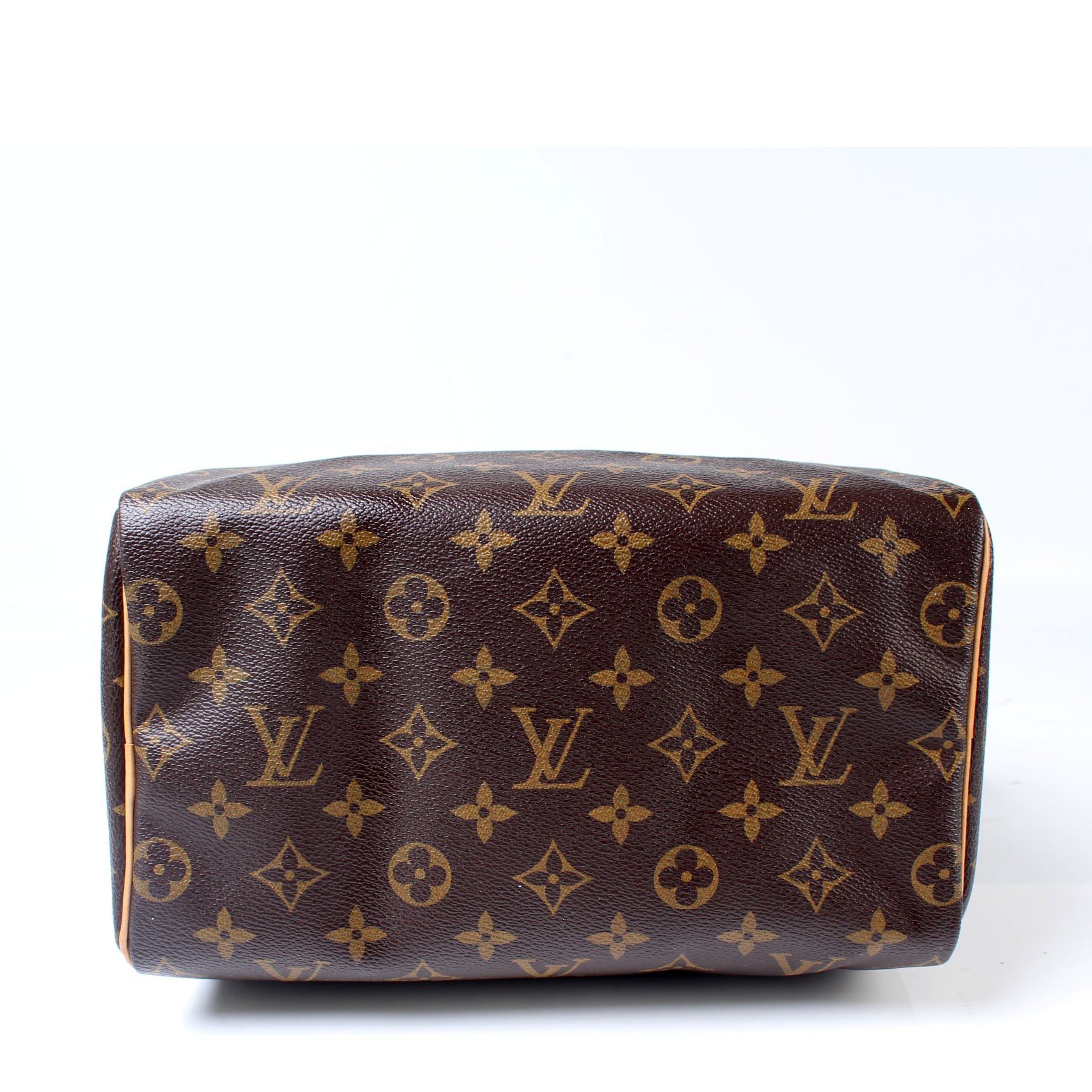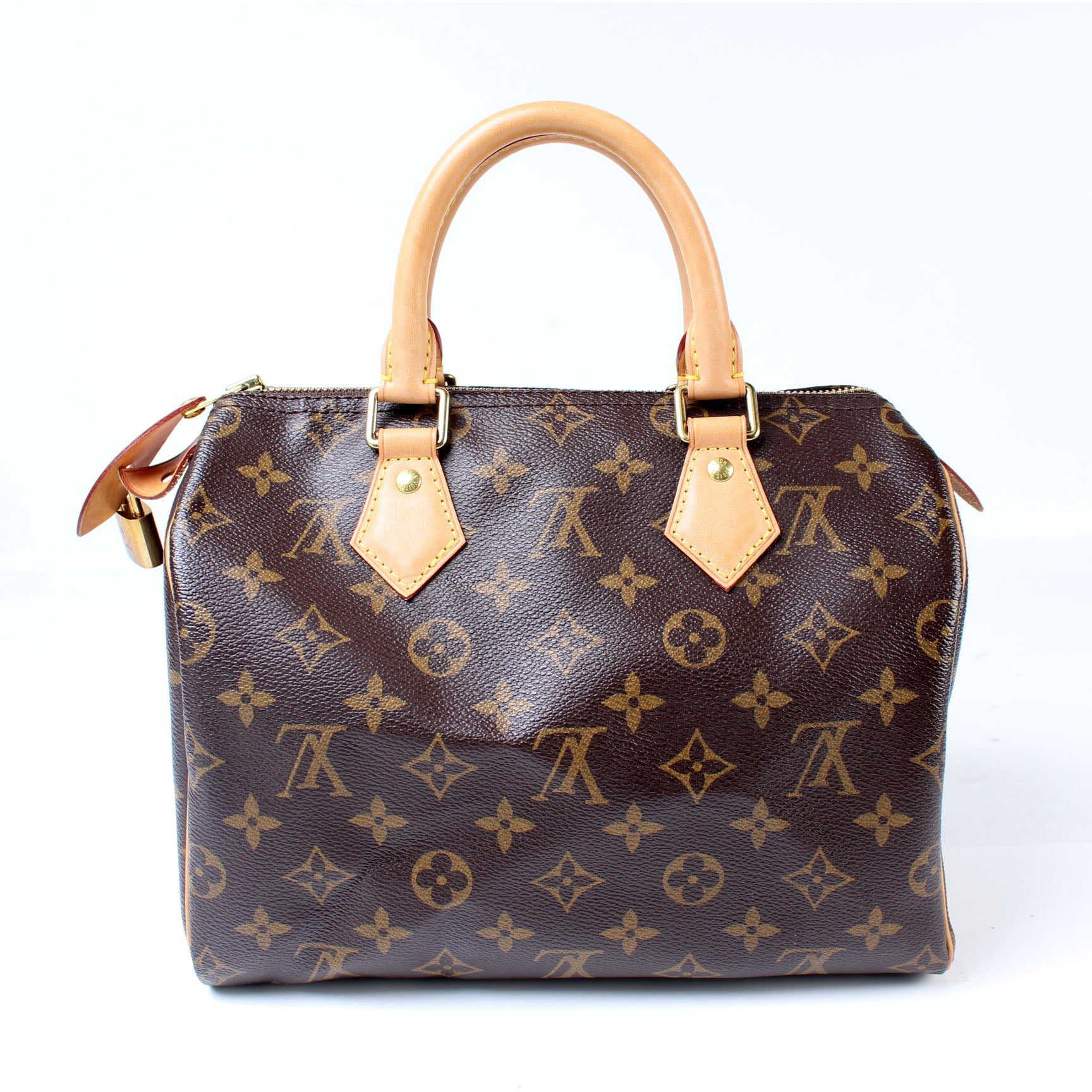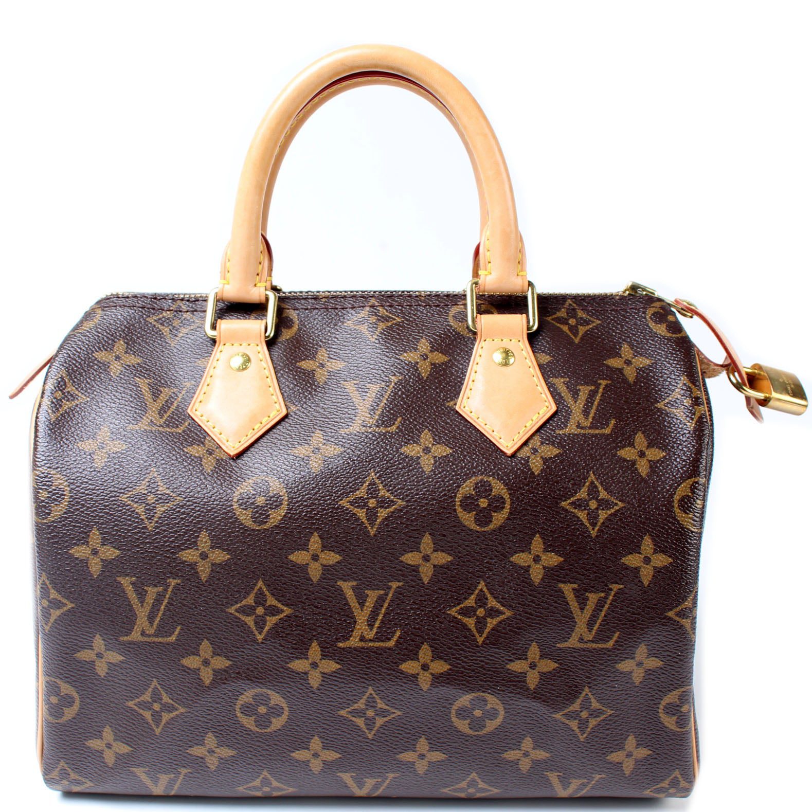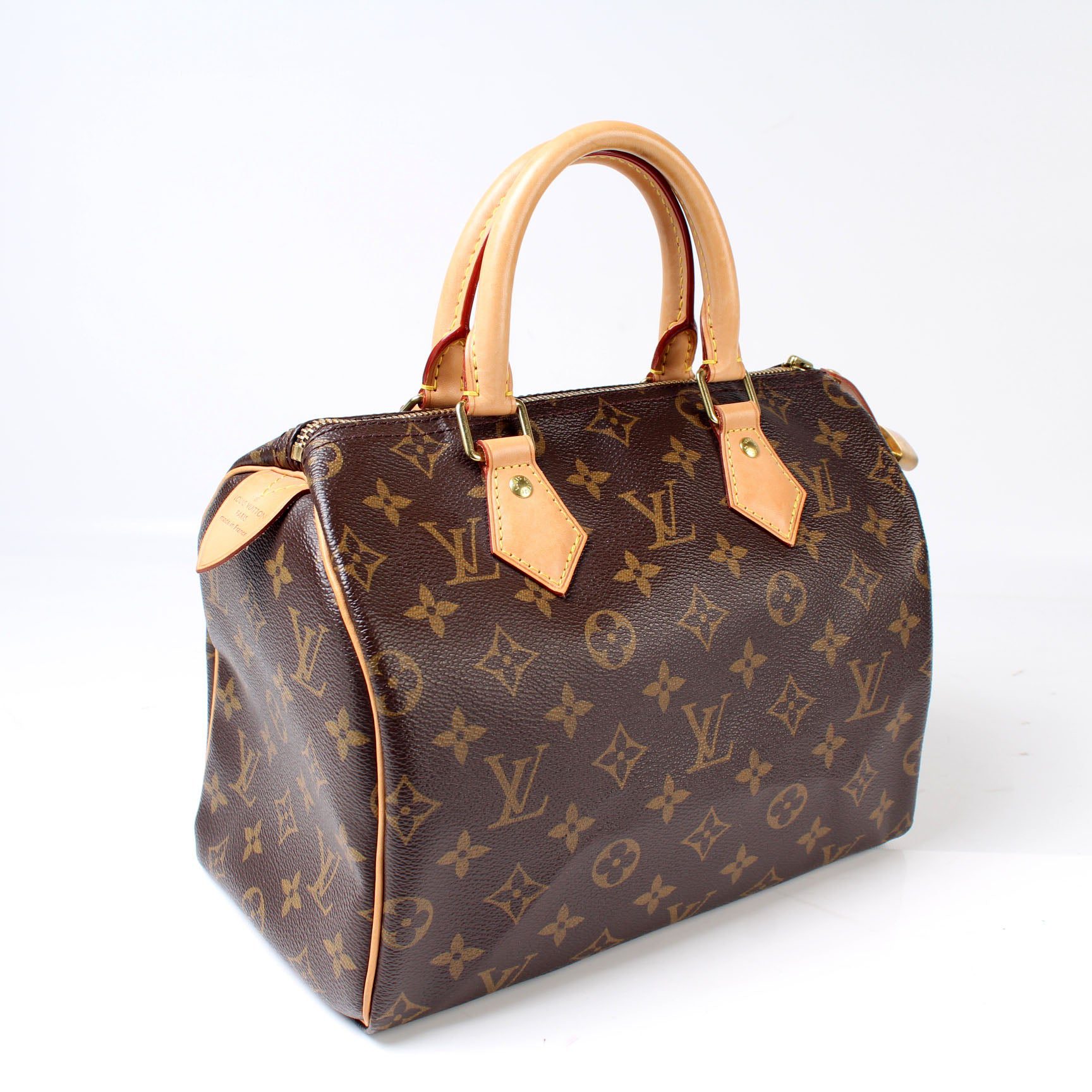 Louis Vuitton Speedy 25. The exterior is in the classic Louis Vuitton Monogram coated canvas.Â