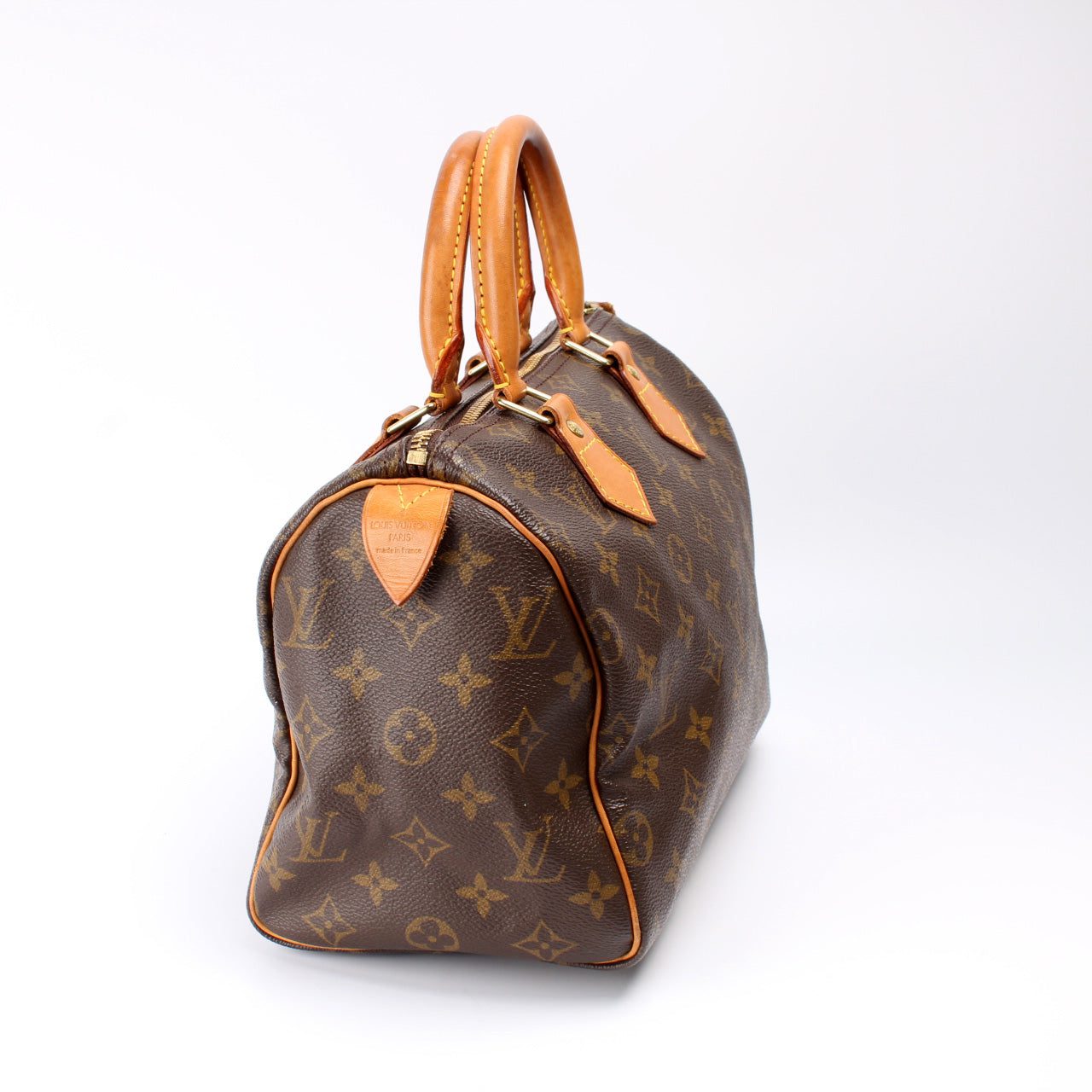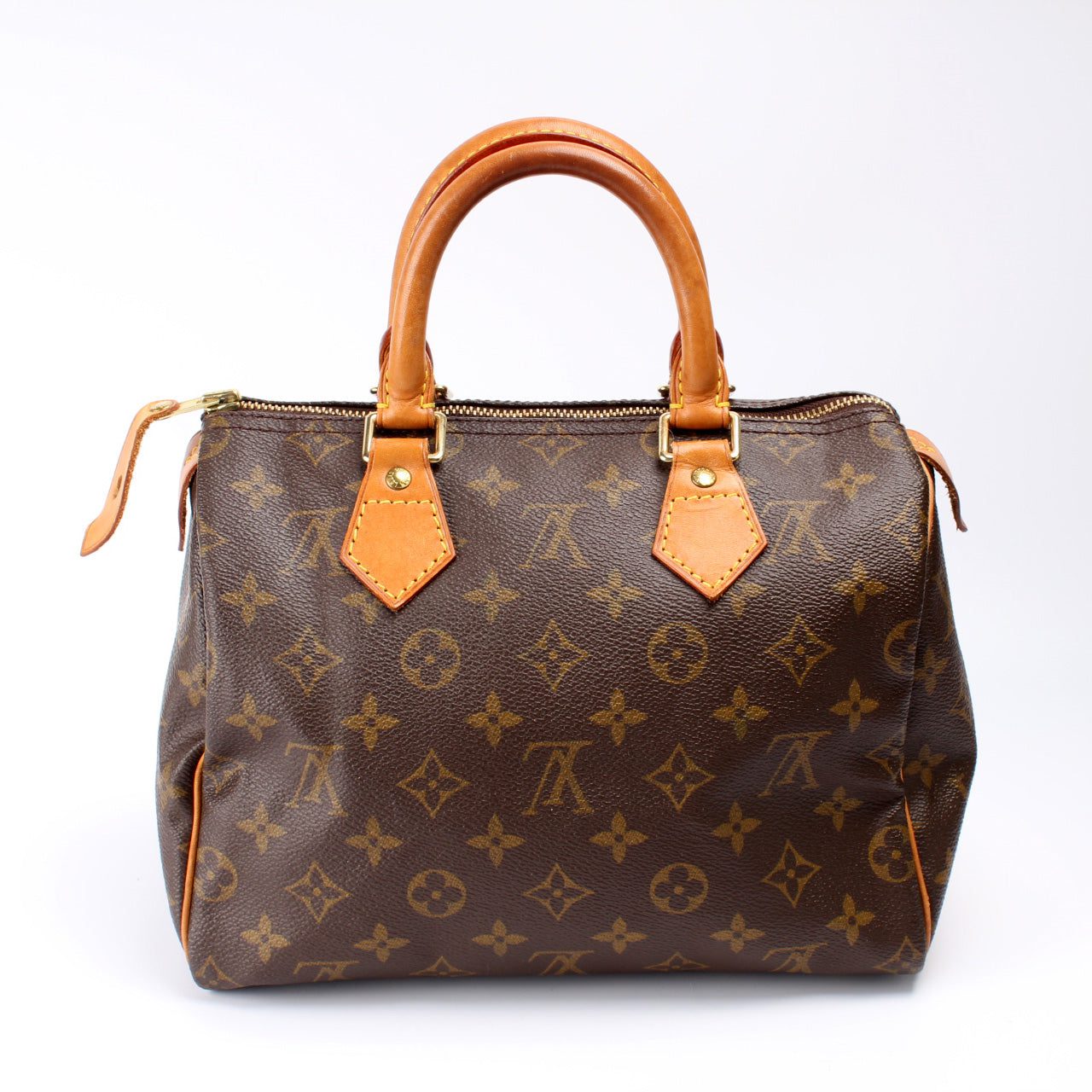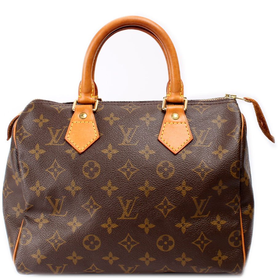 Louis Vuitton Speedy 25. The exterior is in the classic Louis Vuitton Monogram coated canvas.Â