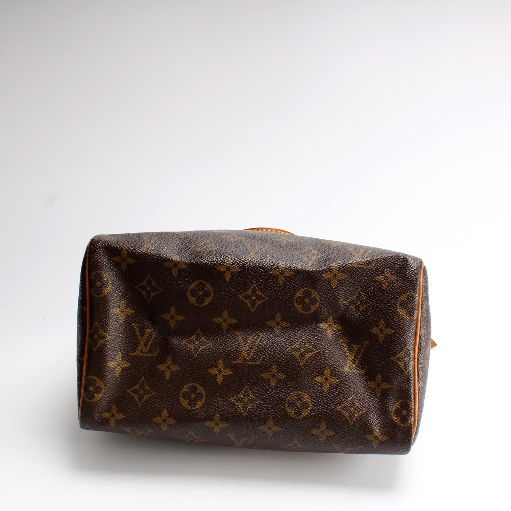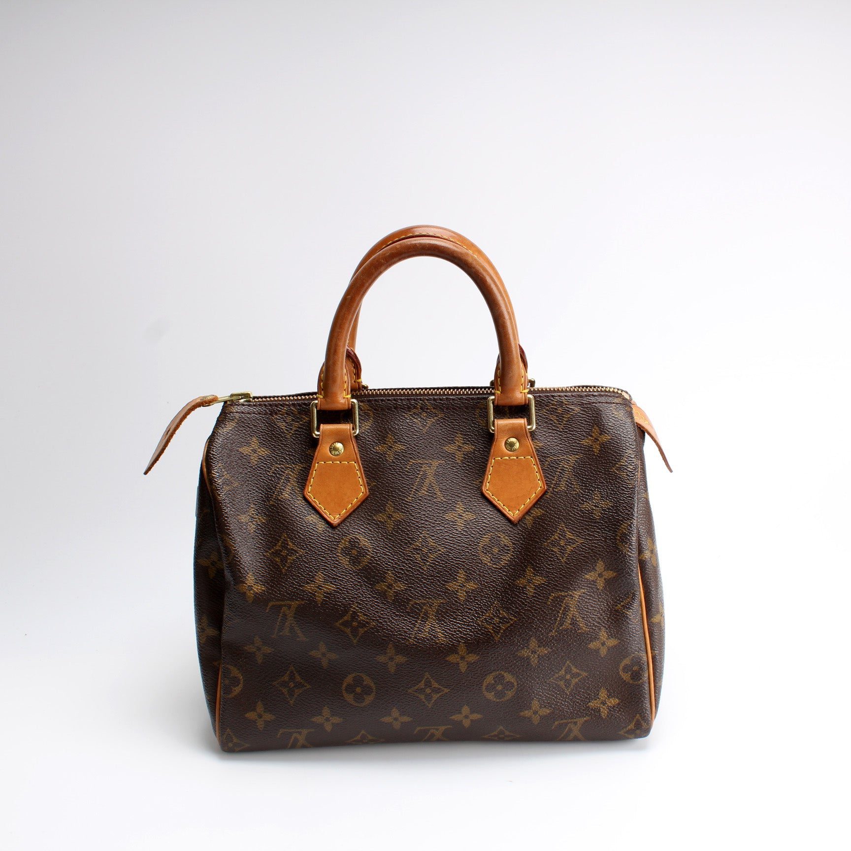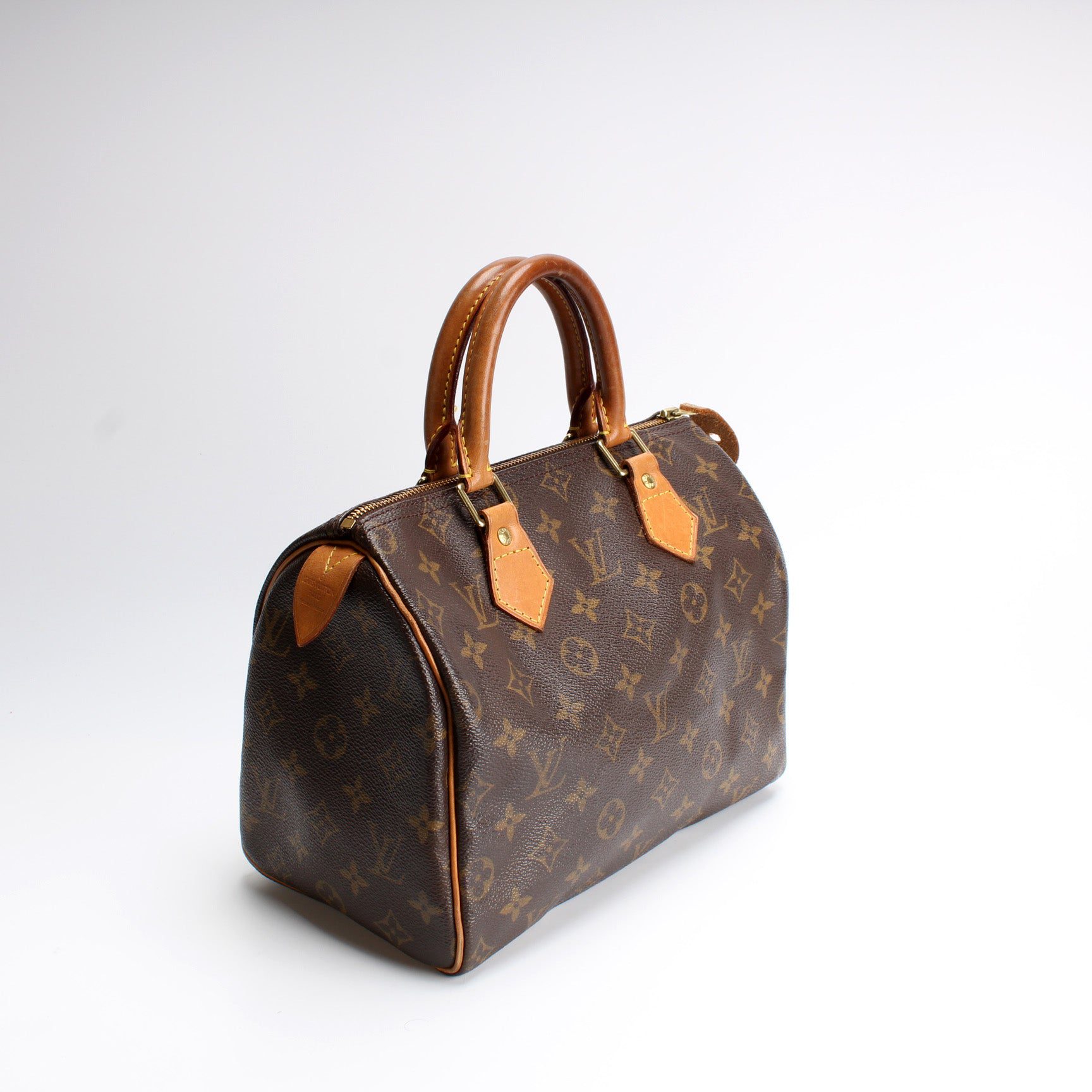Louis Vuitton Speedy 25. The exterior is in the classic Louis Vuitton Monogram coated canvas.Â