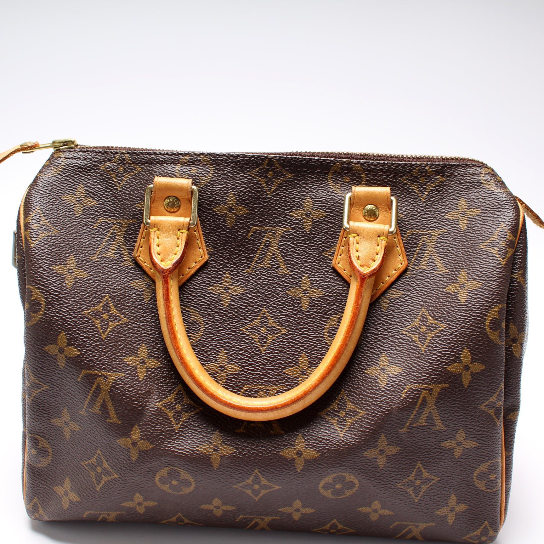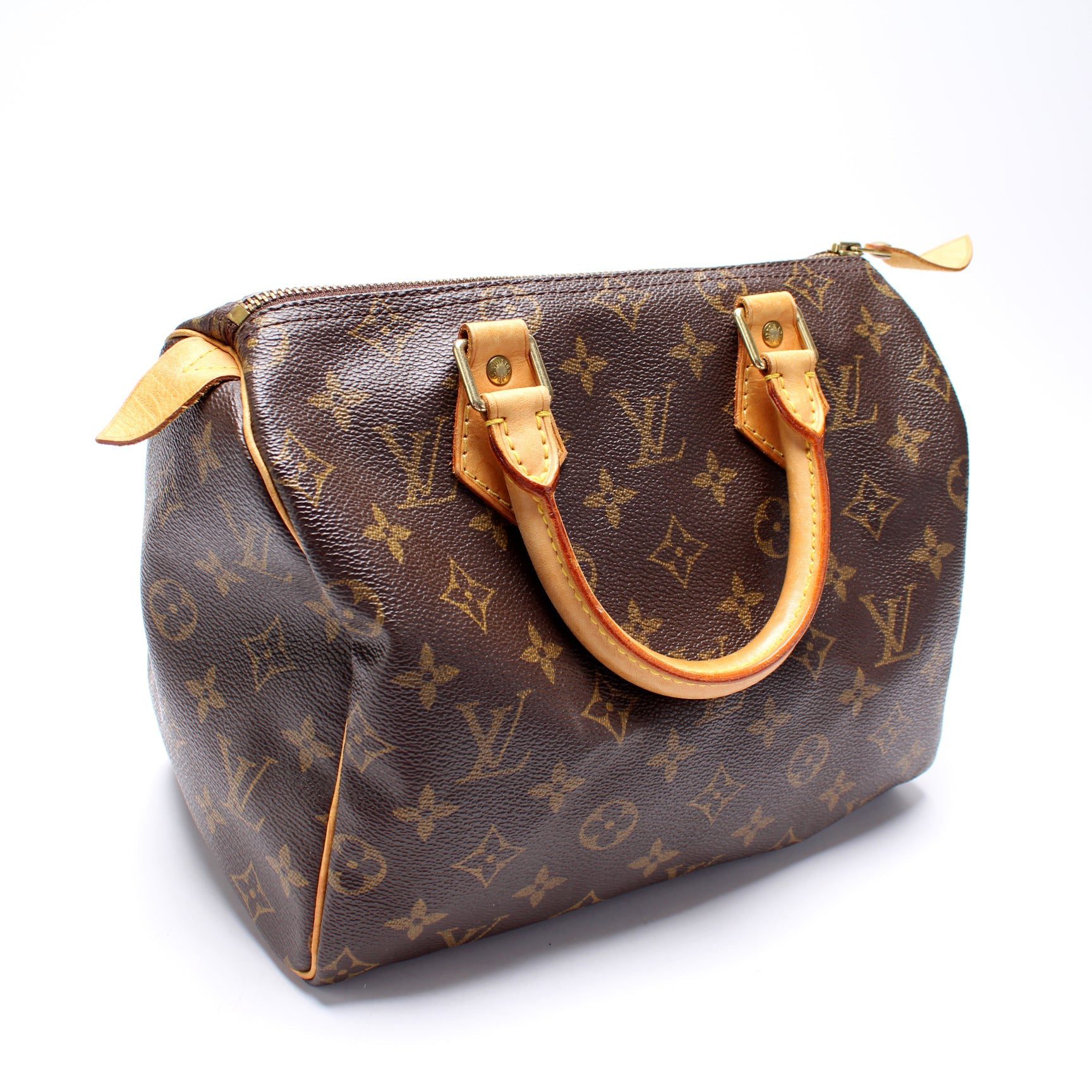 Louis Vuitton Speedy 25. The exterior is in the classic Louis Vuitton Monogram coated canvas.Â