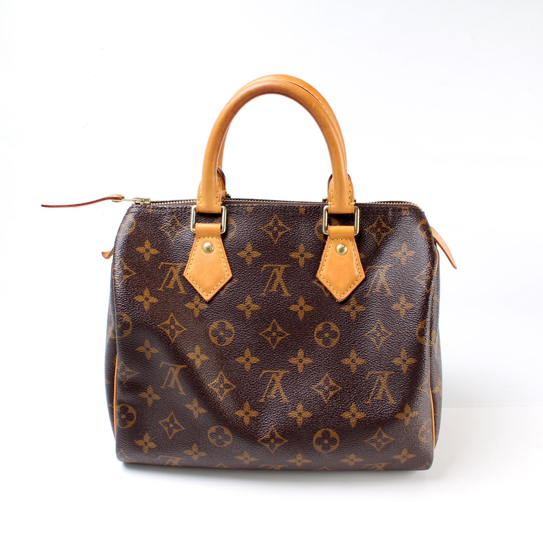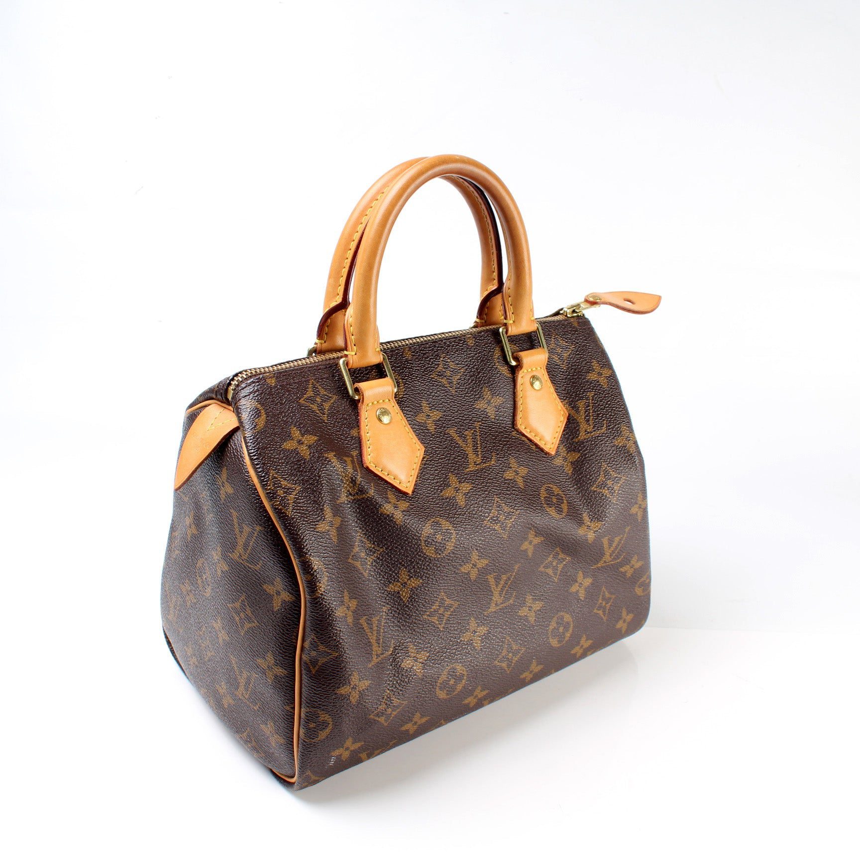 Louis Vuitton Speedy 25. The exterior is in the classic Louis Vuitton Monogram coated canvas.Â