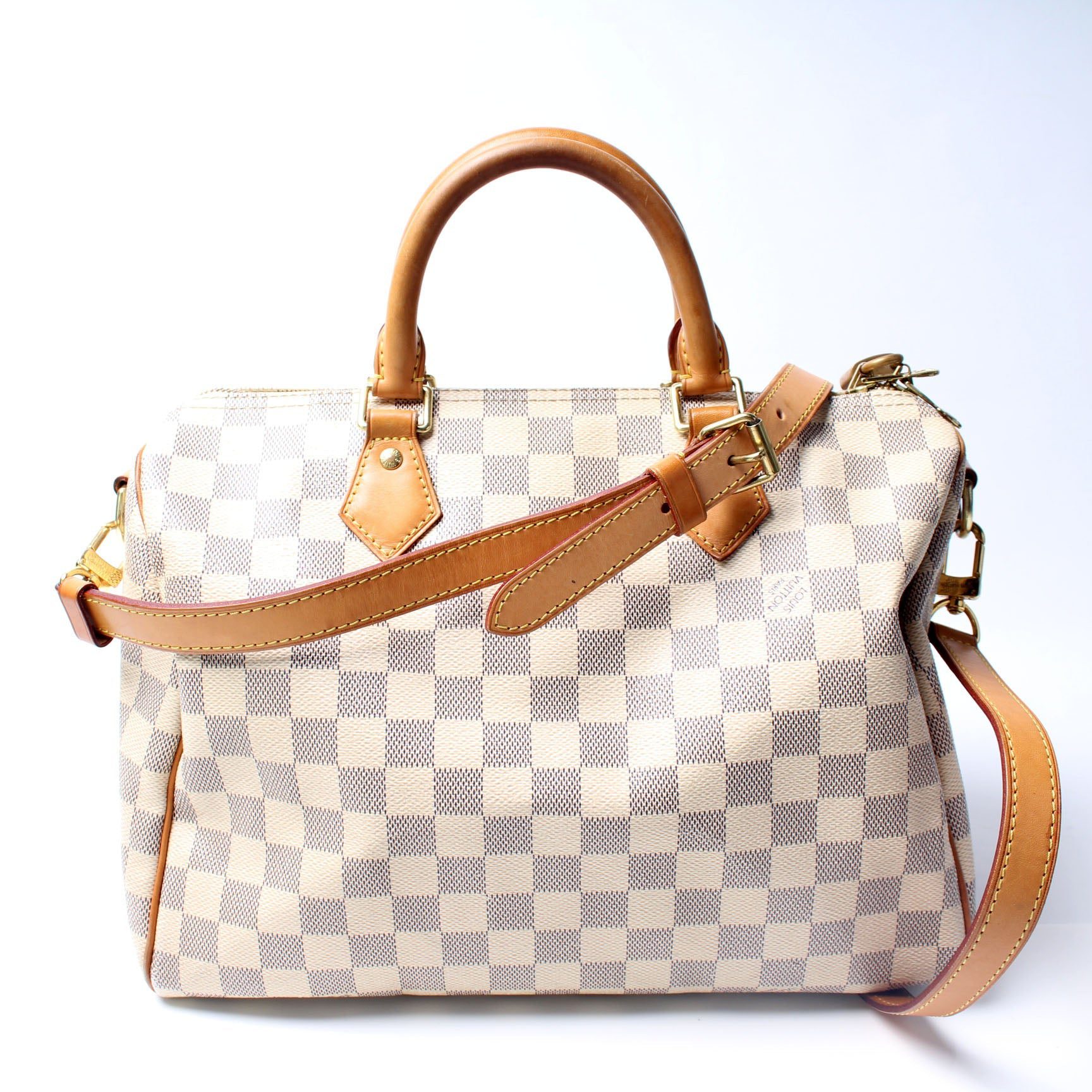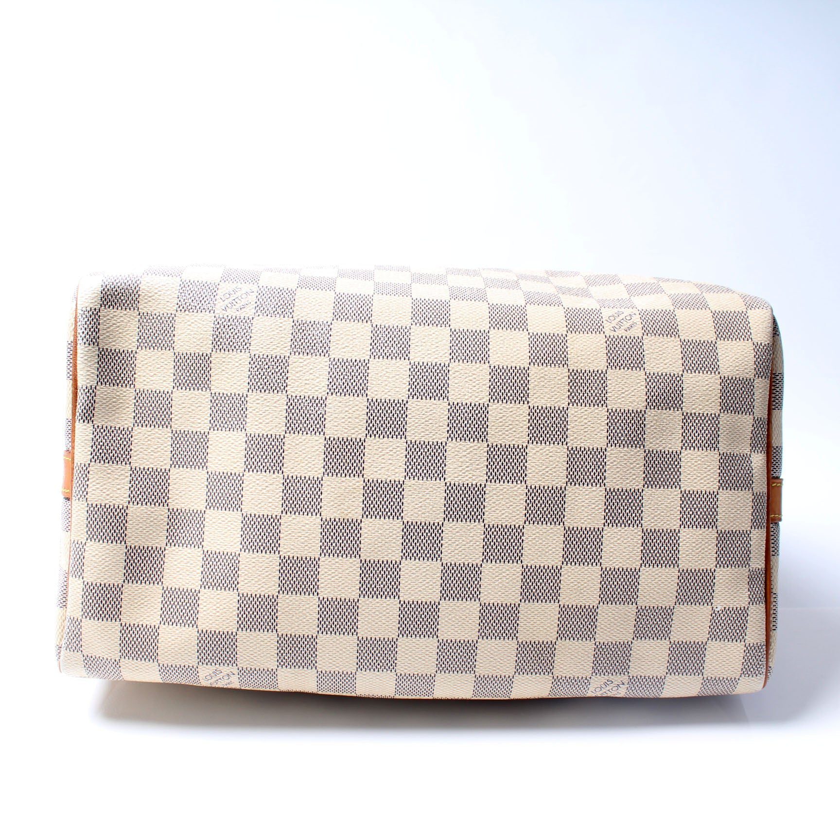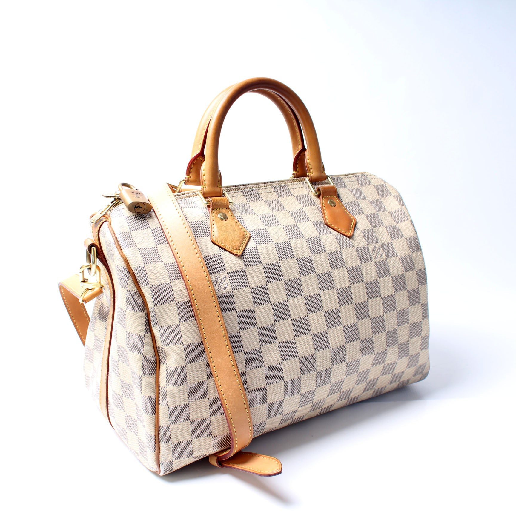 Louis Vuitton Speedy 30 Bandouliere. The exterior is in the classic Damier Azur coated canvas. Â