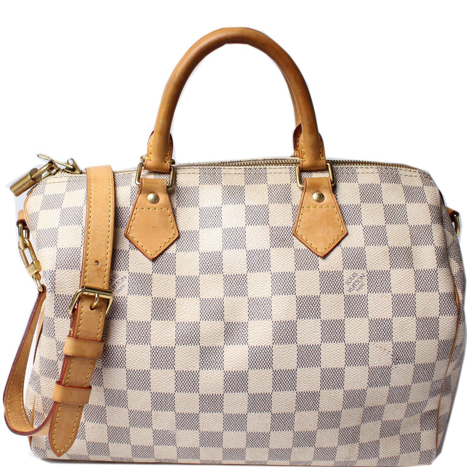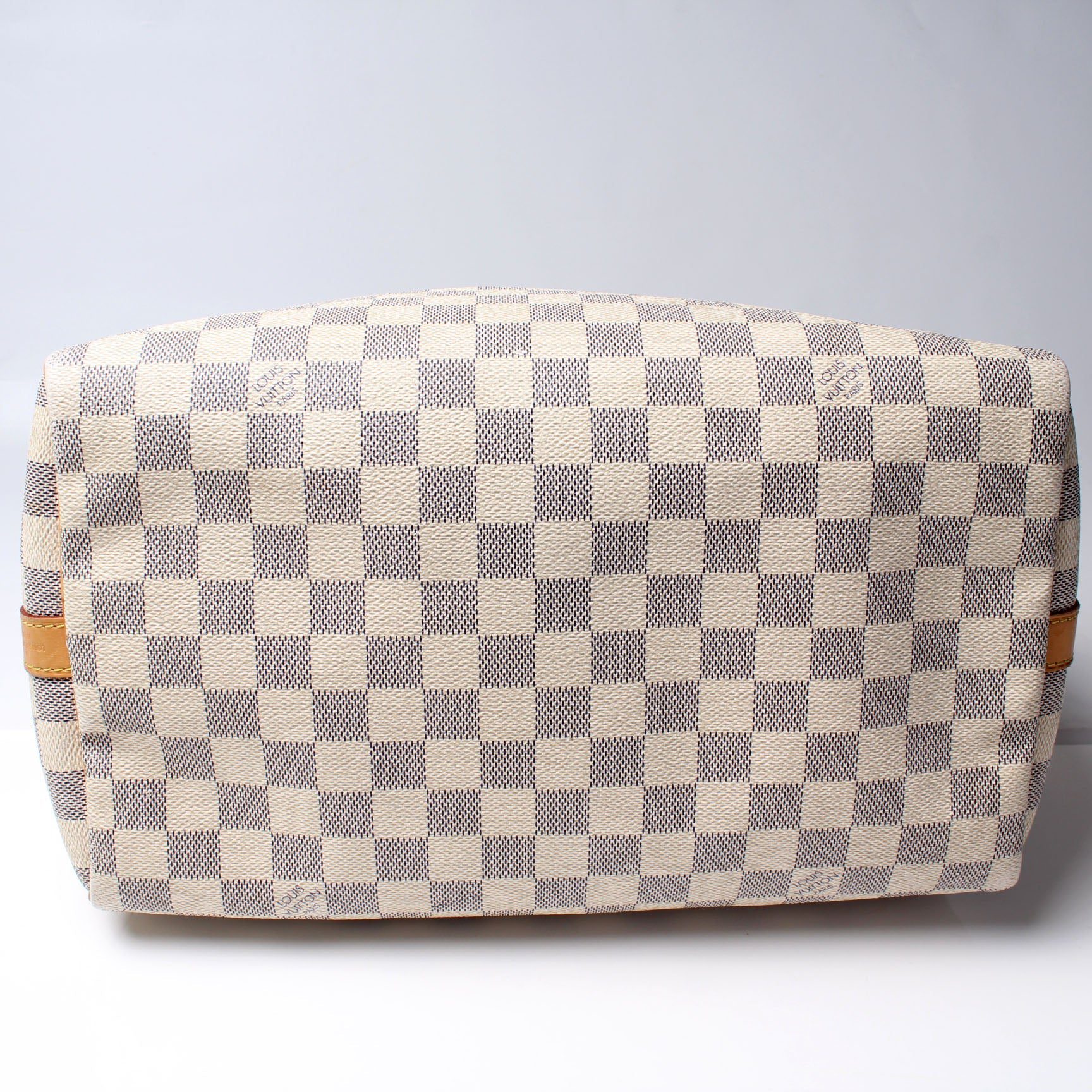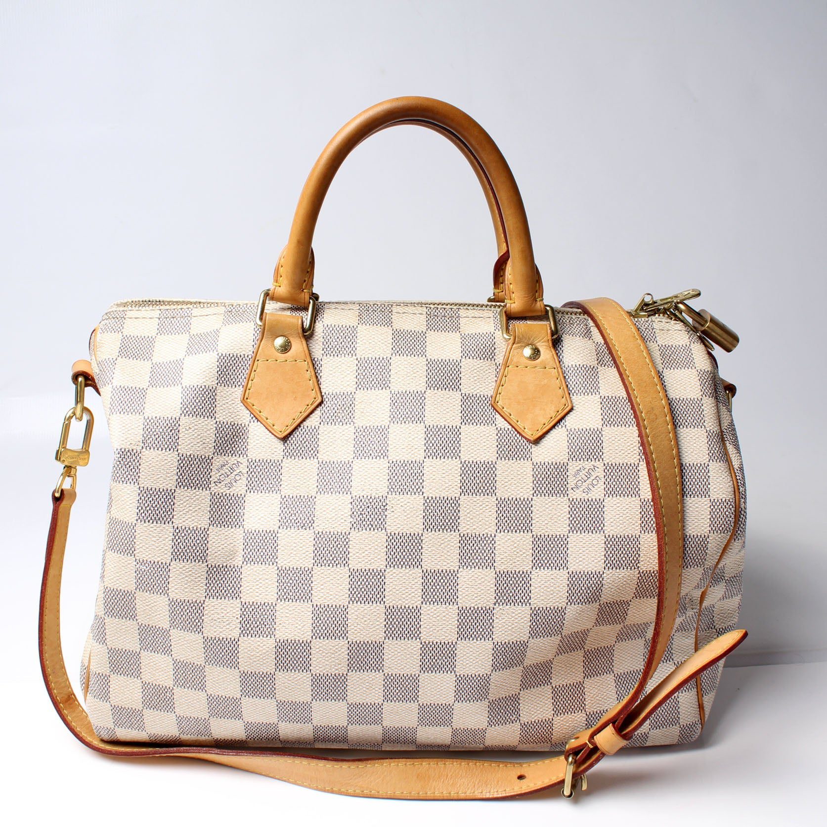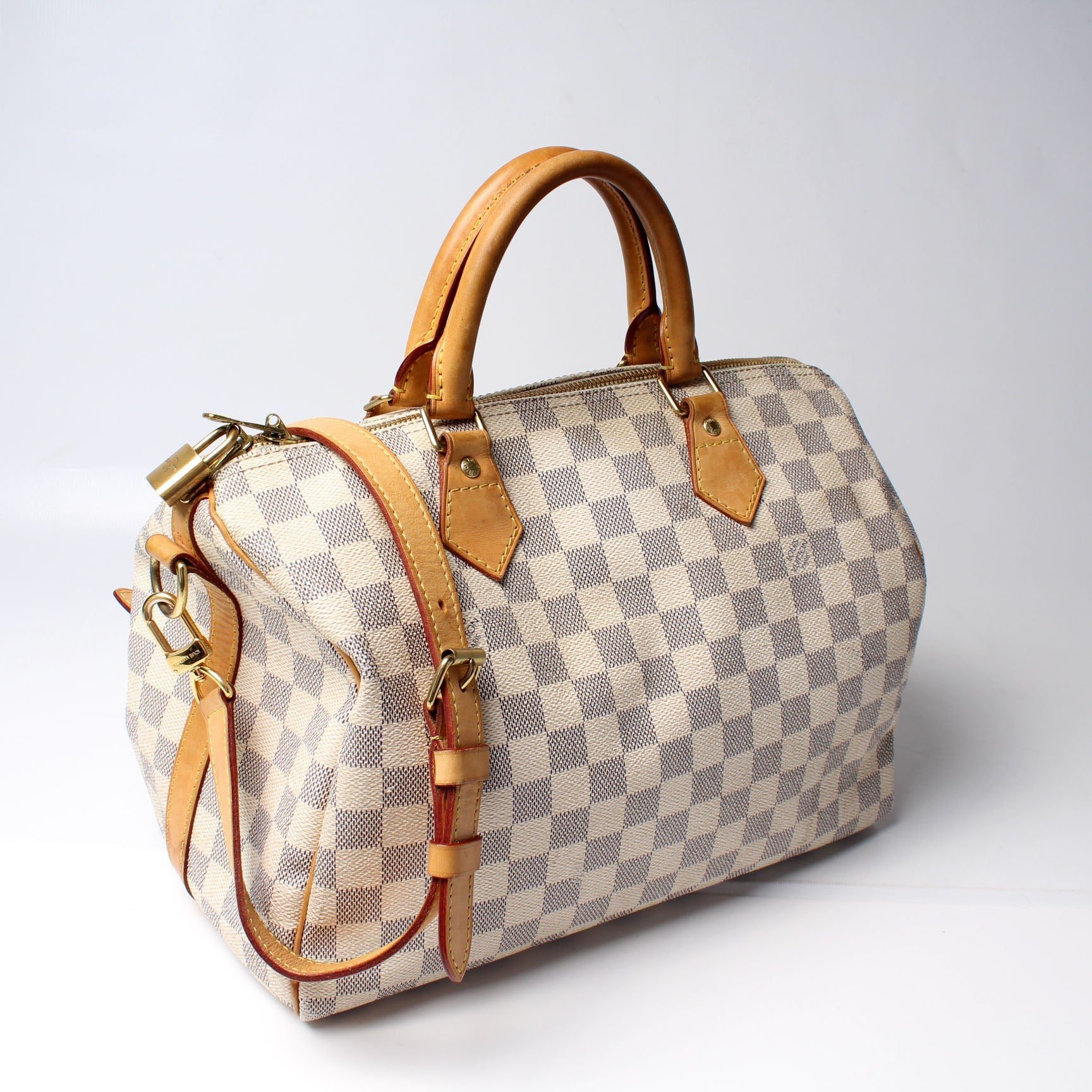 Louis Vuitton Speedy 30. The exterior is in the classic Damier Azur coated canvas. Â