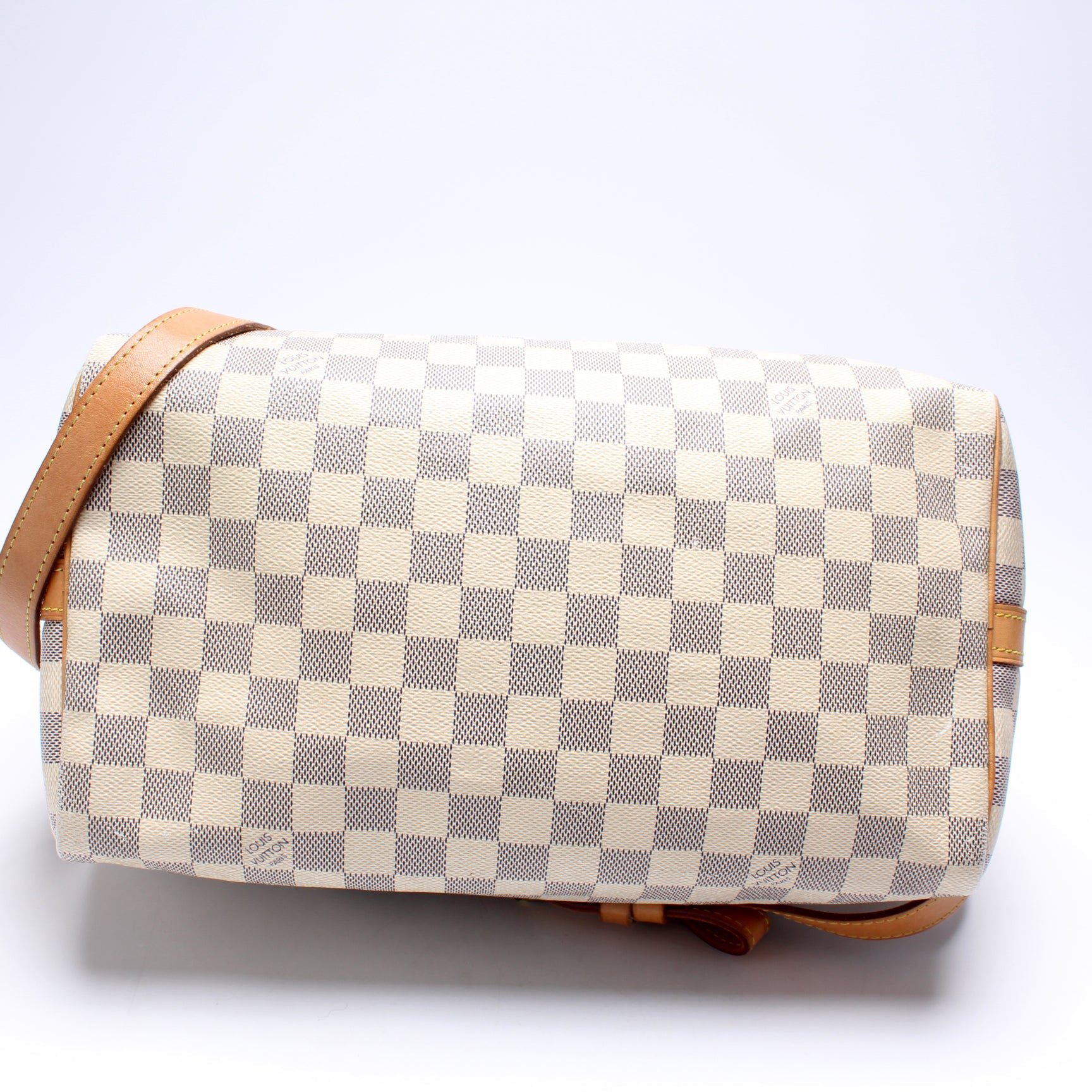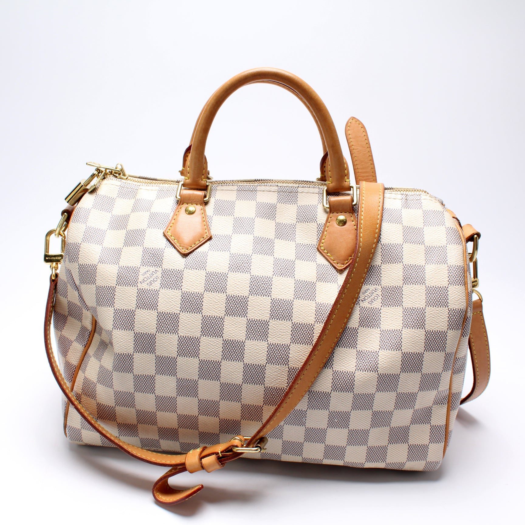 Louis Vuitton Speedy 30 Bandouliere. The exterior is in the classic Damier Azur coated canvas. Â