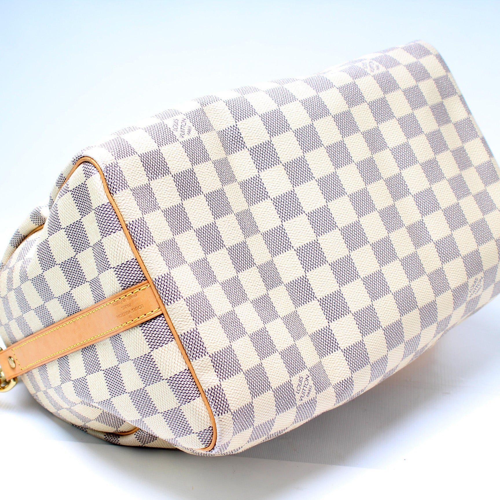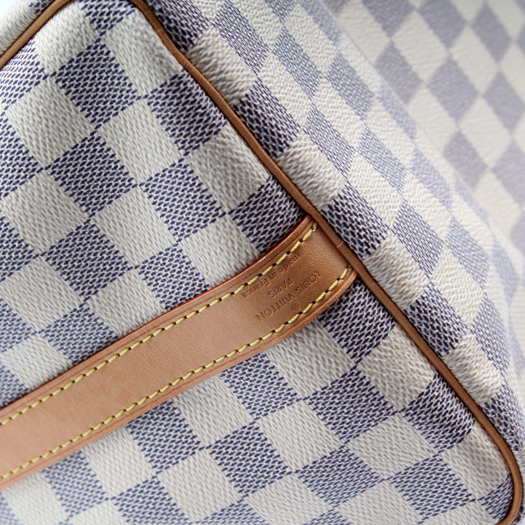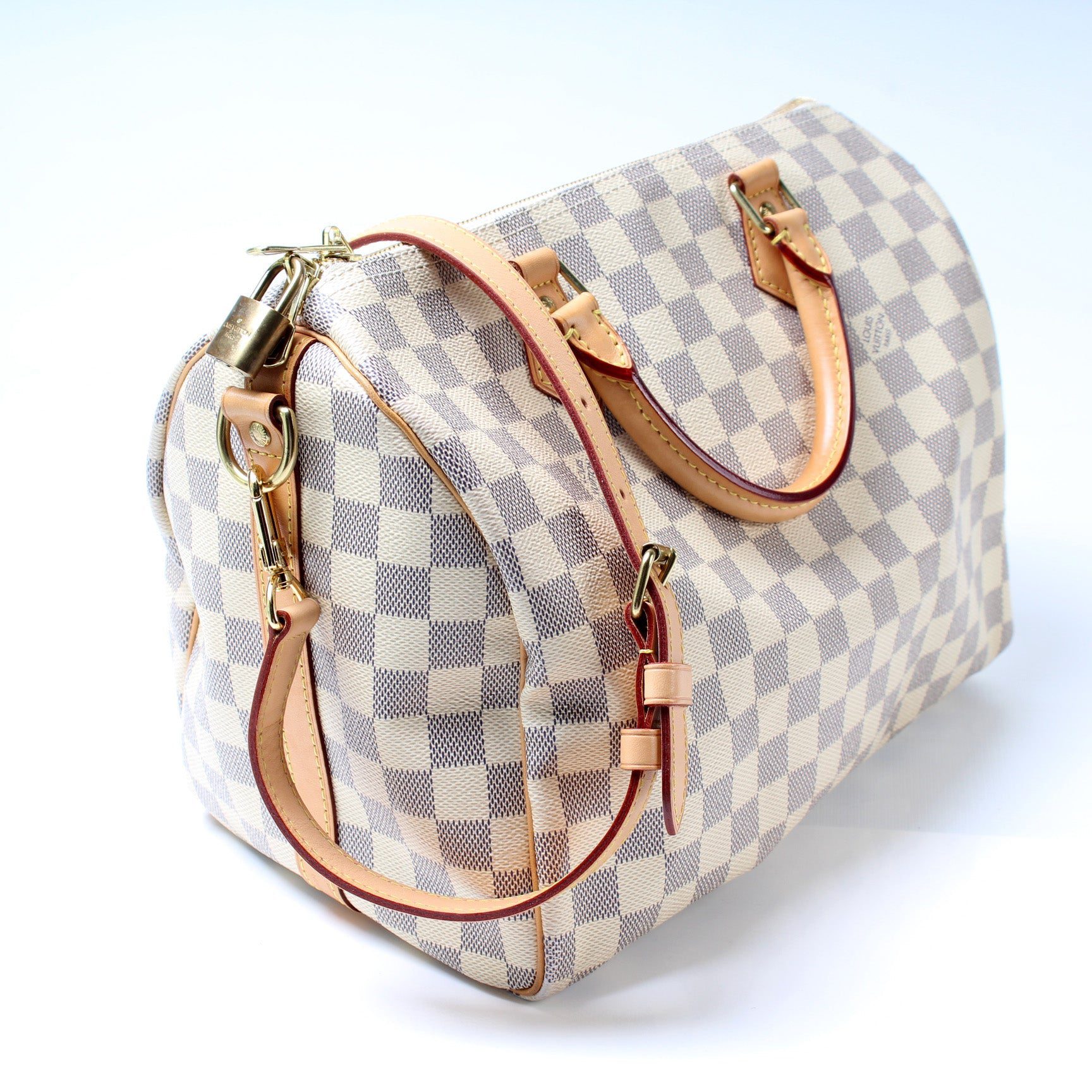 Louis Vuitton Speedy 30. The exterior is in the classic Damier Azur coated canvas. Â