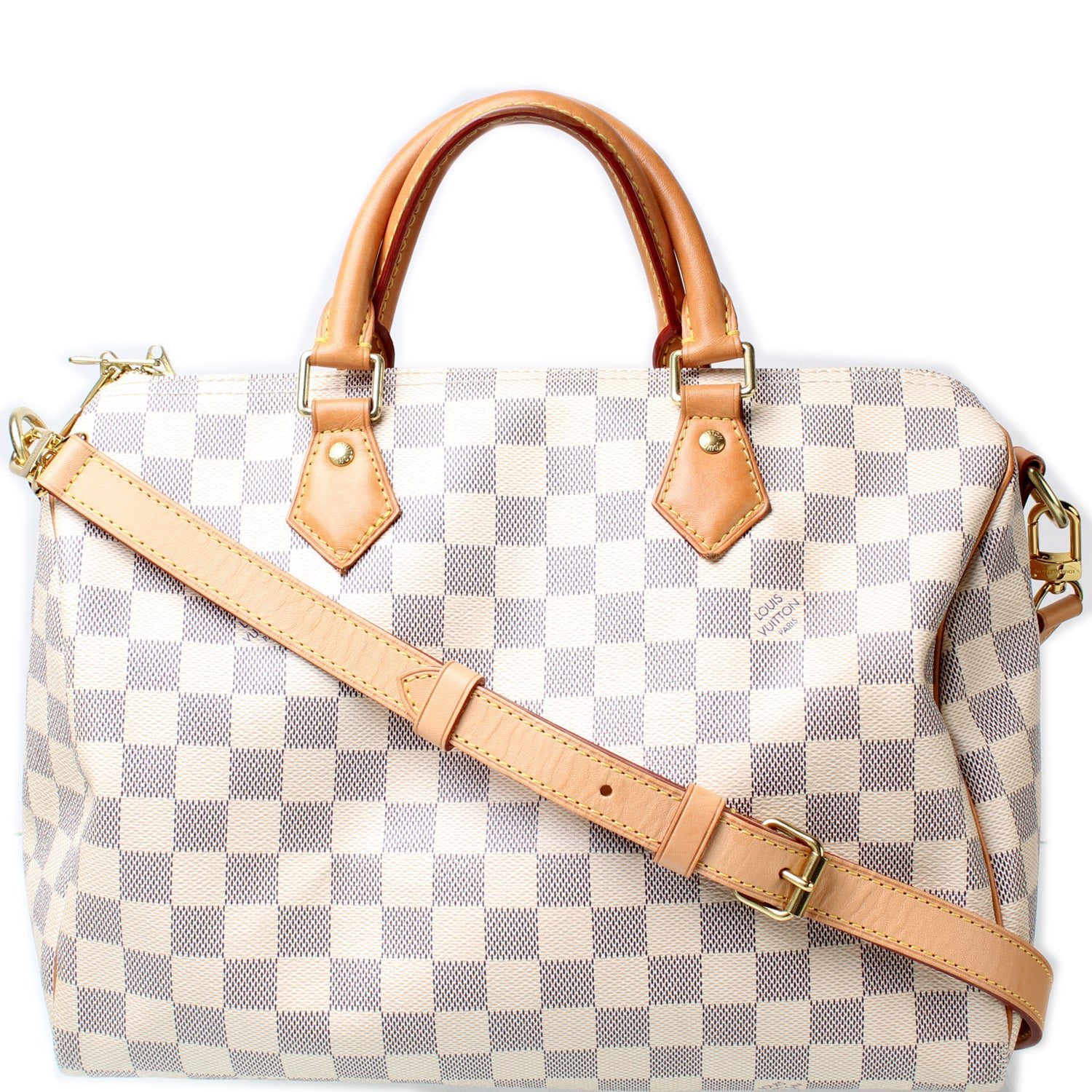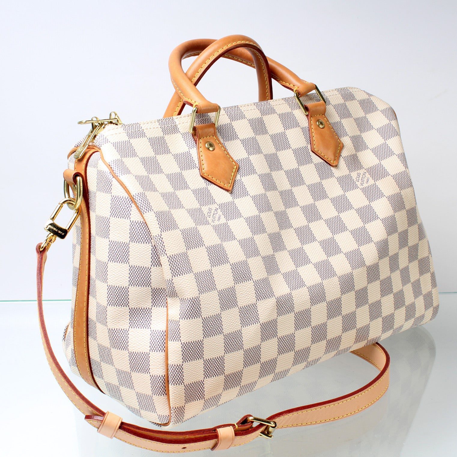Louis Vuitton Speedy 30 Bandouliere. The exterior is in the classic Damier Azur coated canvas. Â