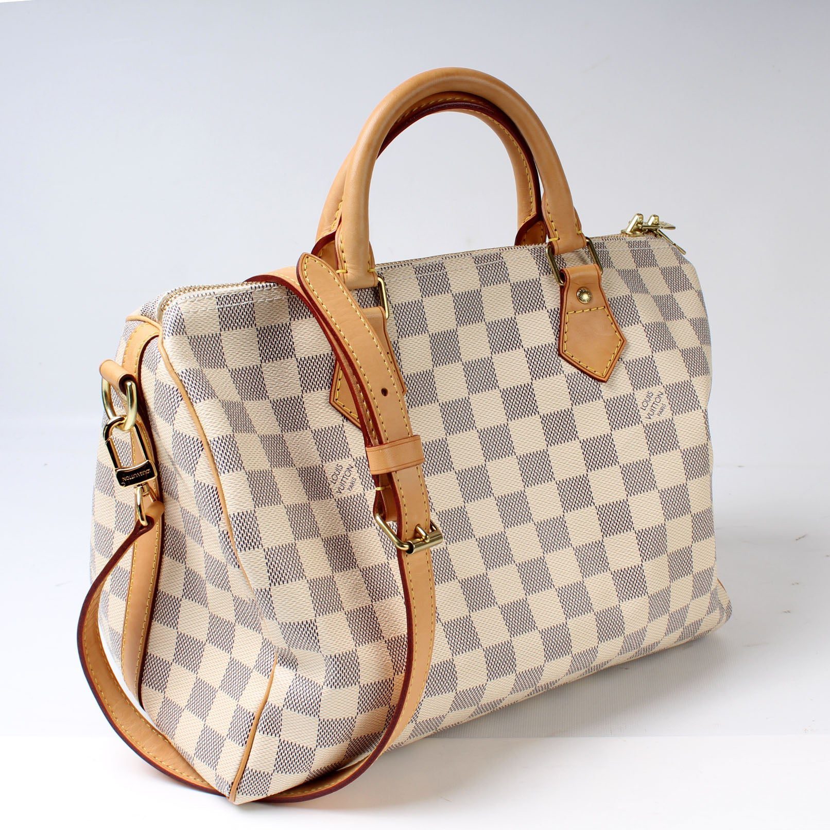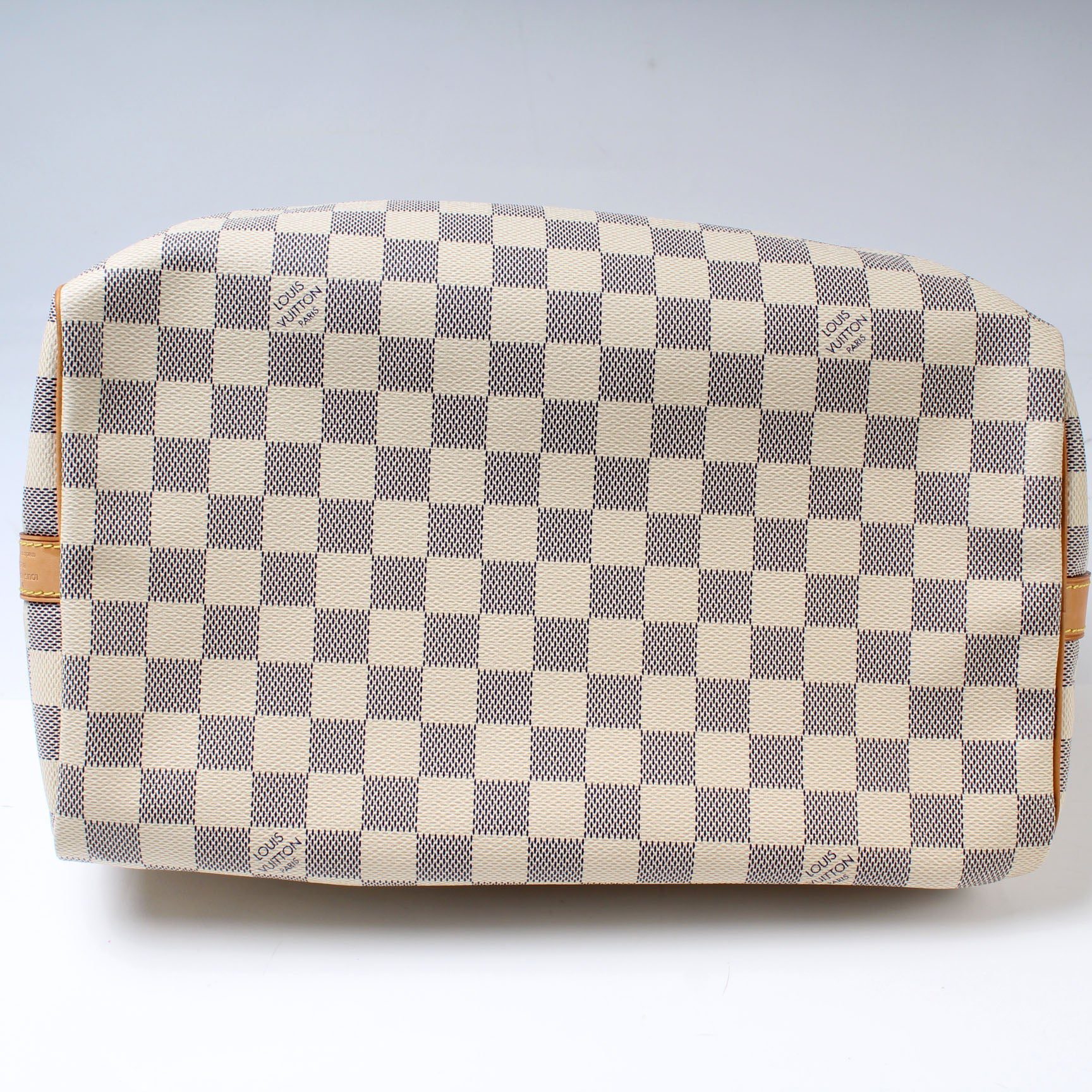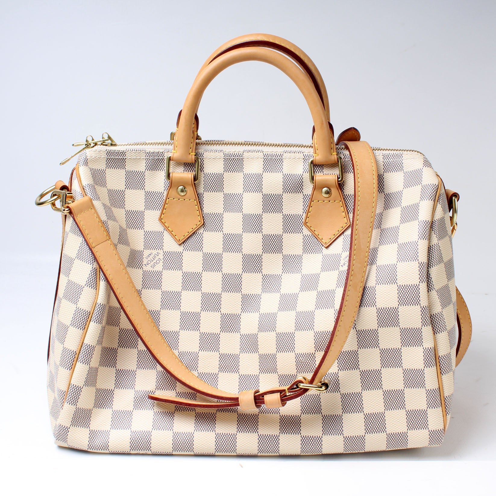 Louis Vuitton Speedy 30 Bandouliere. The exterior is in the classic Damier Azur coated canvas. Â