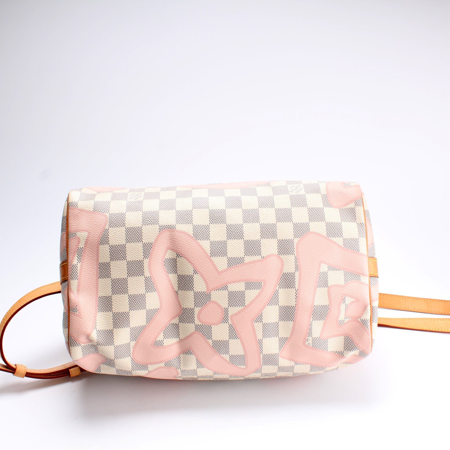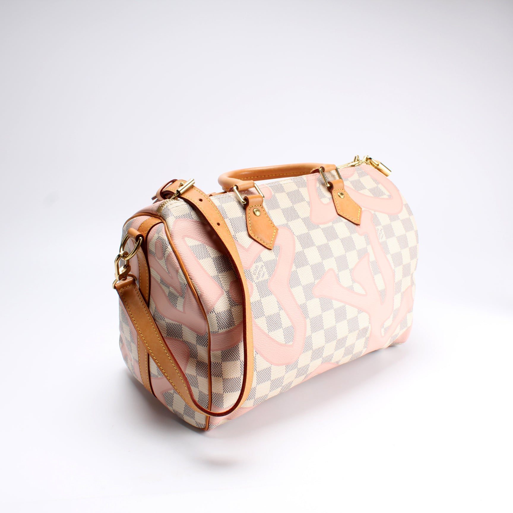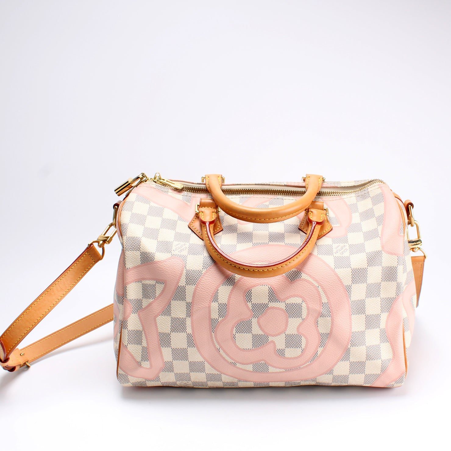 Louis Vuitton Speedy 30 Bandouliere Damier Azur Tahitienne. The exterior is in the classic Damier Azur coated canvas. Â