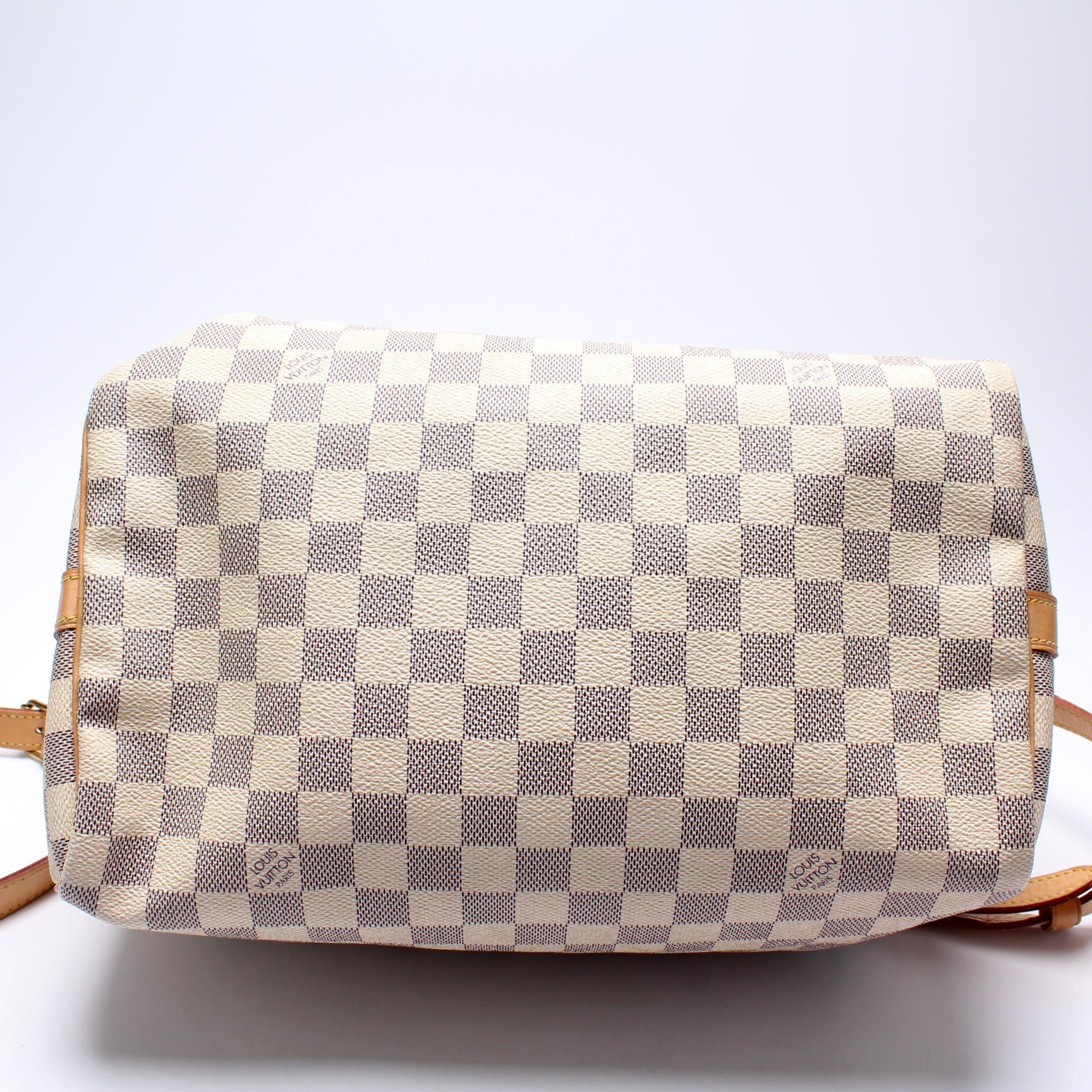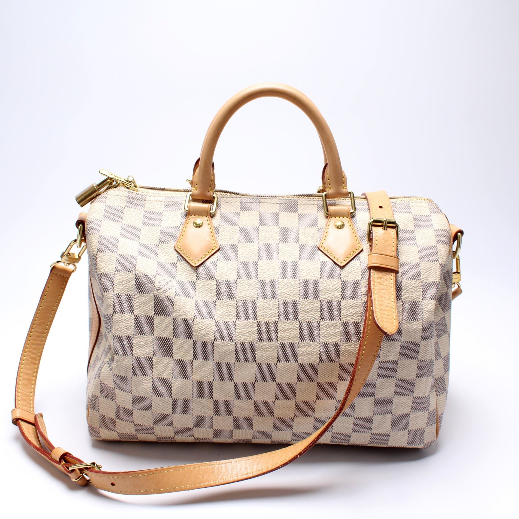 Louis Vuitton Speedy 30. The exterior is in the classic Louis Vuitton Damier Azur coated canvas.