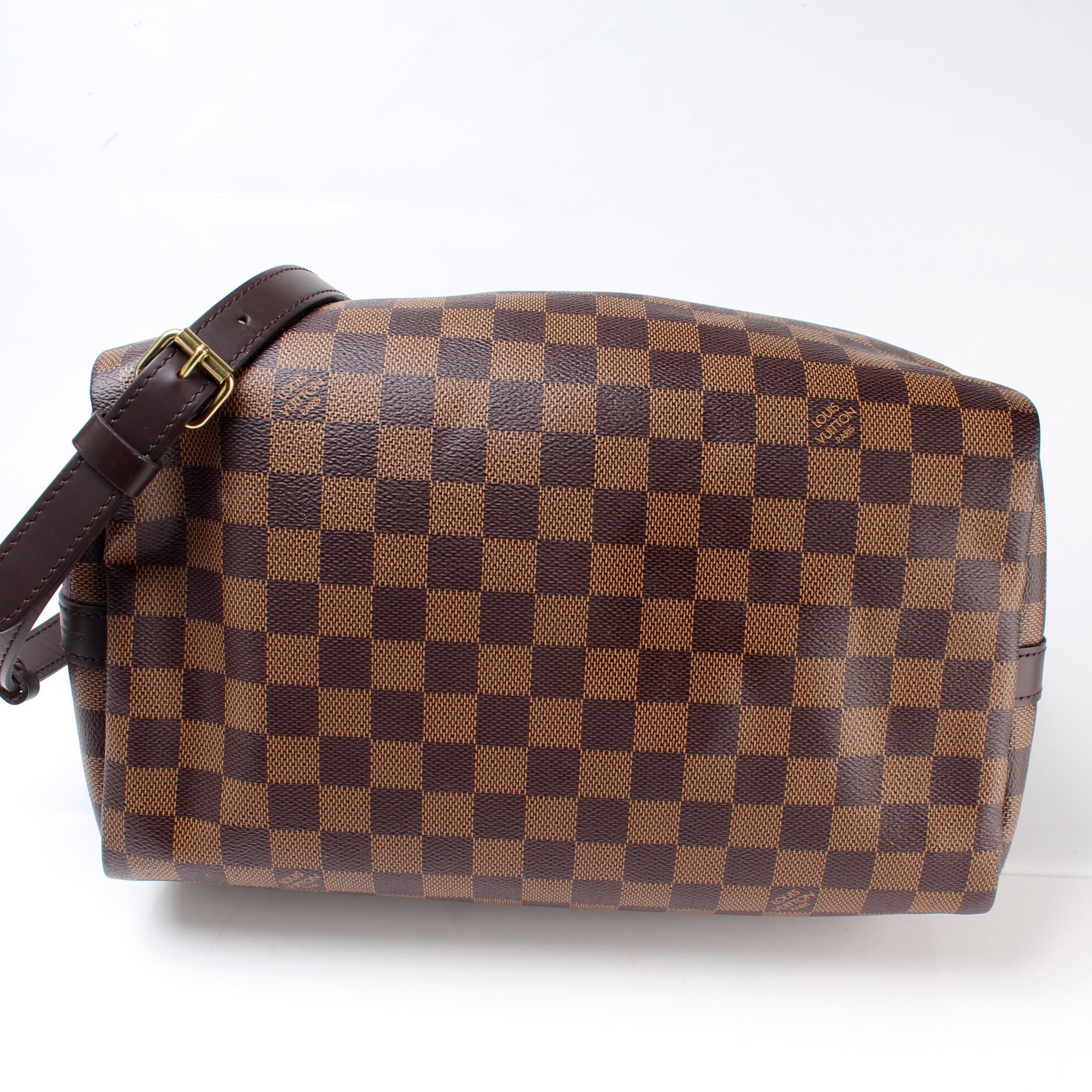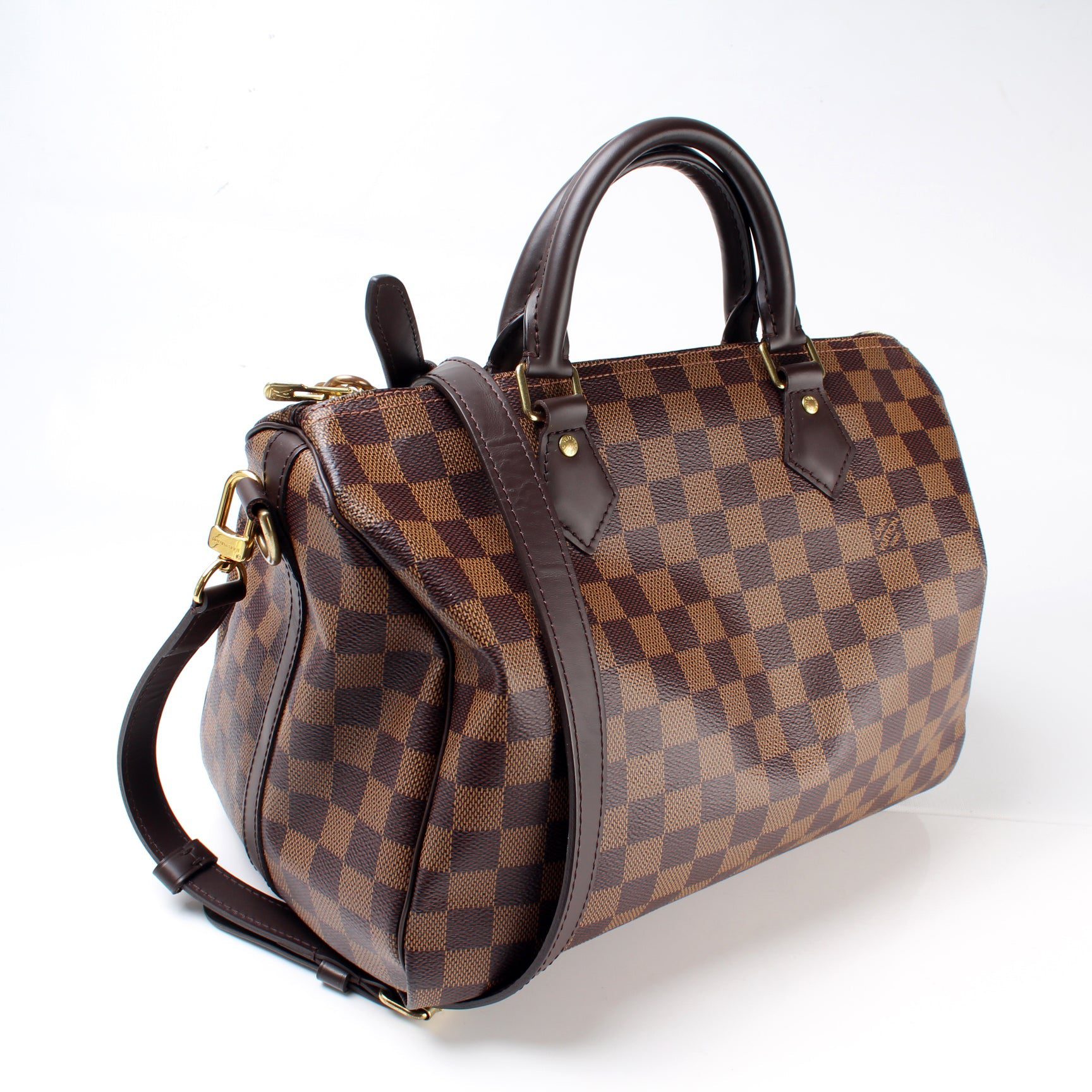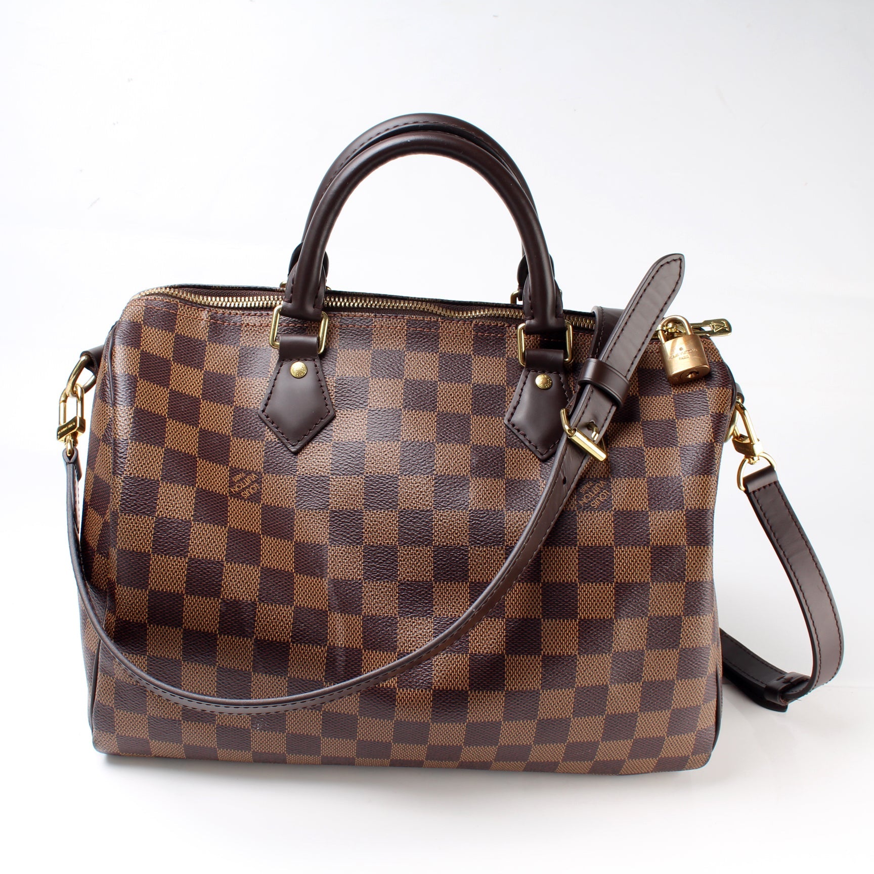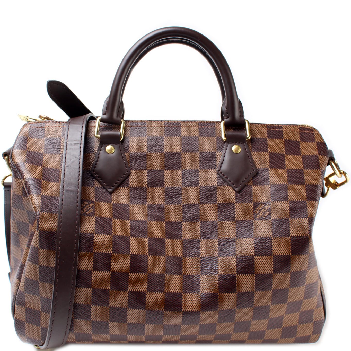 Louis Vuitton Speedy 30 Bandouliere. The exterior is in the classic Damier Ebene coated canvas. Â