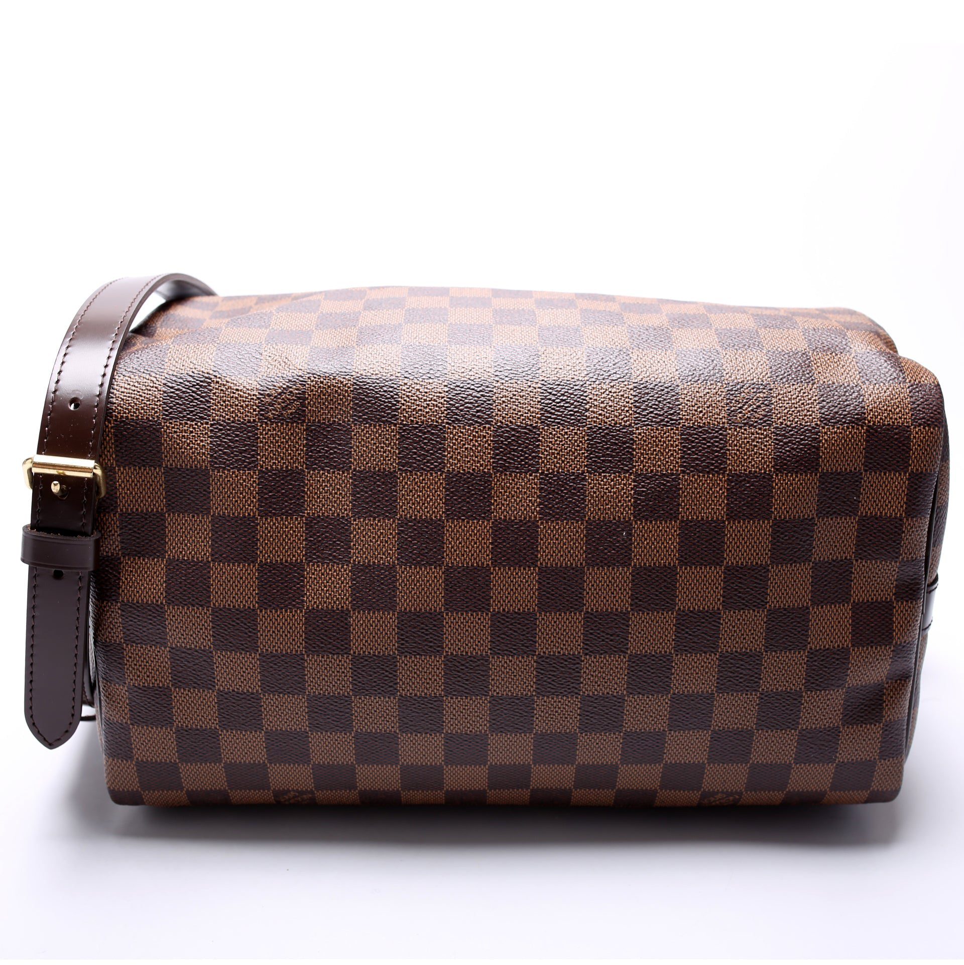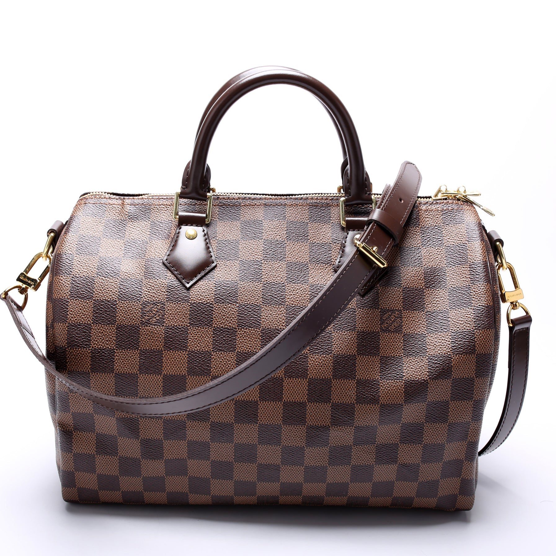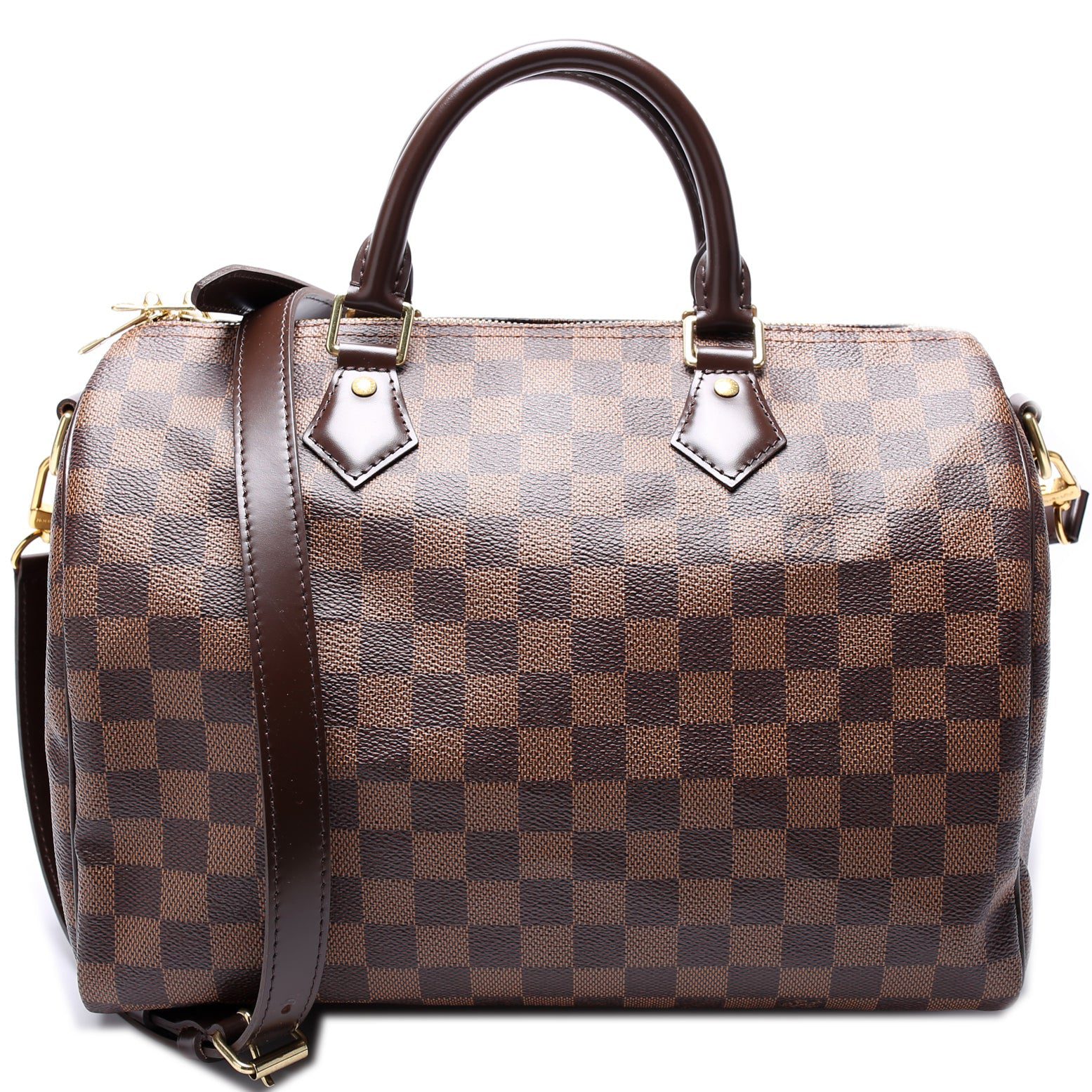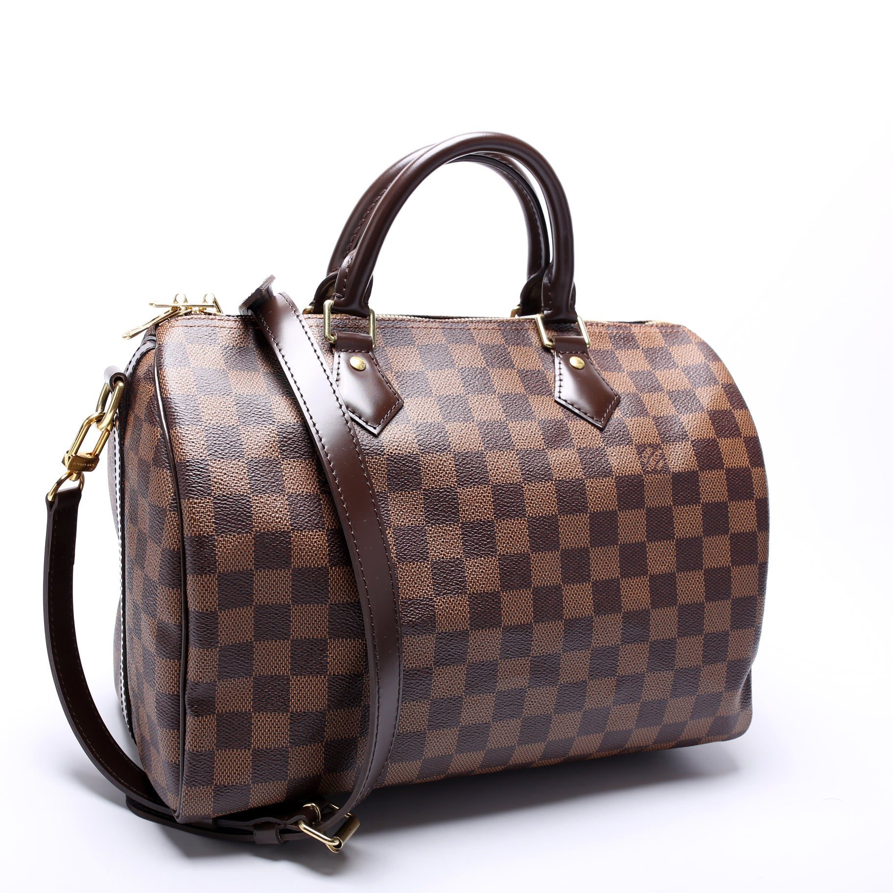 Louis Vuitton Speedy 30 Bandouliere. The exterior is in the classic Louis Vuitton Damier Ebene coated canvas. Â