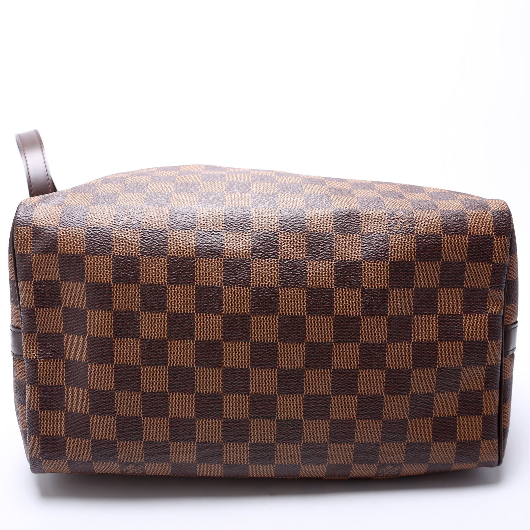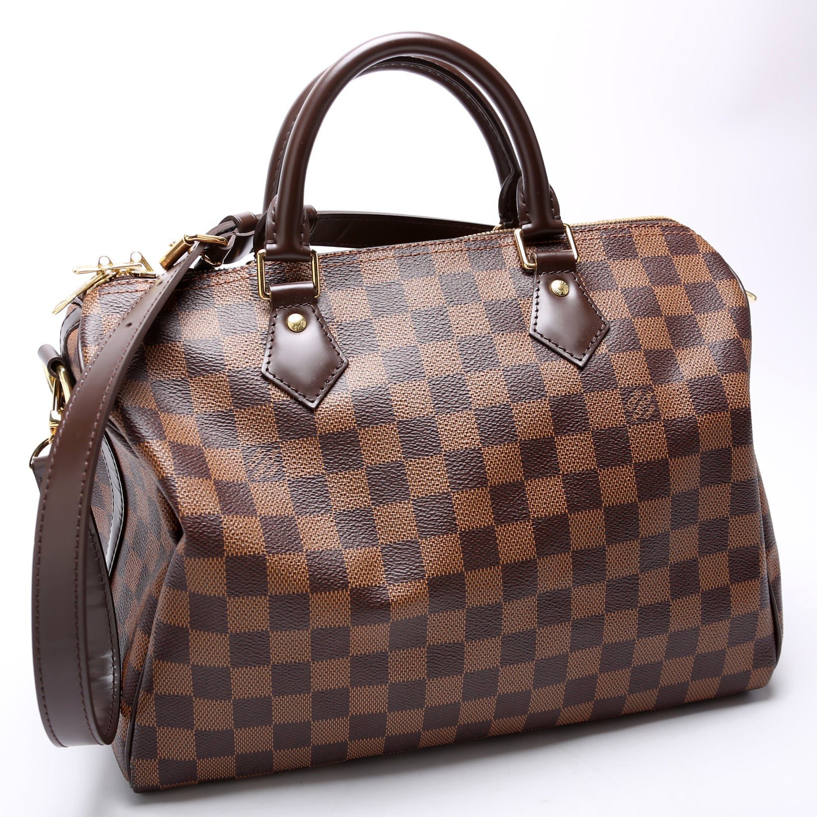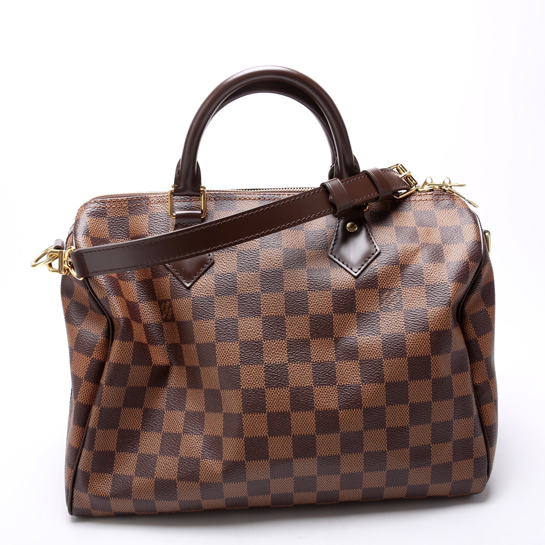 Louis Vuitton Speedy 30Â Bandouliere. The exterior is in the classic Damier Ebene coated canvas. Â