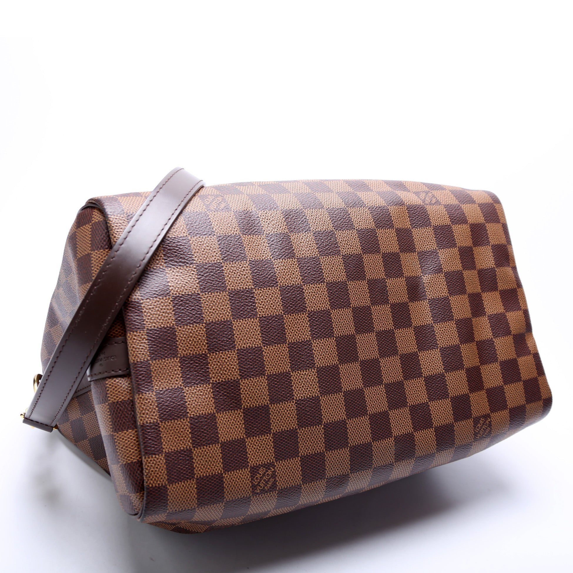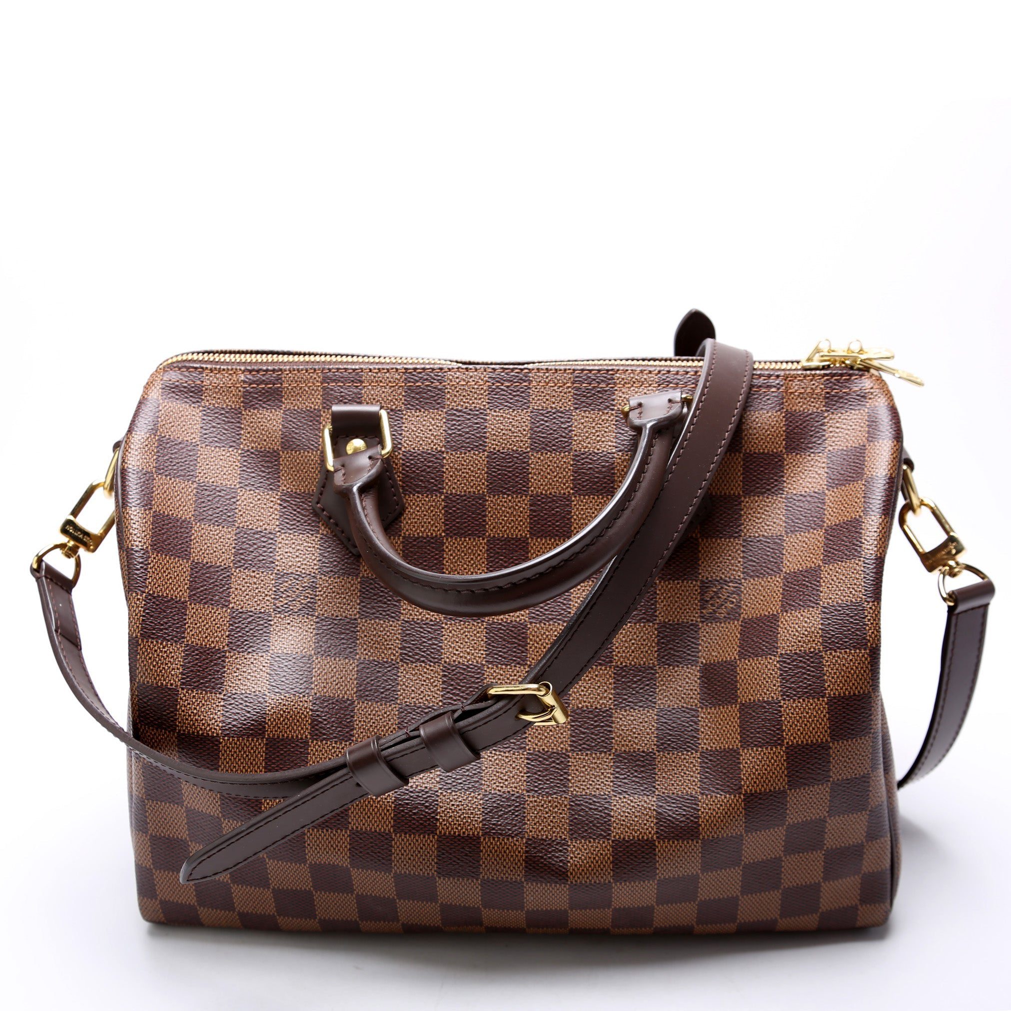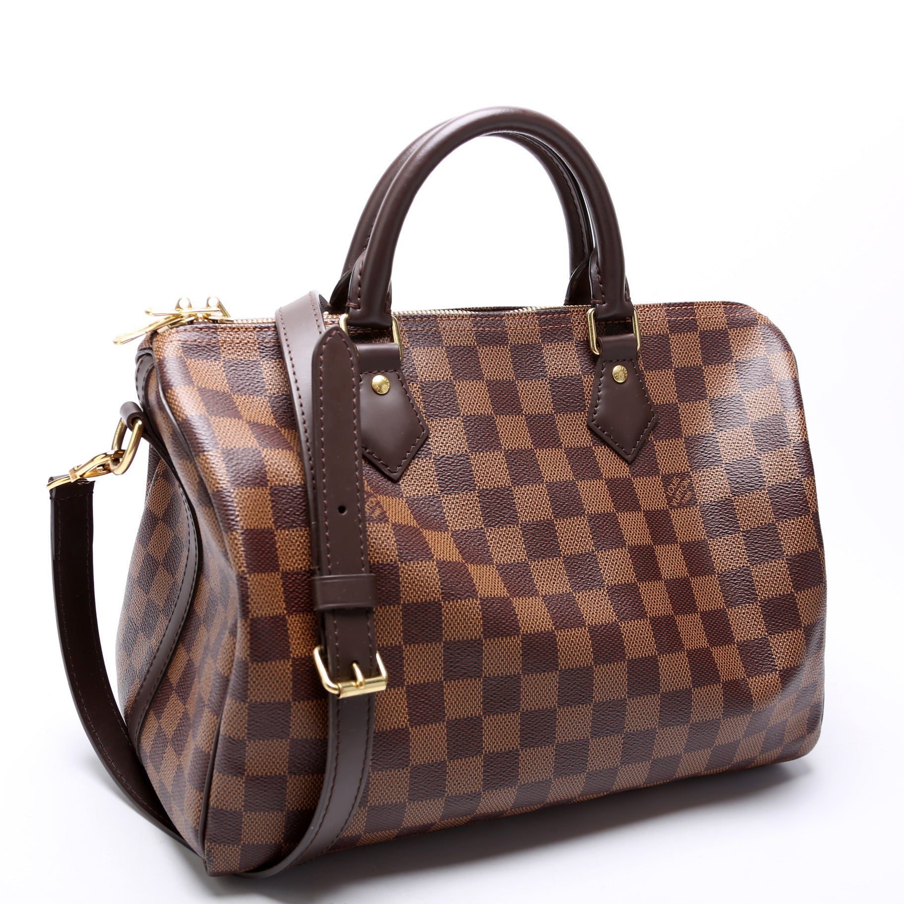 Louis Vuitton Speedy 30. The exterior is in the classic Louis Vuitton Damier Ebene coated canvas.
