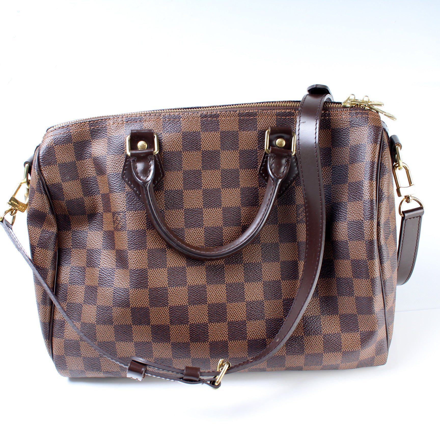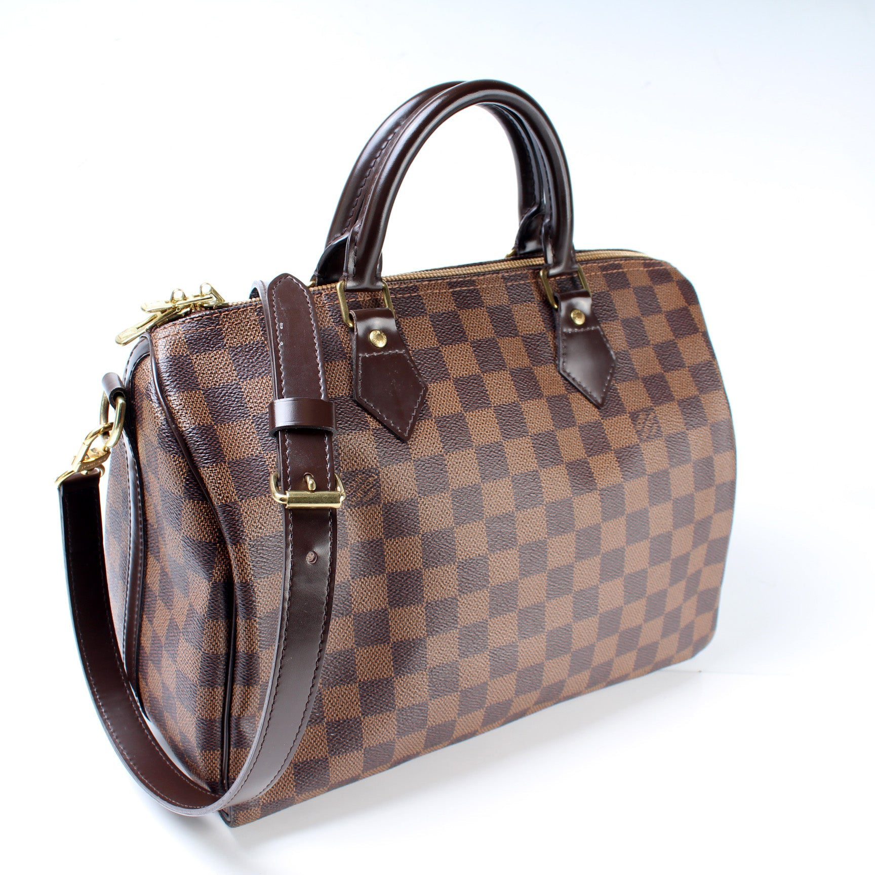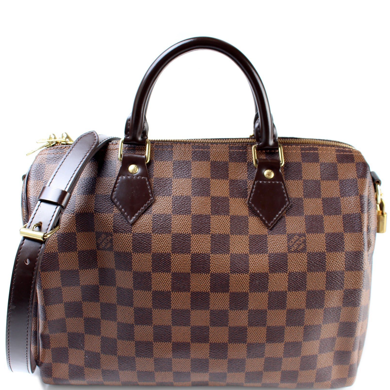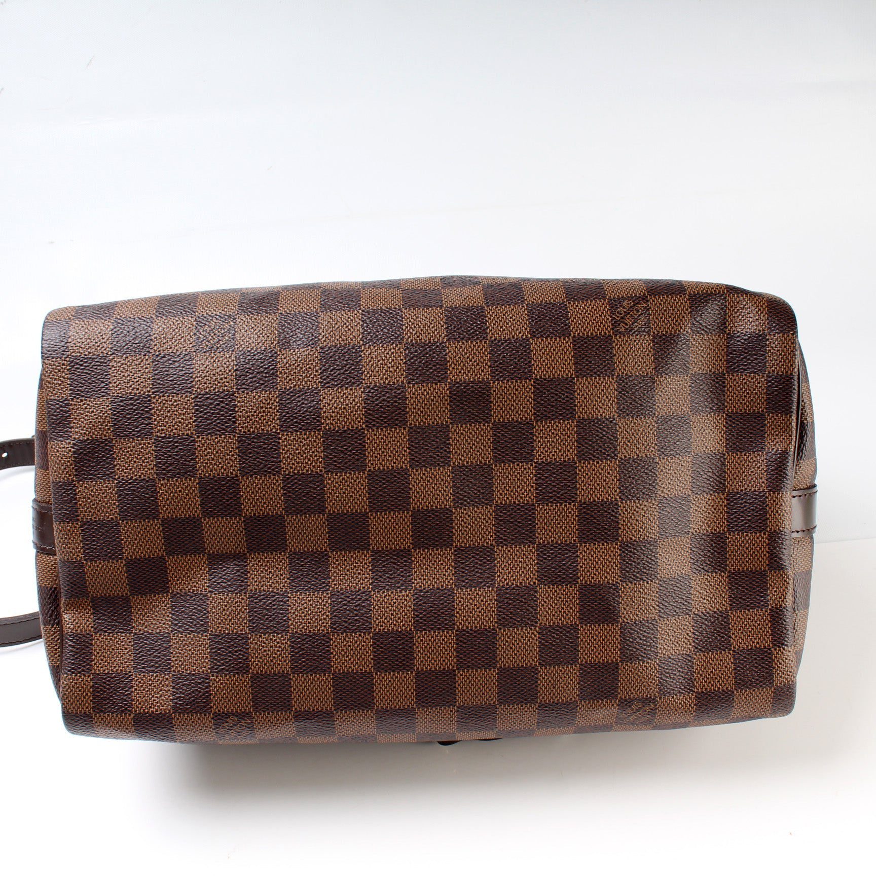 Louis Vuitton Speedy 30. The exterior is in the classic Damier Ebene coated canvas. Â