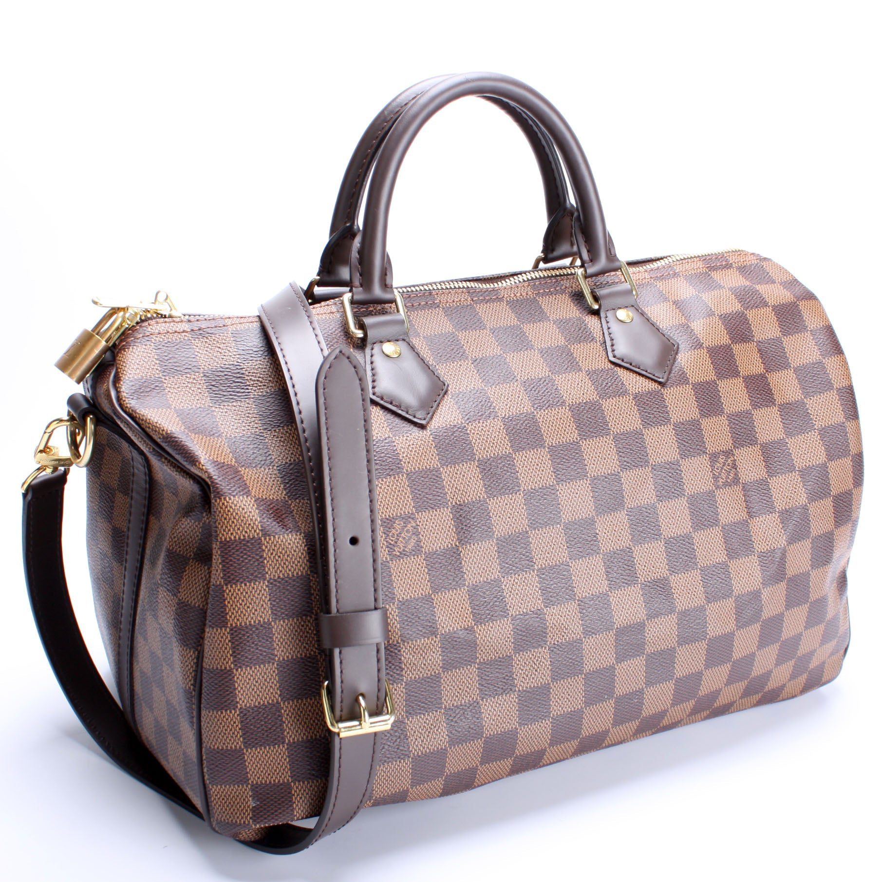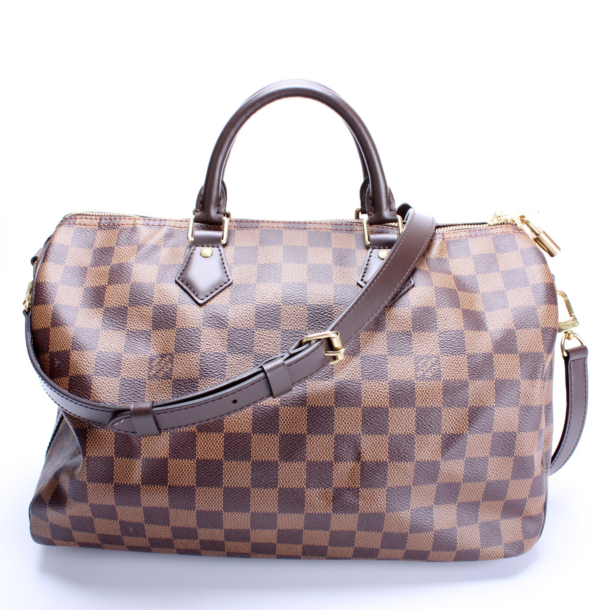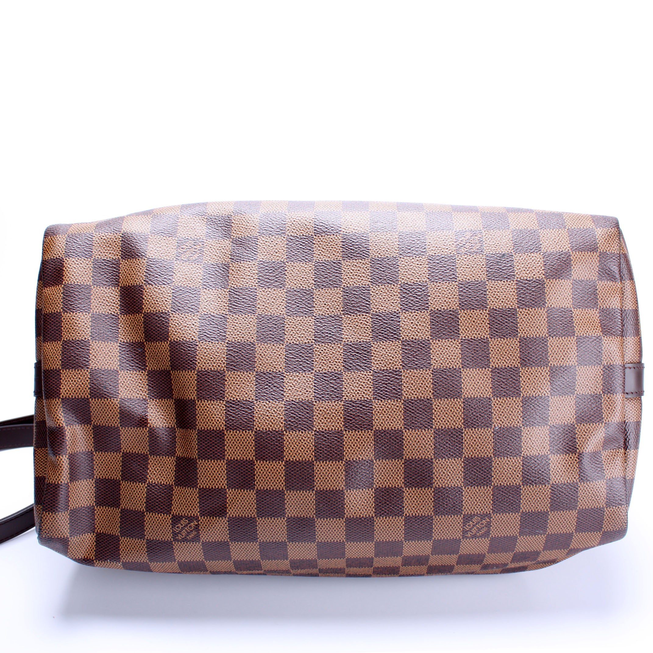 Louis Vuitton Speedy 30 Bandouliere. The exterior is in the classic Damier Ebene coated canvas. Â