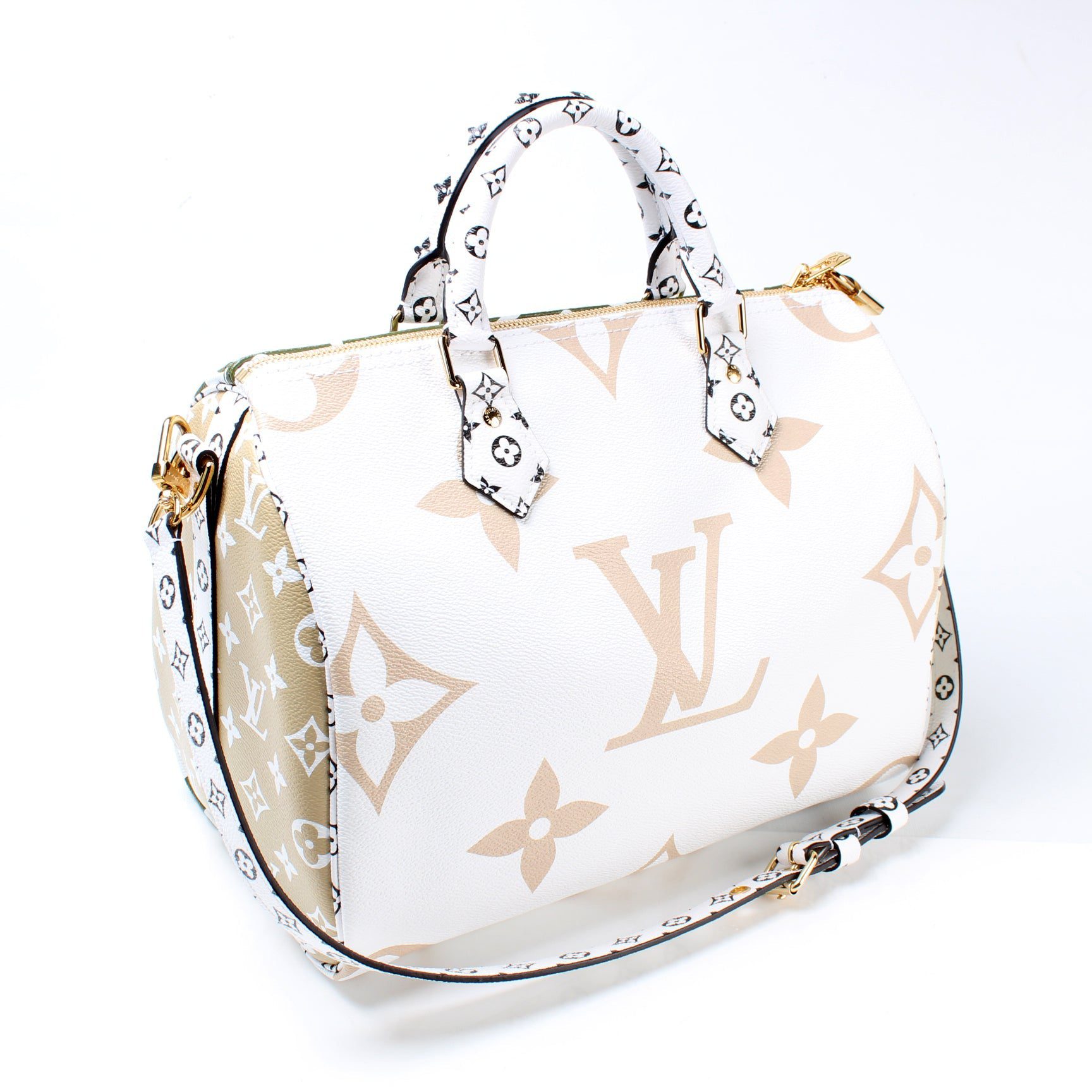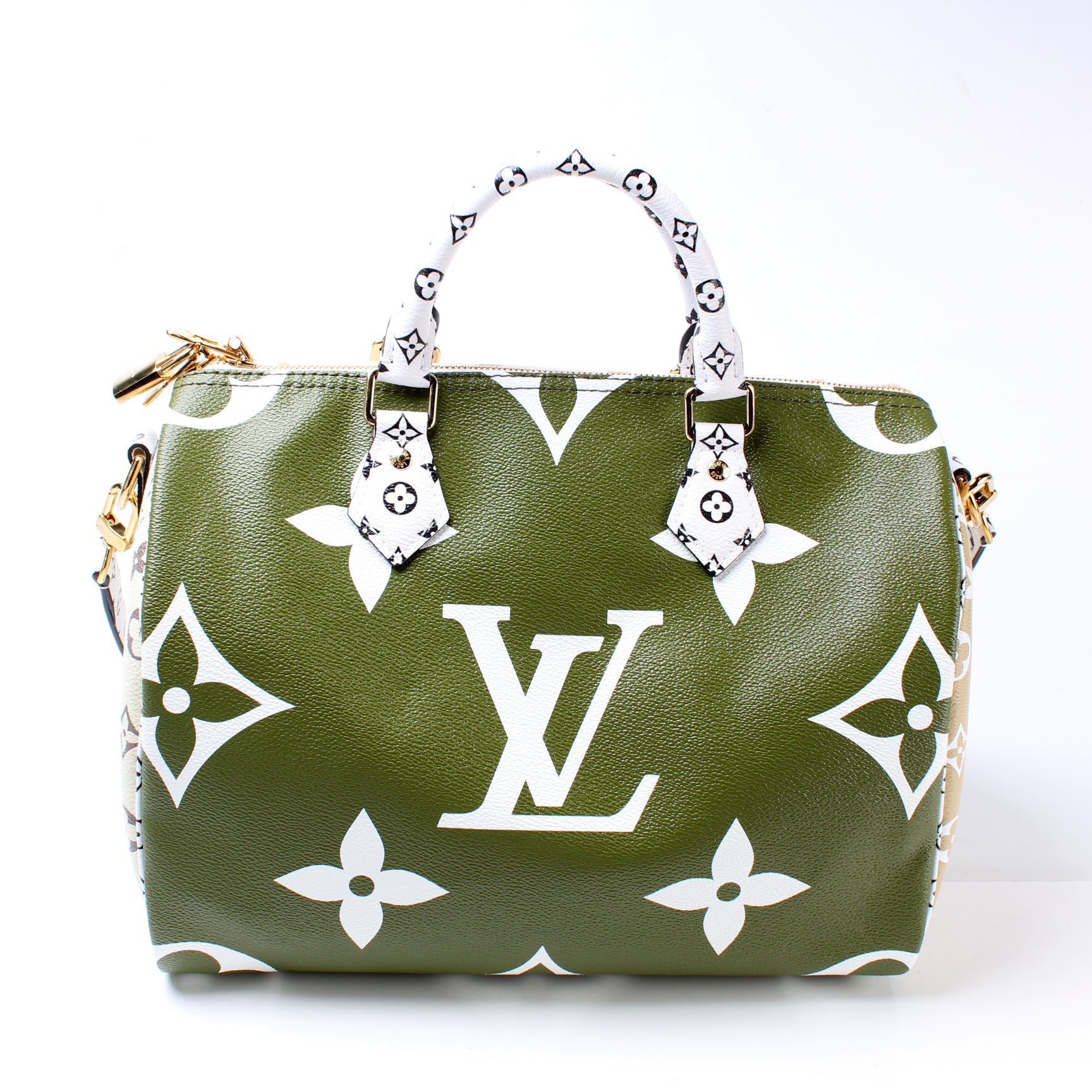 Louis Vuitton Speedy 30 Bandouliere. The exterior is in the classic Giant Khaki Monogram coated canvas. Â