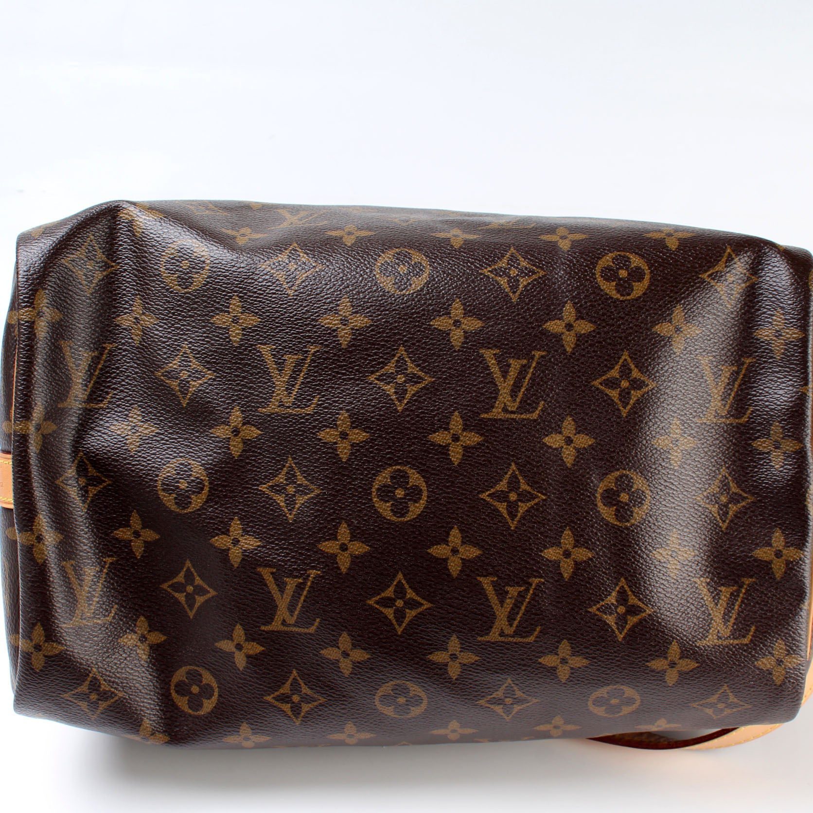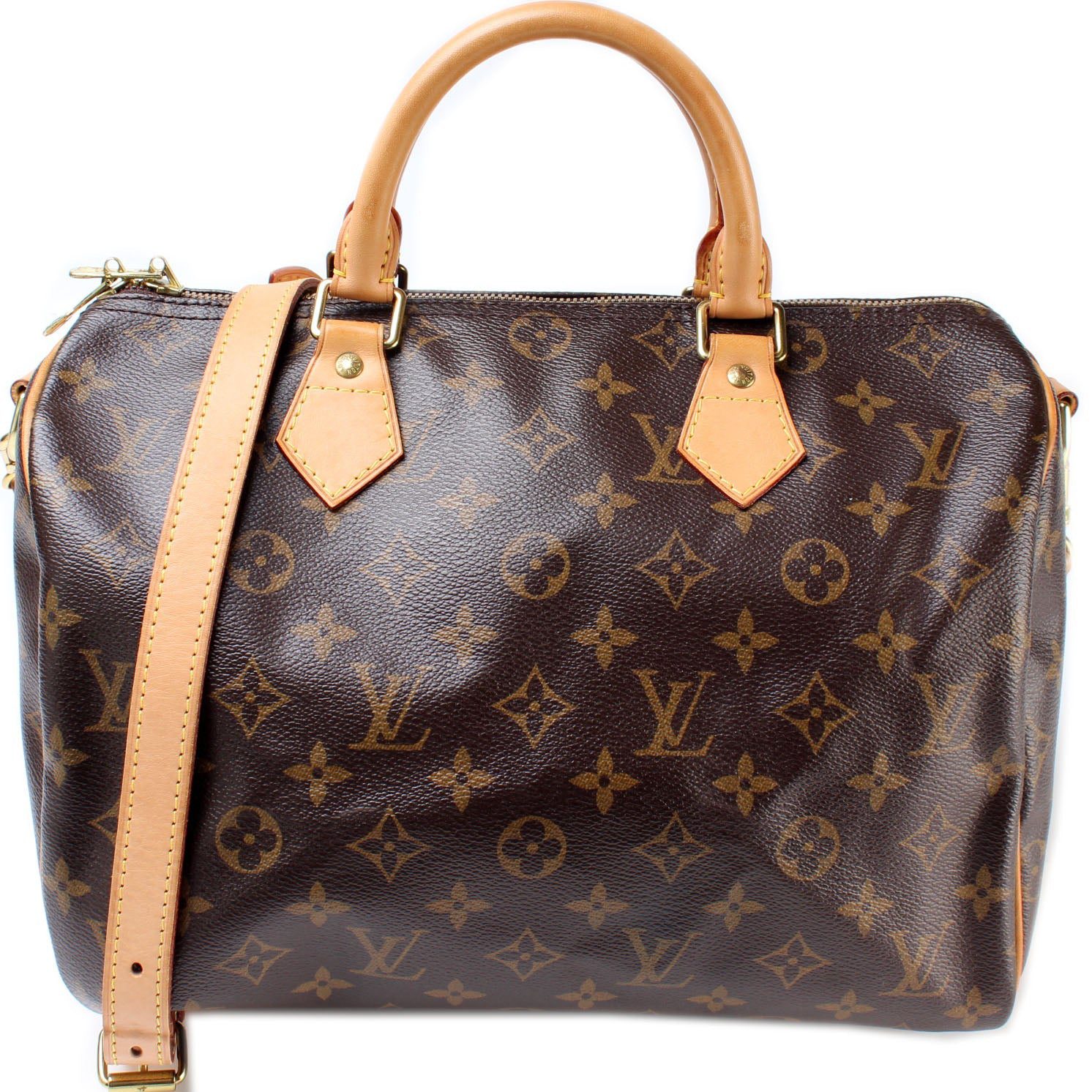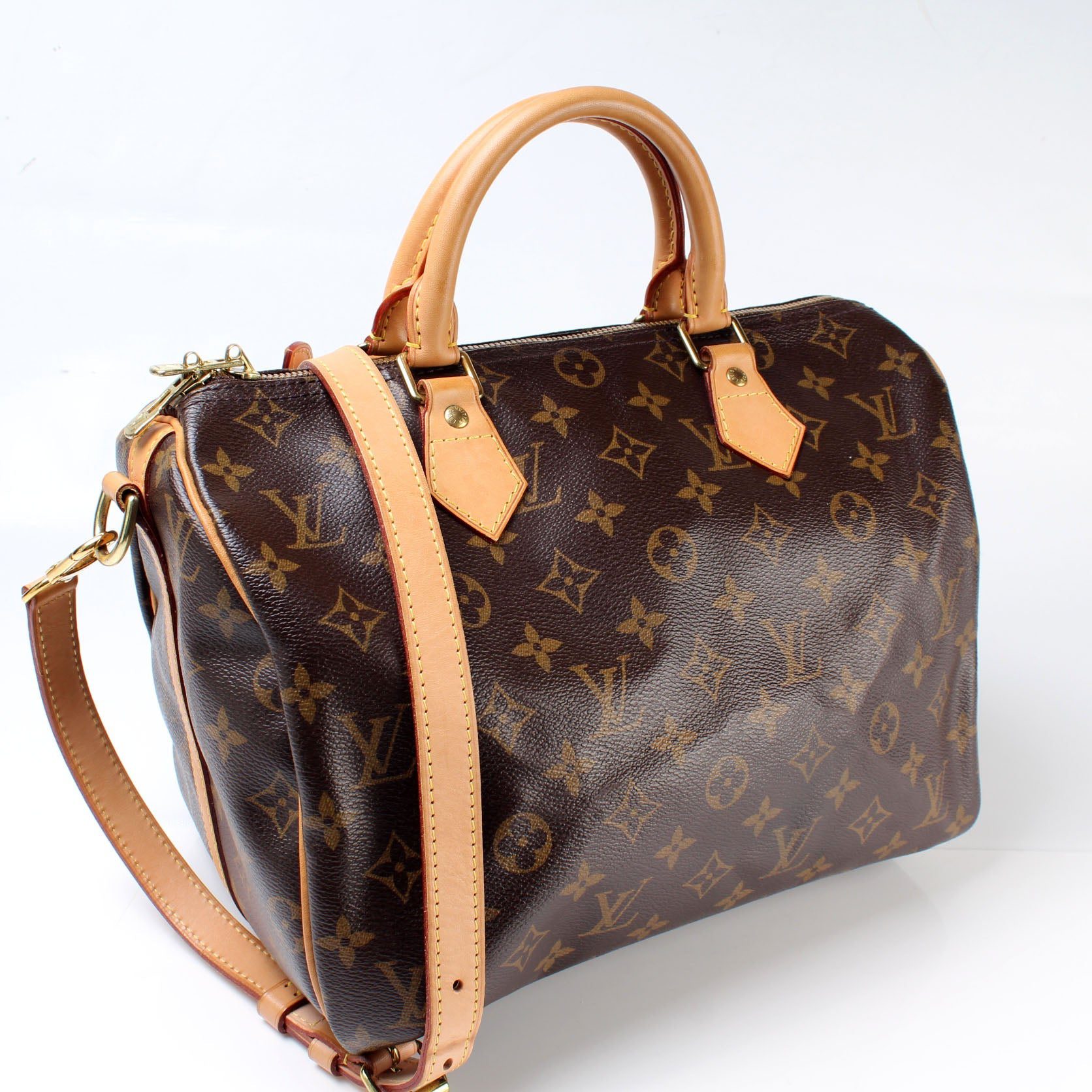 Louis Vuitton Speedy 30 Bandouliere. The exterior is in the classic Monogram coated canvas. Â