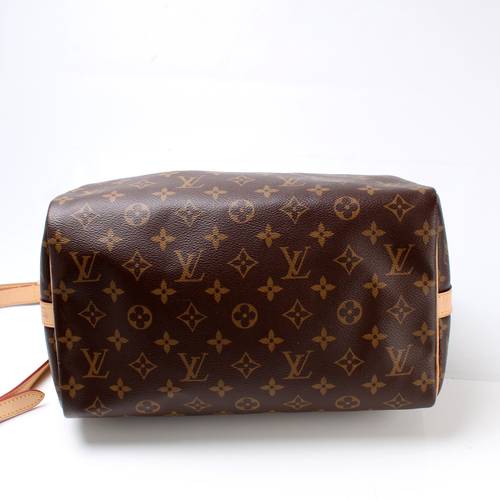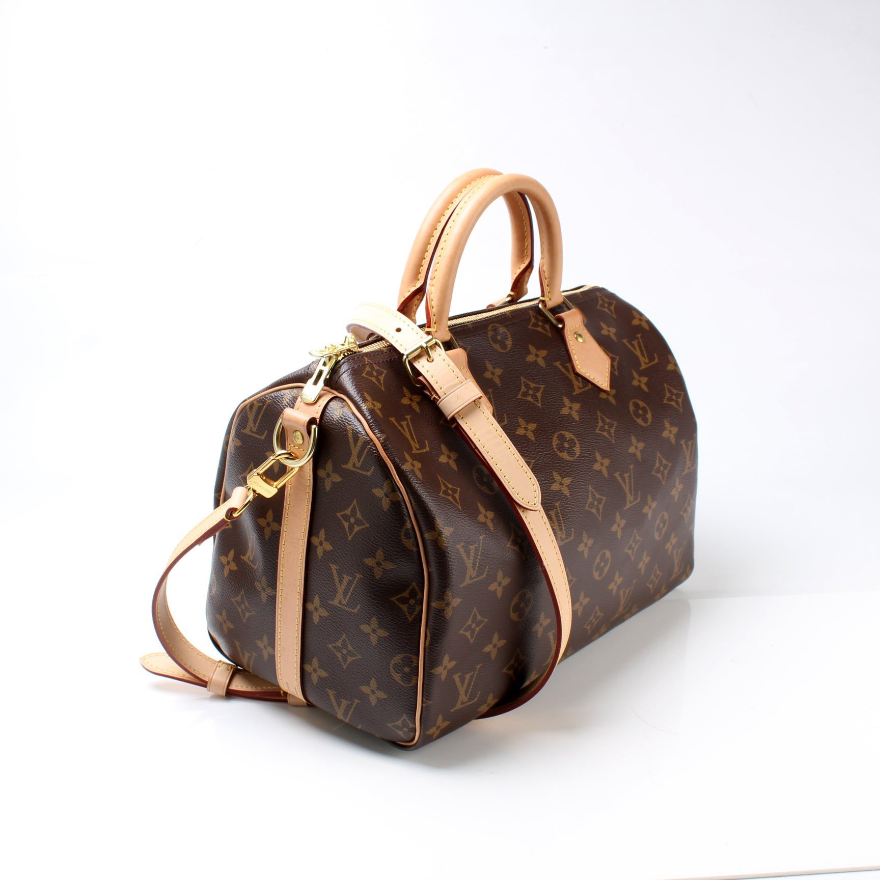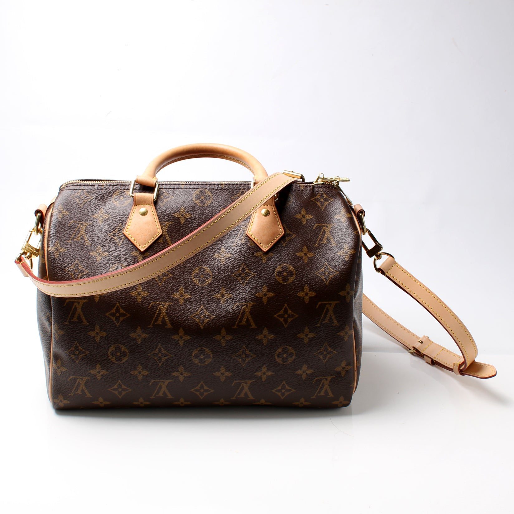 Louis Vuitton Speedy 30 Bandouliere. The exterior is in the classic Monogram coated canvas. Â