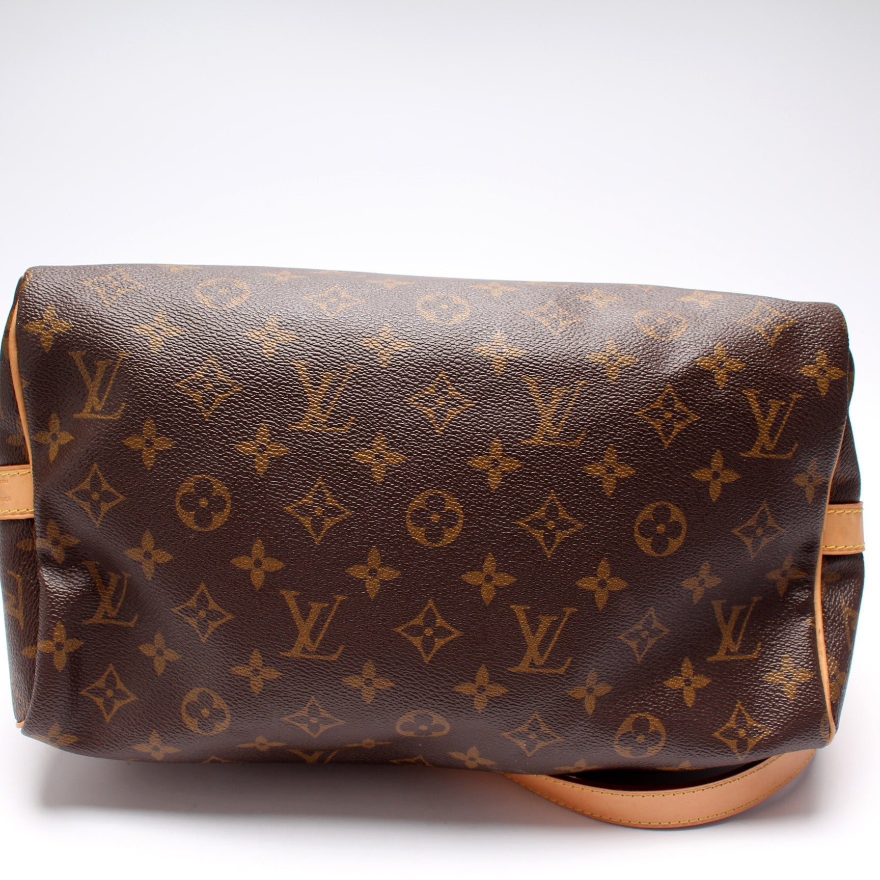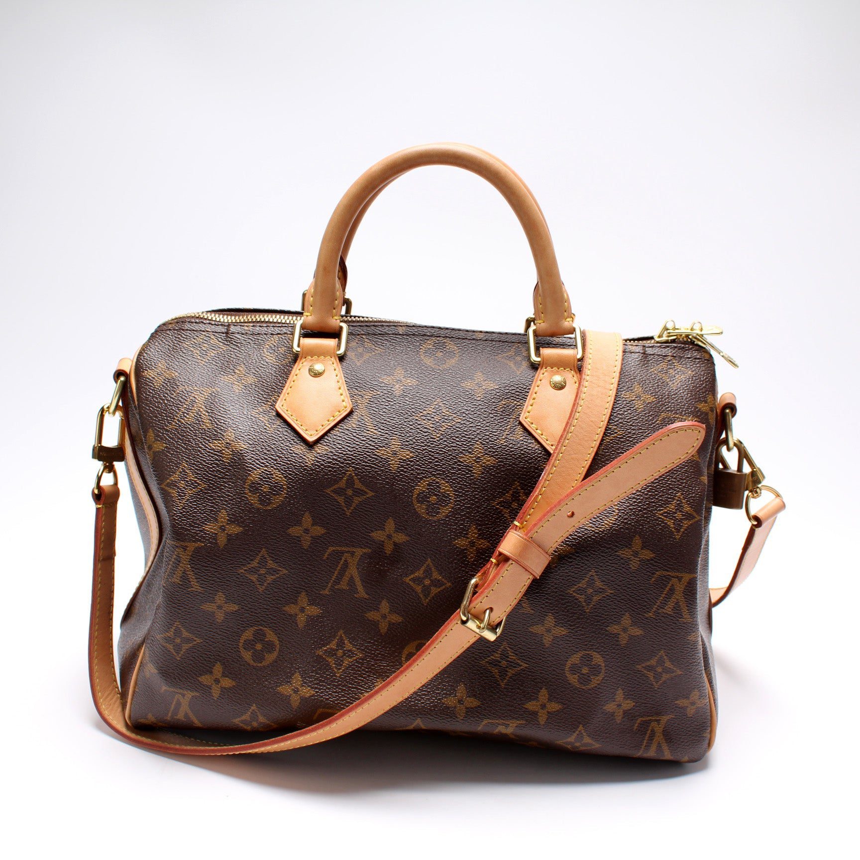 Louis Vuitton Speedy 30 Bandouliere. The exterior is in the classic Monogram coated canvas. Â