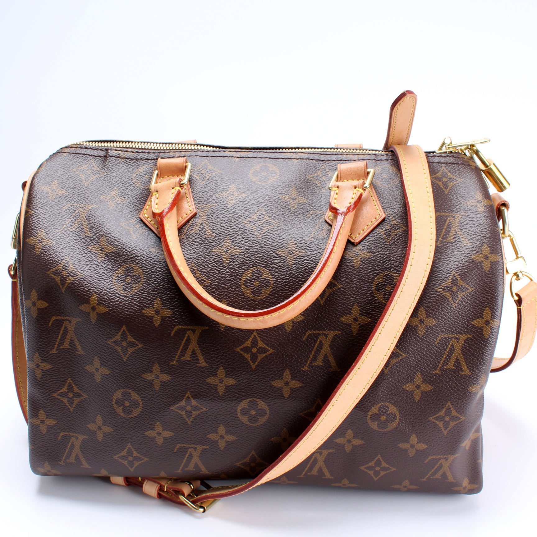 Louis Vuitton Speedy 30 Bandouliere. The exterior is in the classic Monogram coated canvas.