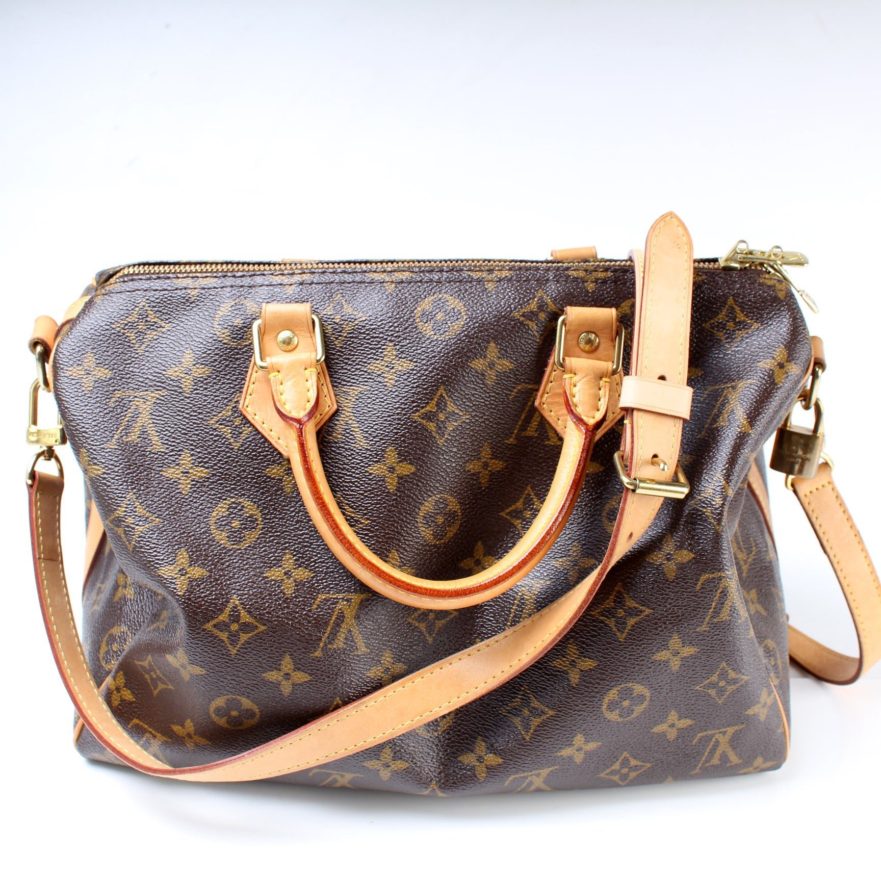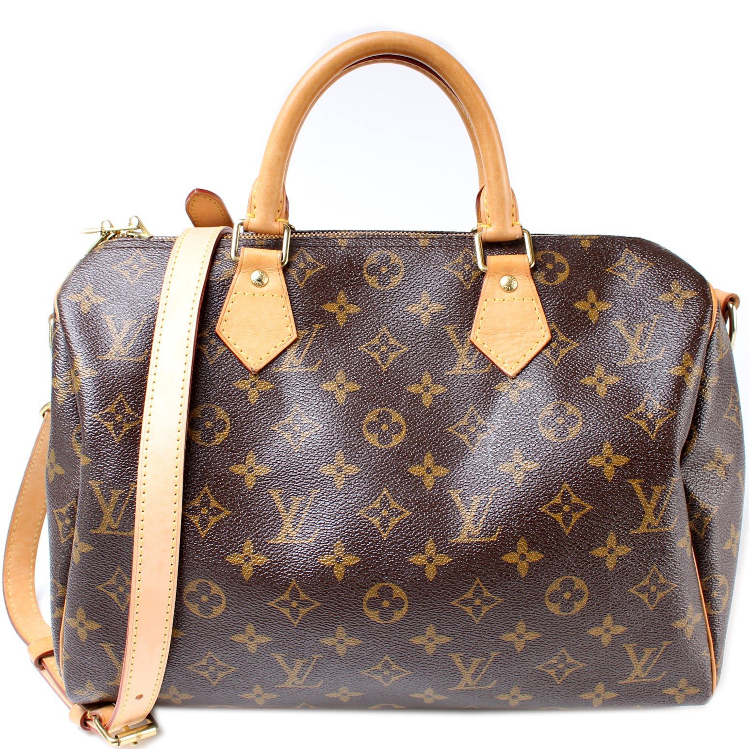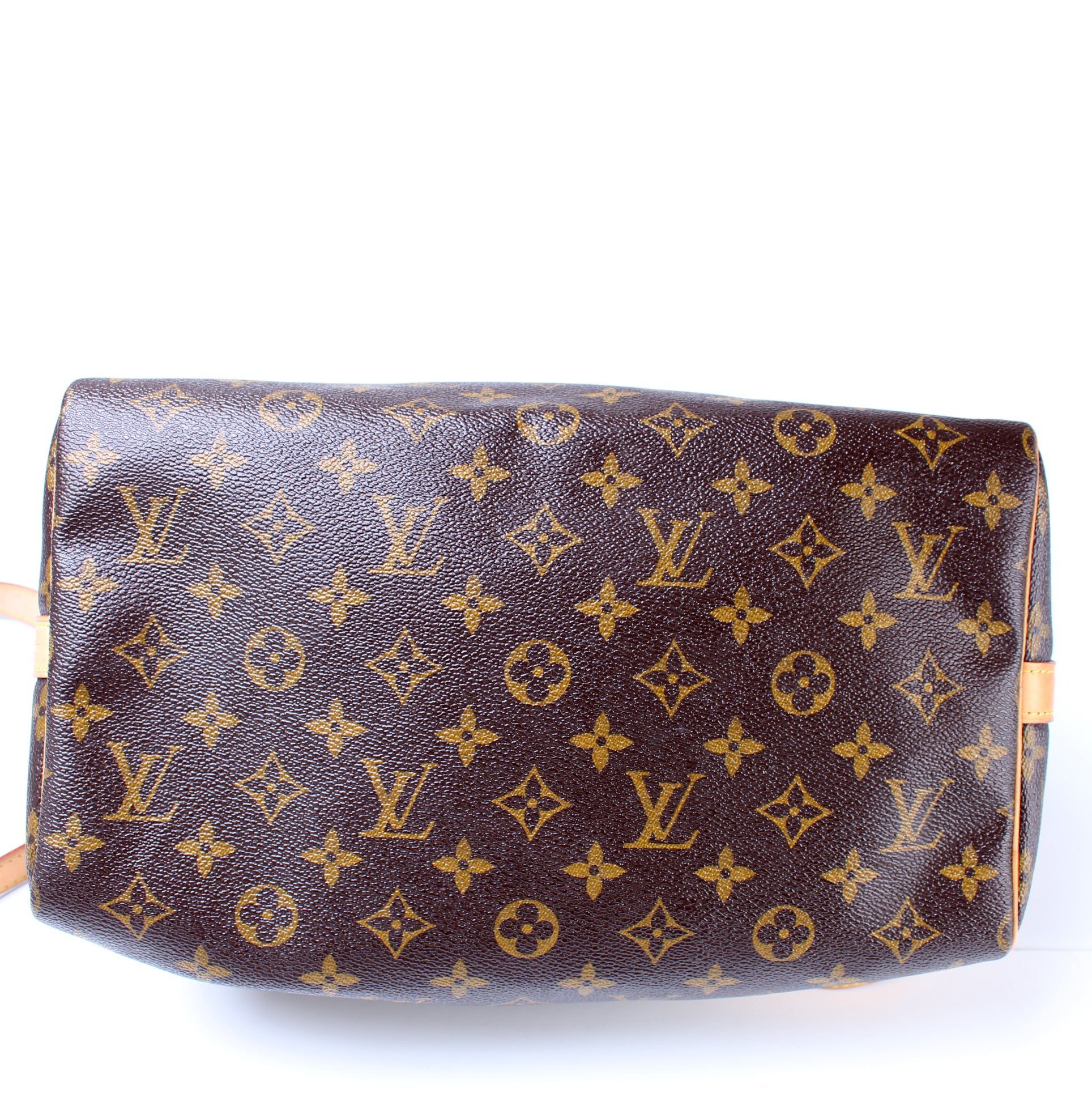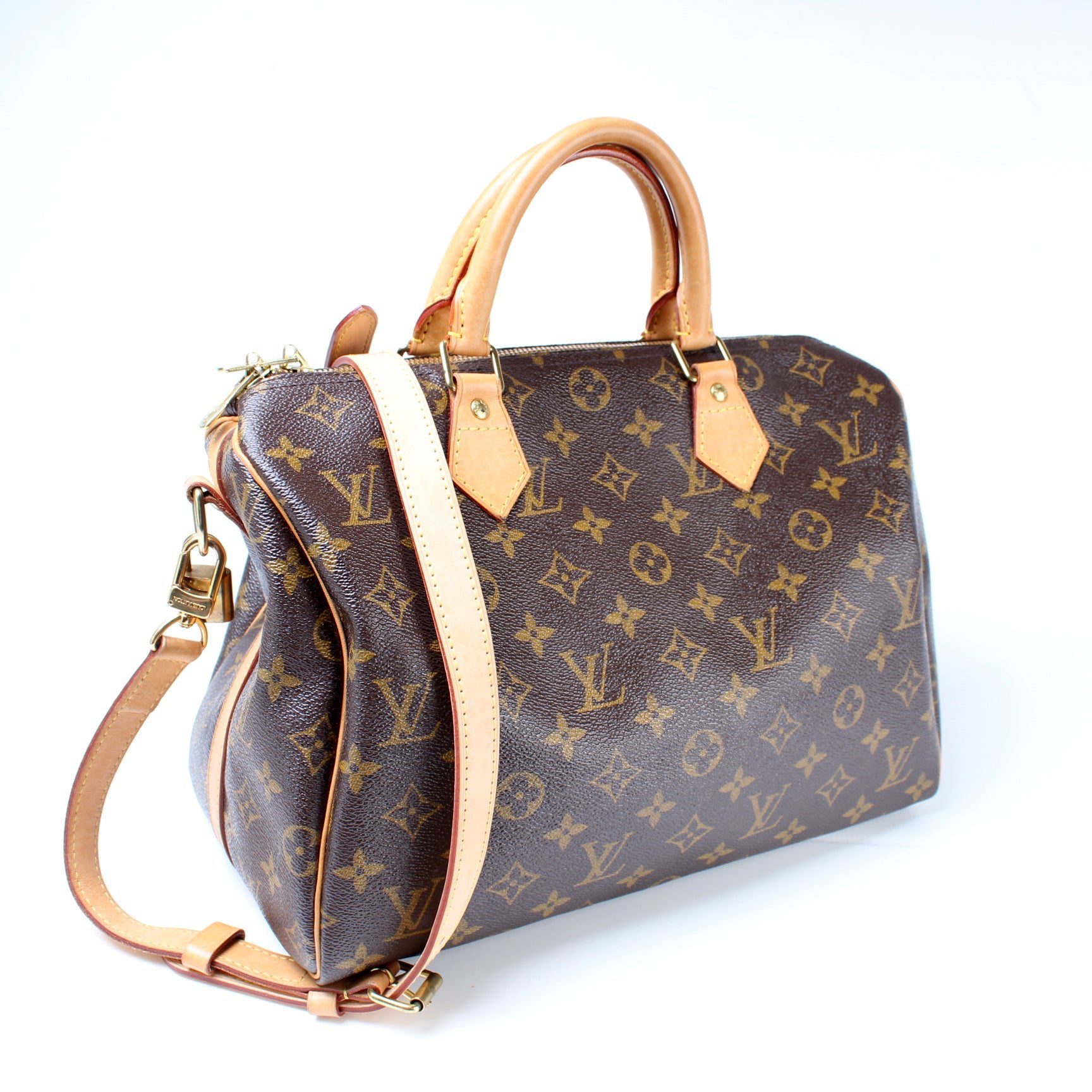 Louis Vuitton Speedy 30 Bandouliere. The exterior is in the classic Monogram coated canvas. Â