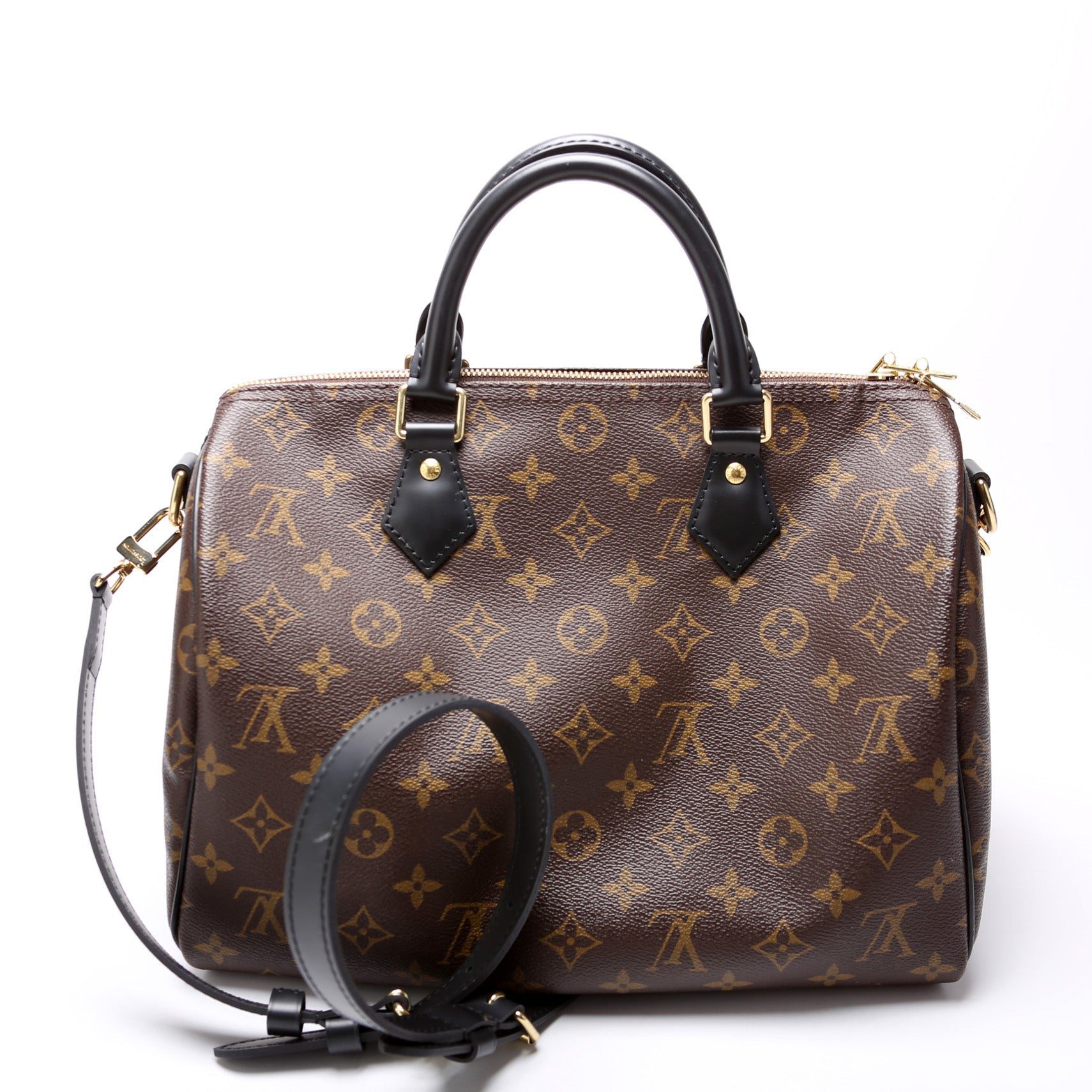 Louis Vuitton Speedy 30 Bandouliere. The exterior is in the classic Monogram coated canvas.