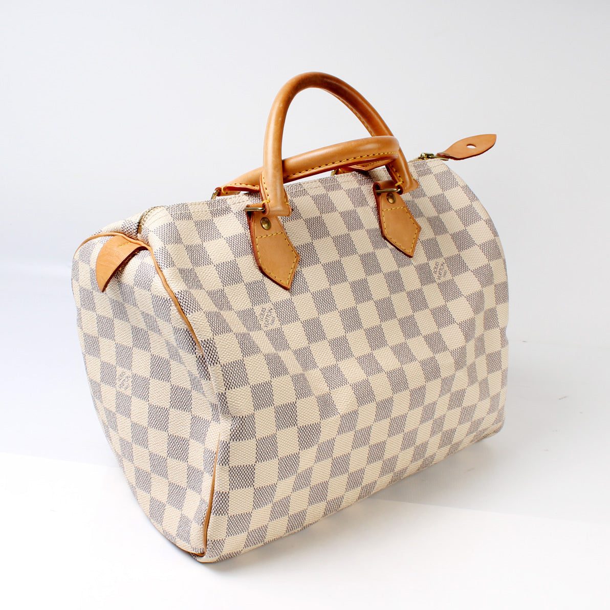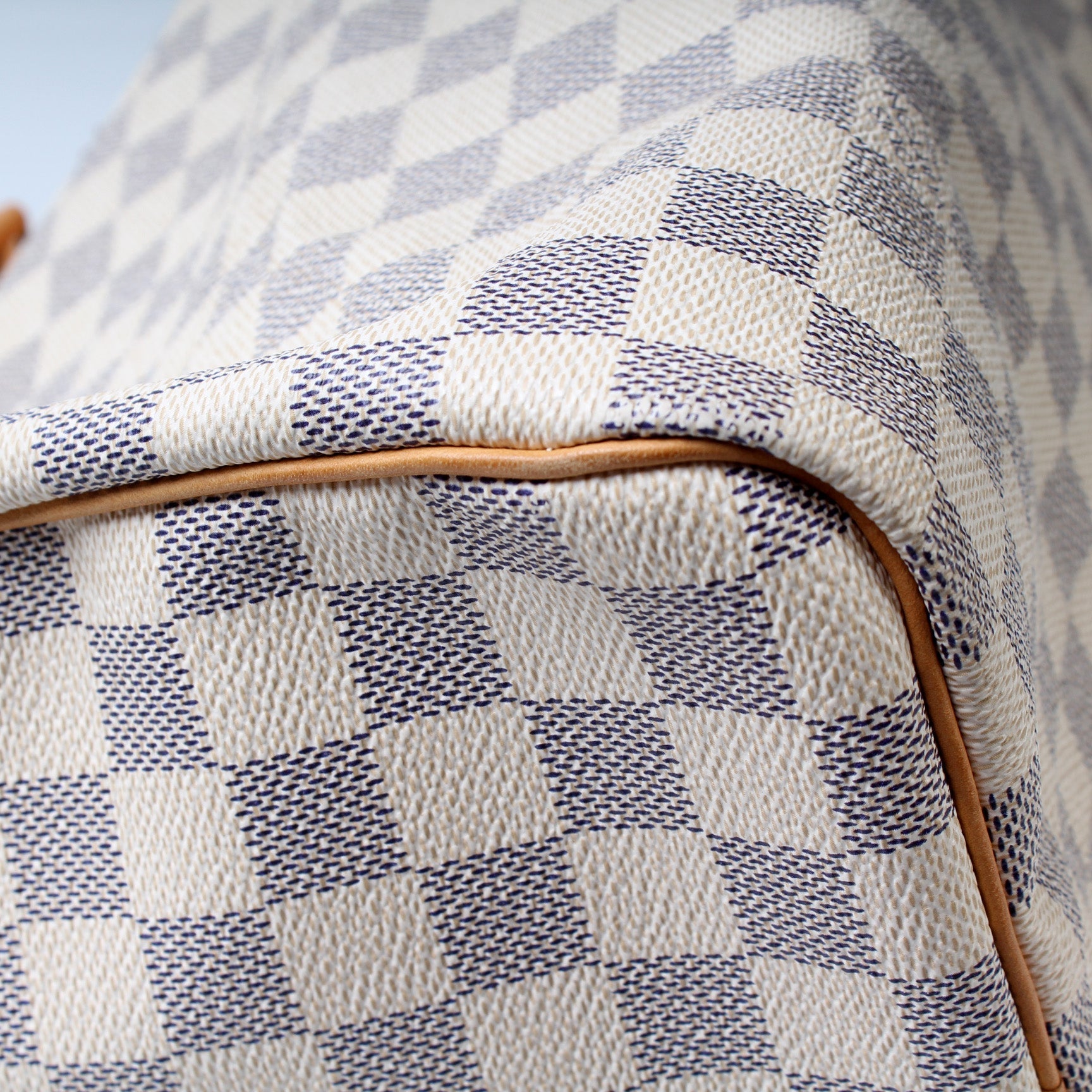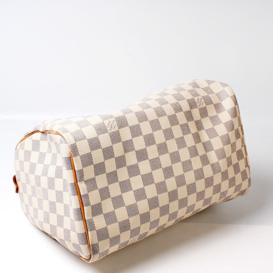Louis Vuitton Speedy 30. The exterior is in the classic Damier Azur coated canvas. Â
