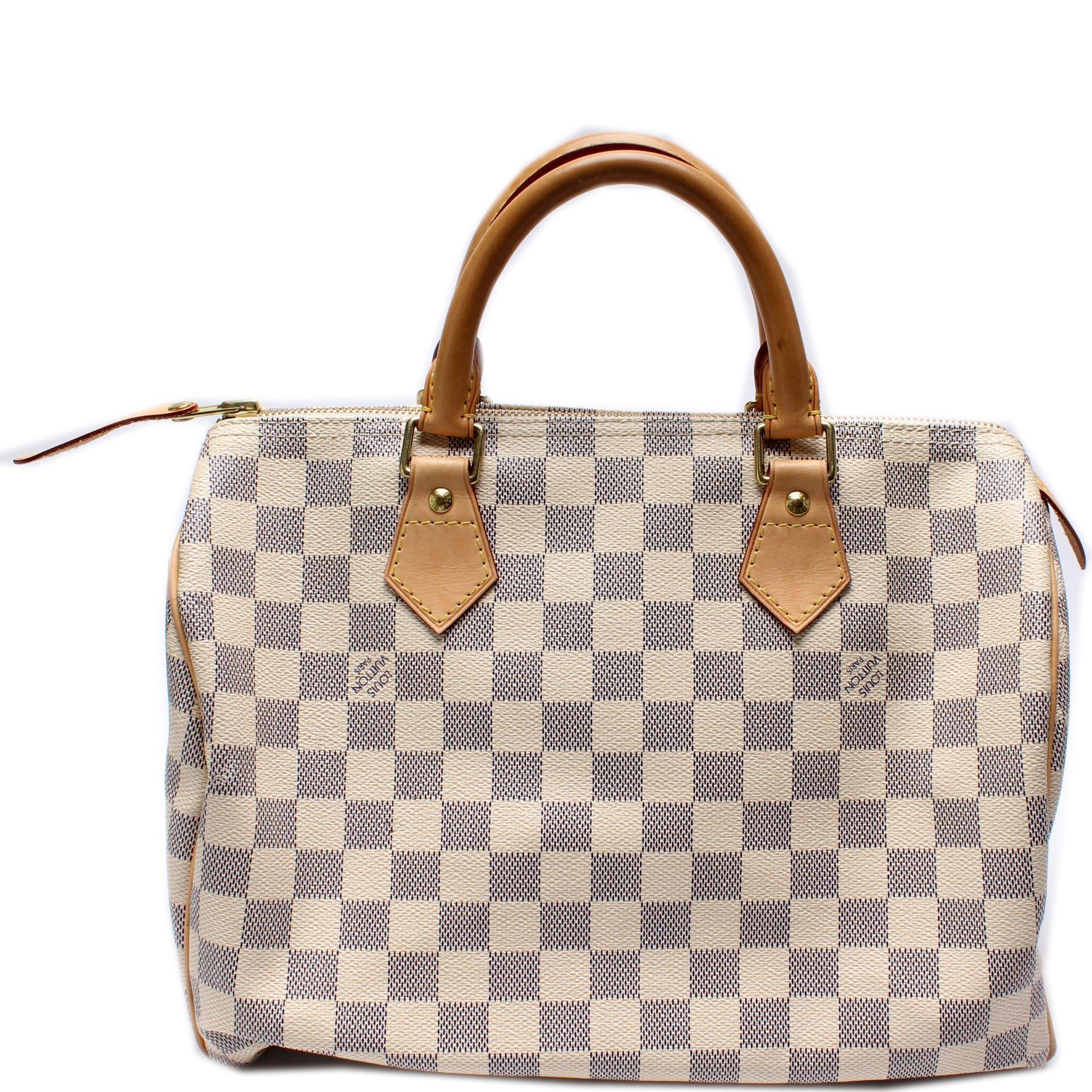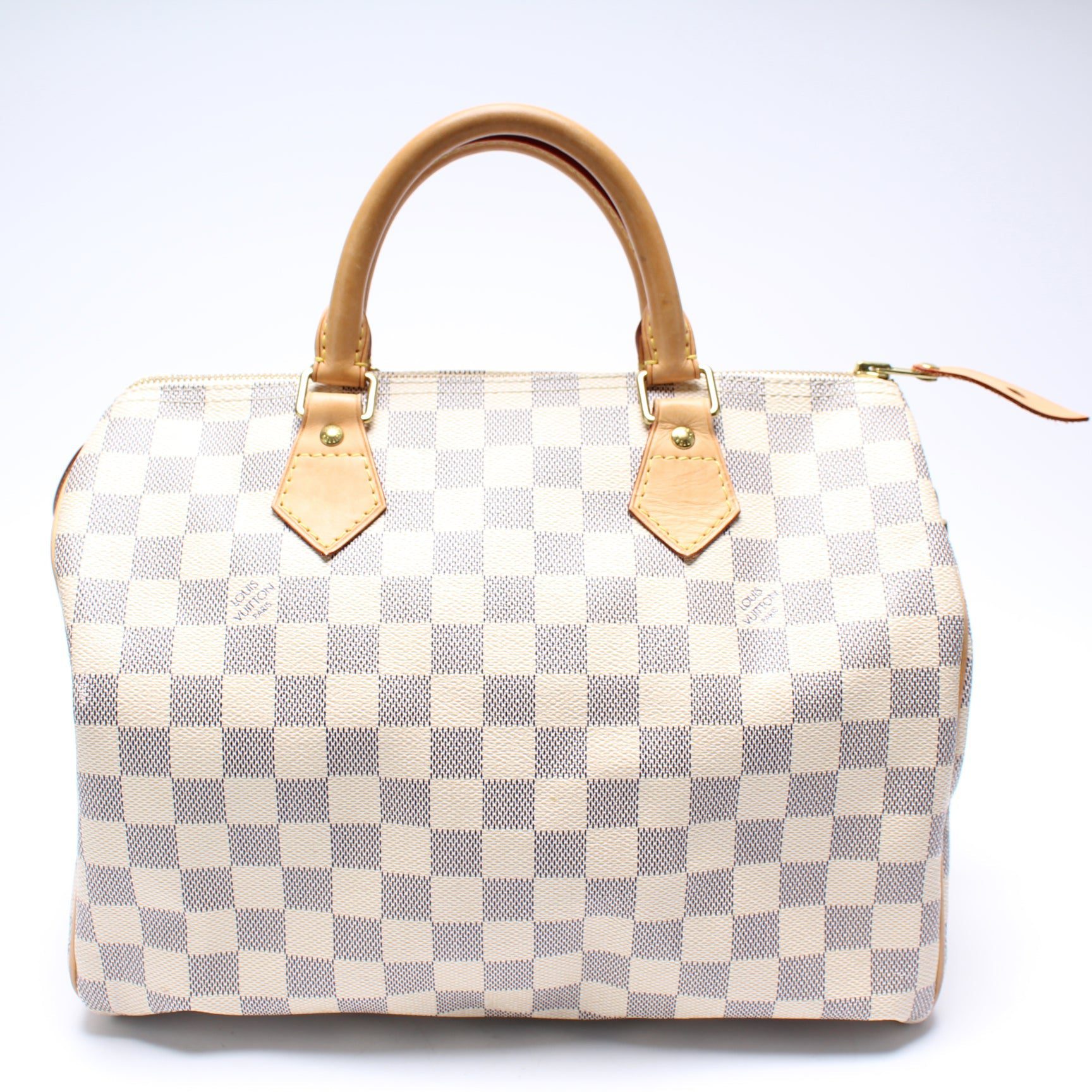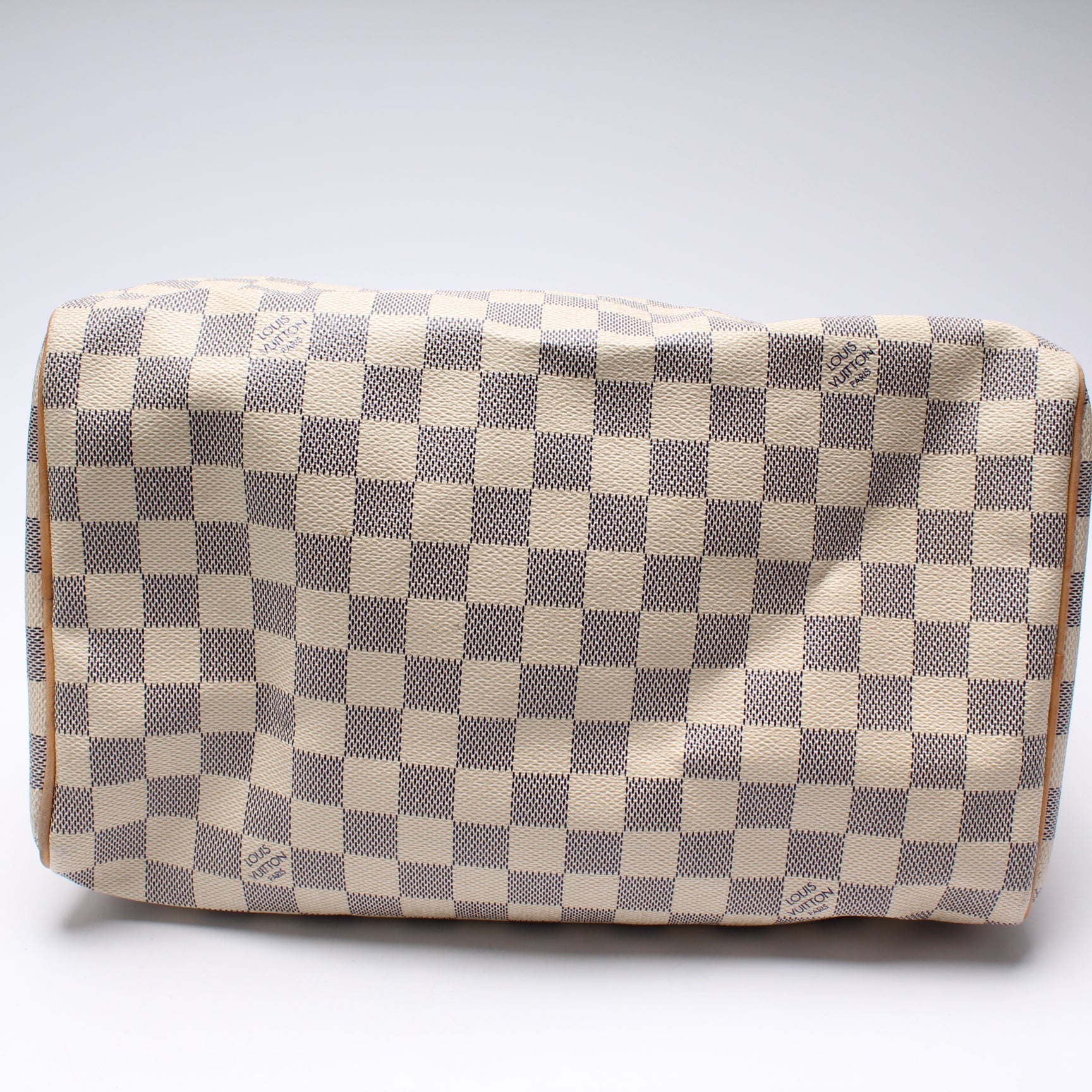 Louis Vuitton Speedy 30. The exterior is in the classic Damier Azur coated canvas. Â