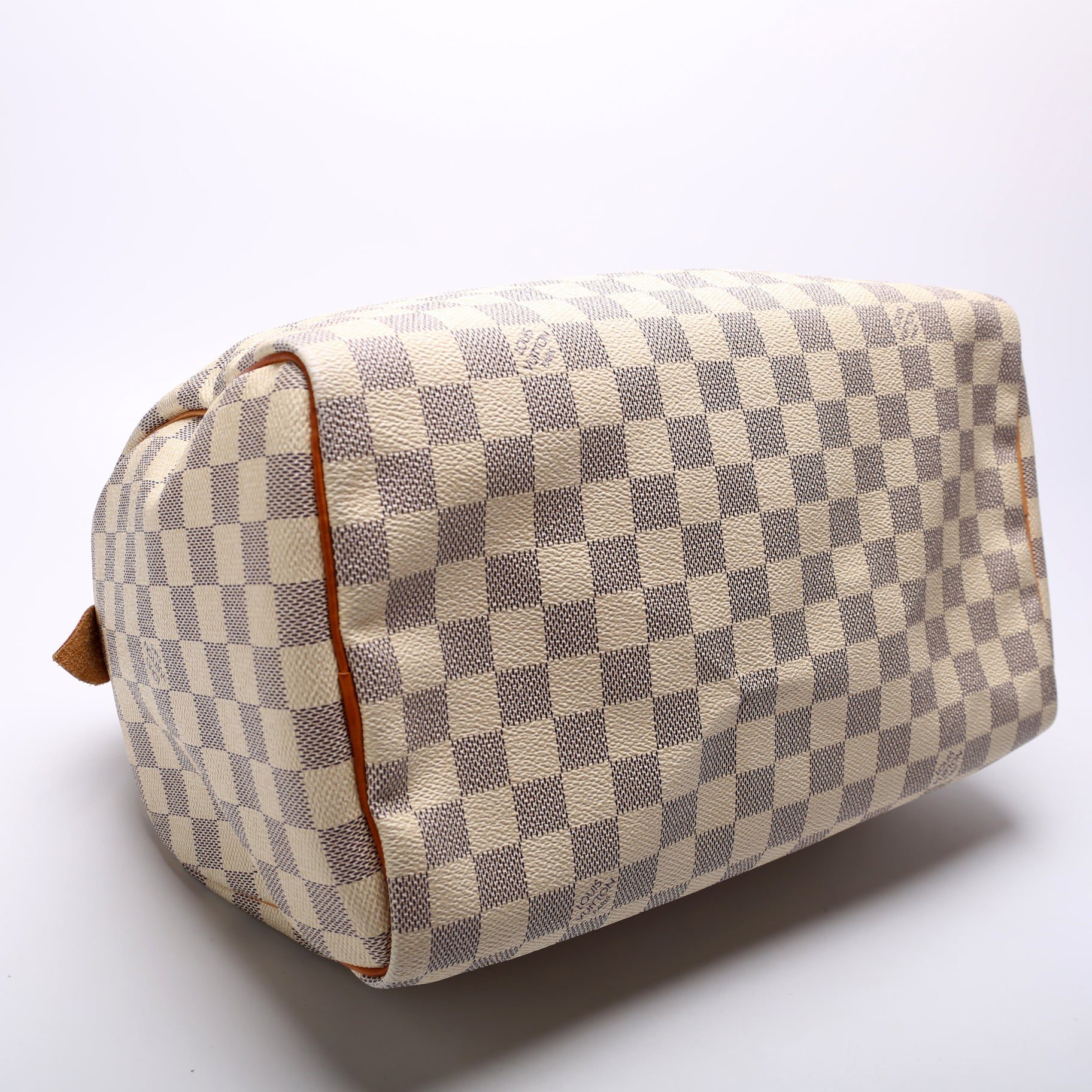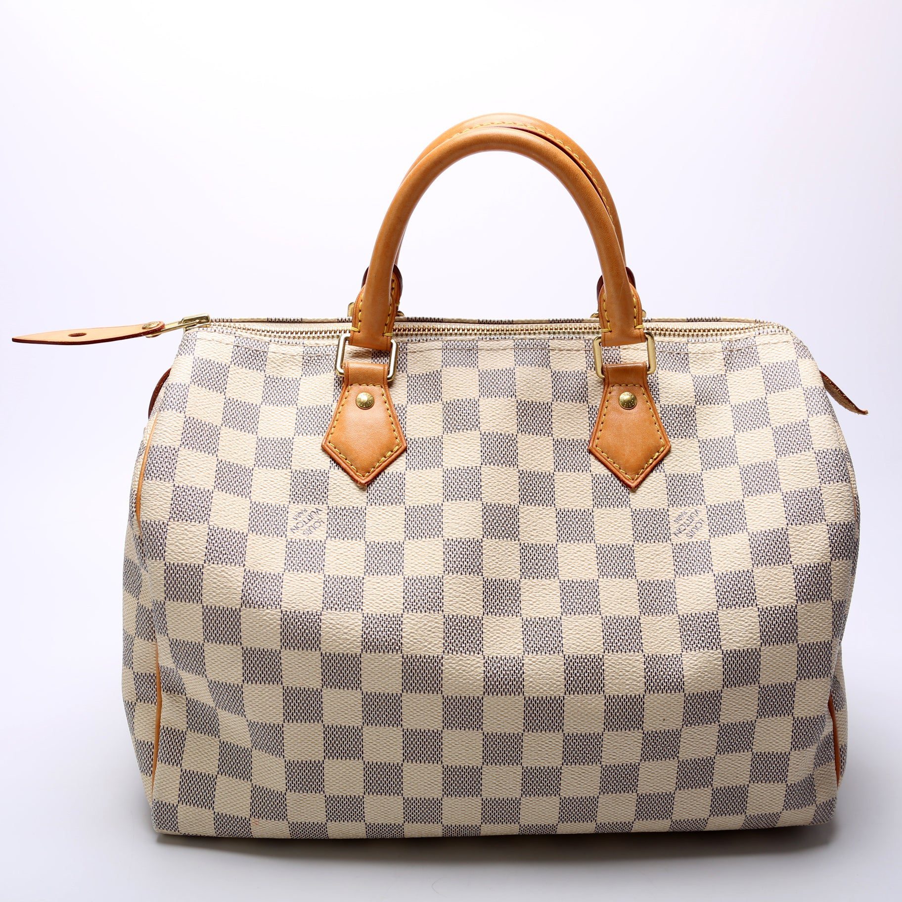 Louis Vuitton Speedy 30. The exterior is in the classic Louis Vuitton Damier Azur coated canvas.